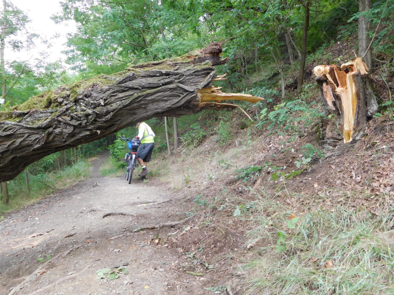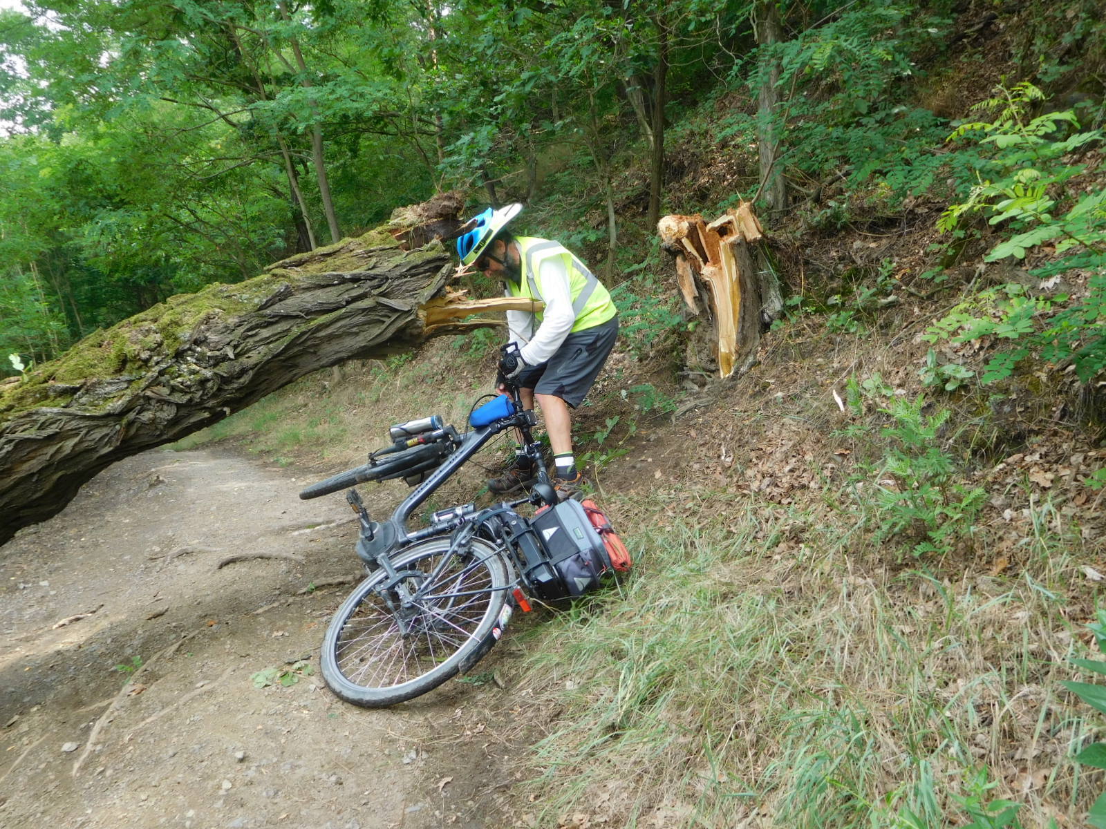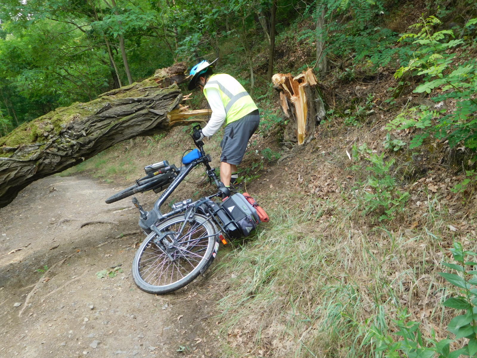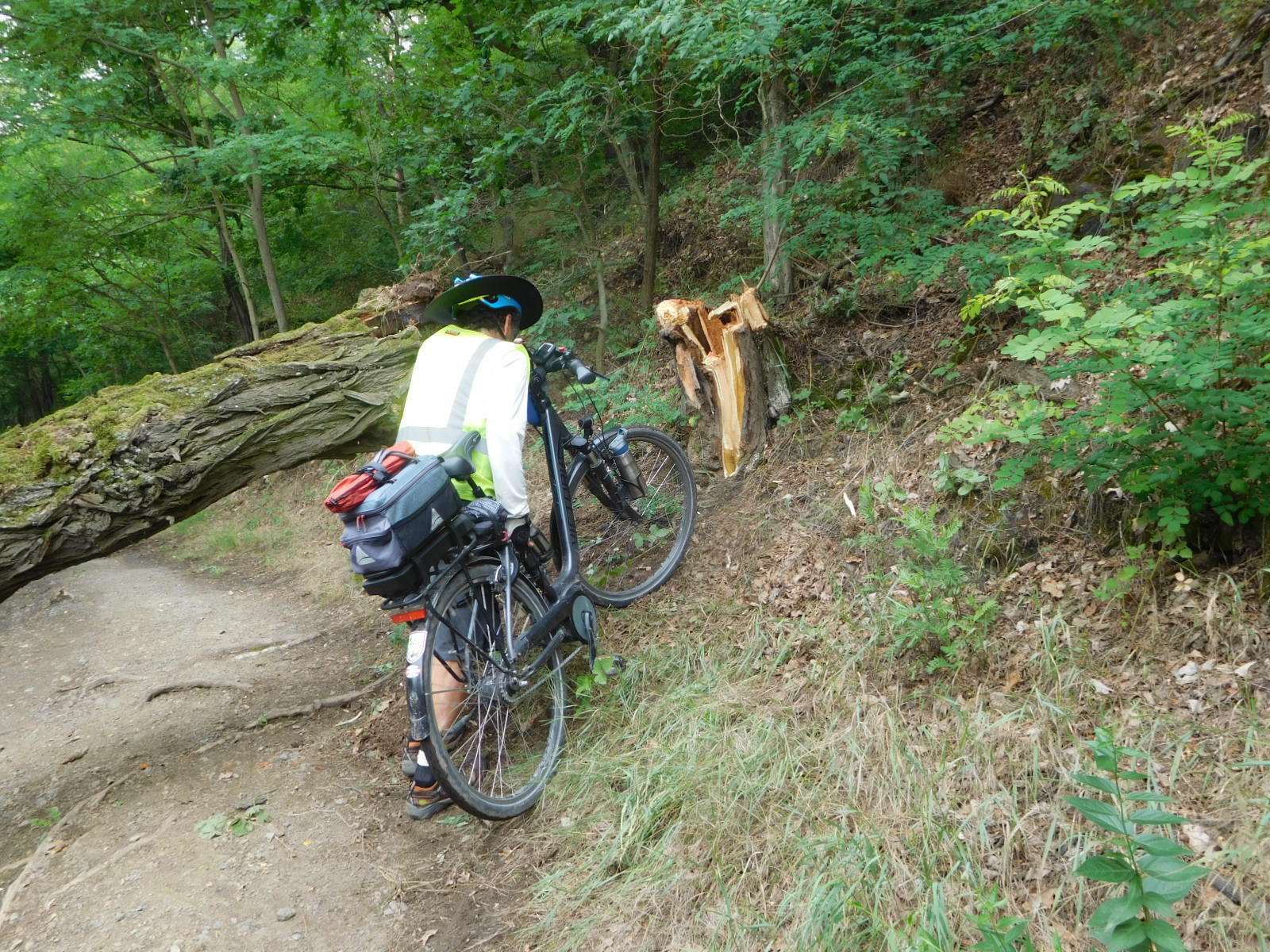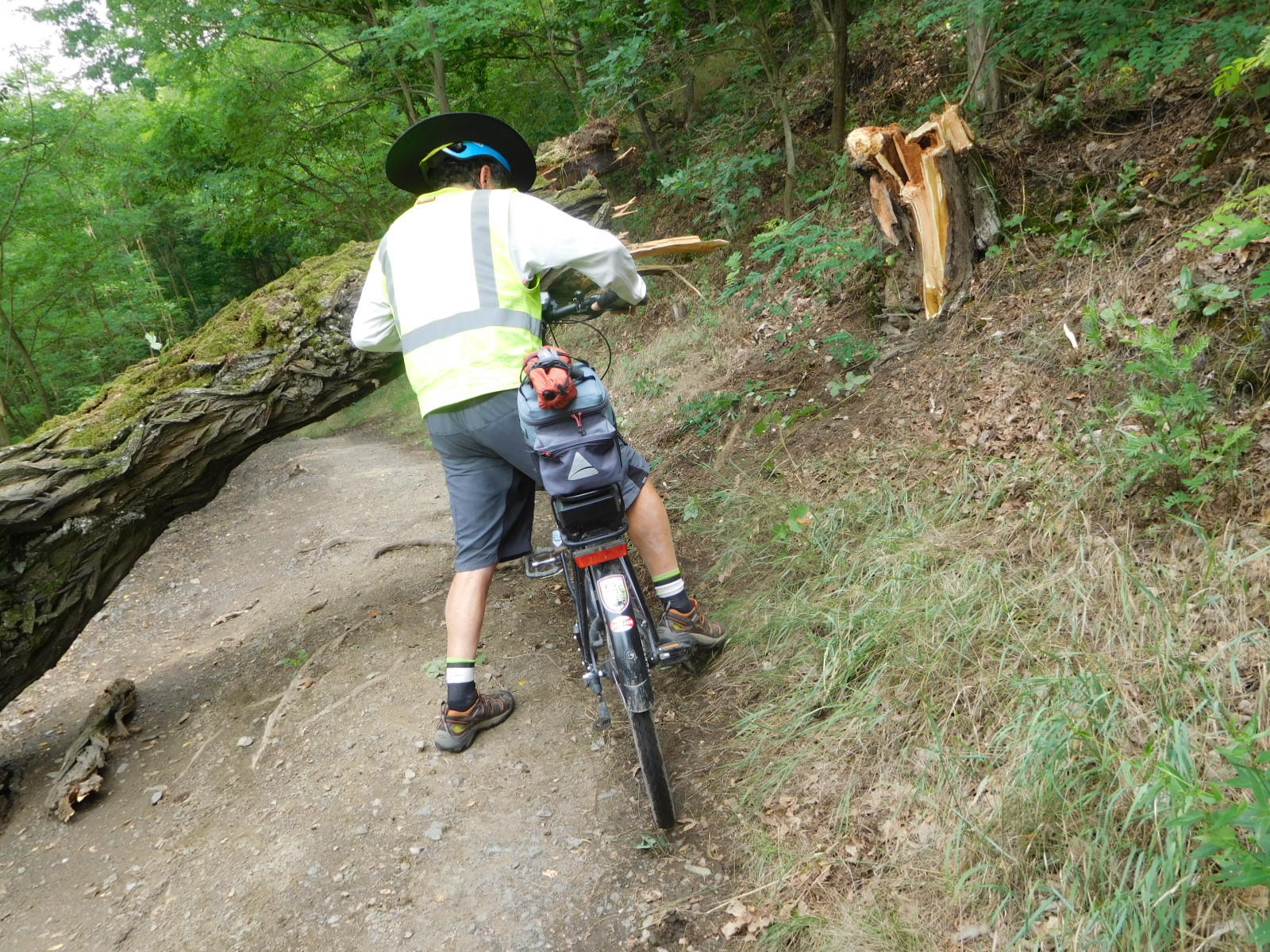 Things started to go south when we came to a point where the official path wanted us to head off into the hills. Dodie characteristically balked at this, seeing way to stick by the river. Only thing, the by the river way quickly became an unrideable footpath. Ok, then, we walked. We walked, that is, until we came to a tree fallen across the path.