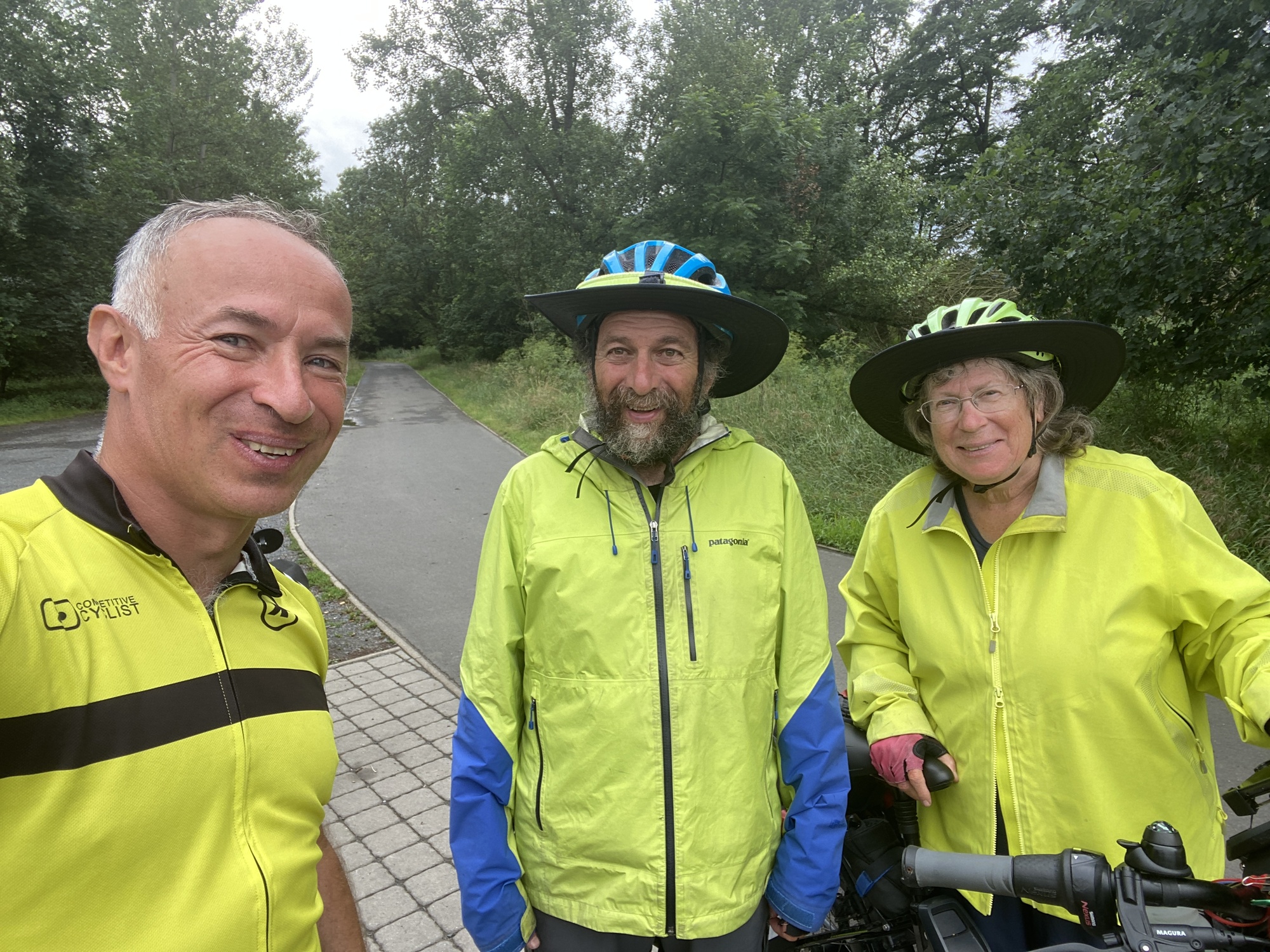 A cyclist was standing at the Elbe sign boards, and this turned out to be Alex, from Toronto! Alex had flown to Berlin and taken a train to Dresden where he rented a bike and continued by train to Prague. Now his ride was Prague to Dresden, same as us! Alex was amazed by our 80 day (so far) odyssey, and also by other trips we mentioned, such as across Canada. He asked a few of the Usual Questions, including what was our average speed. When I reported that as 11.5 kph, he clarified that he was asking about time riding, not total time goofing around. But yes, 11.5 is our riding speed. I hardly had the heart to tell him that that figure is from after we got electric assist!