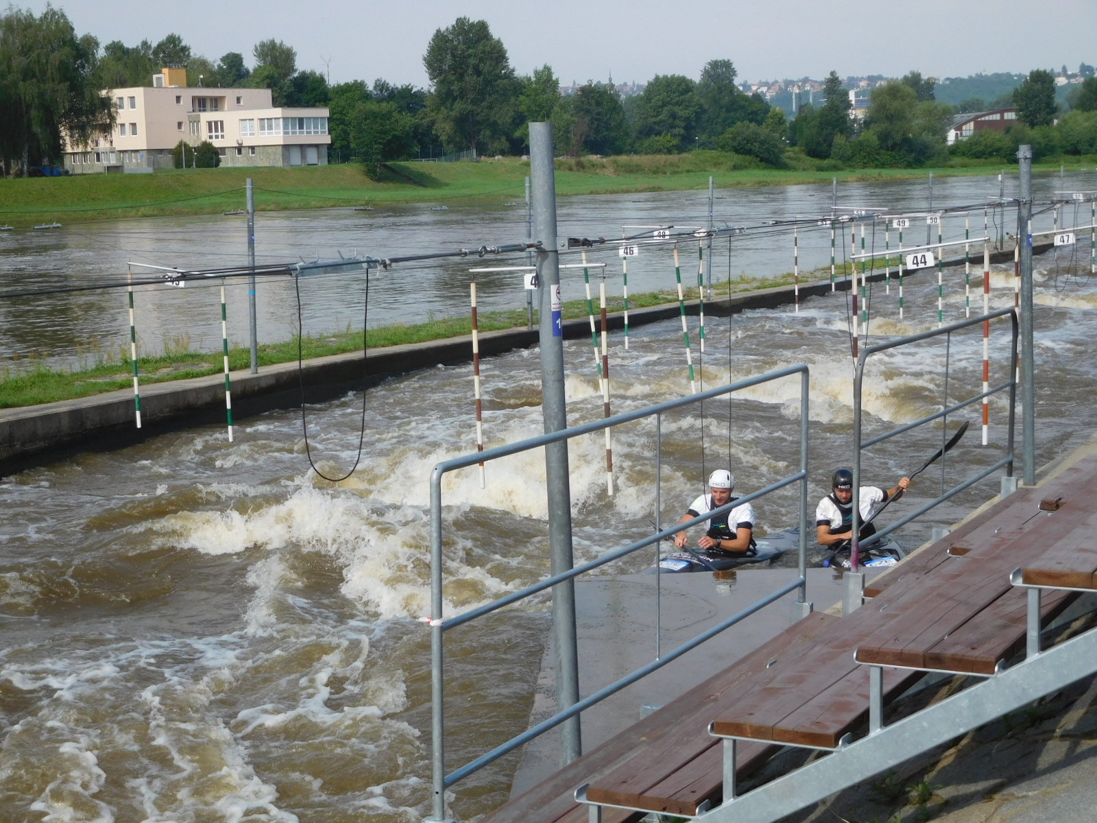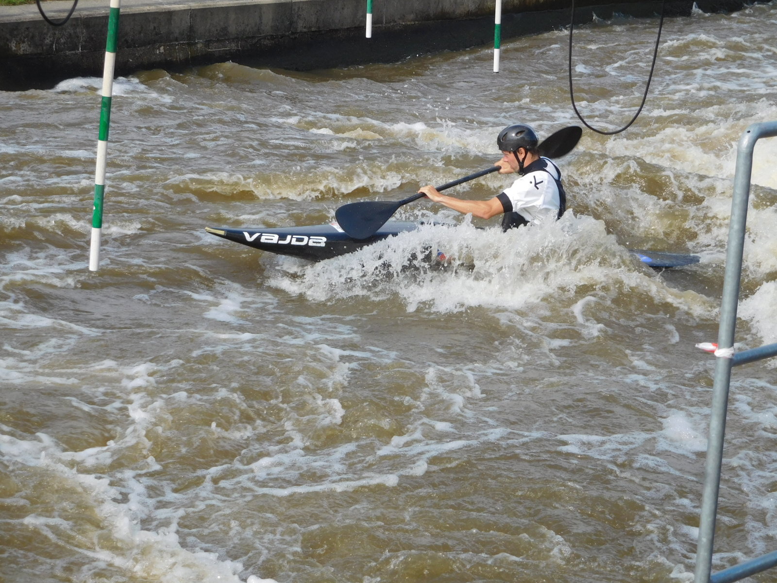 Finally back along the river, we encountered the first of two kayaking practice venues. We watched for a while, fascinated by how the kayakers take advantage of concrete breakwaters to easily move their boats back upstream. Then they zoom down, making sure their heads pass through the gates.