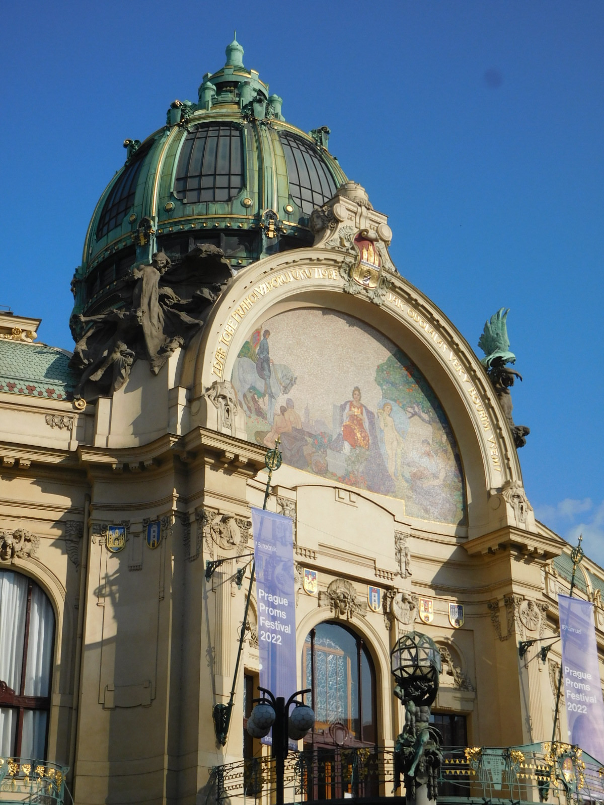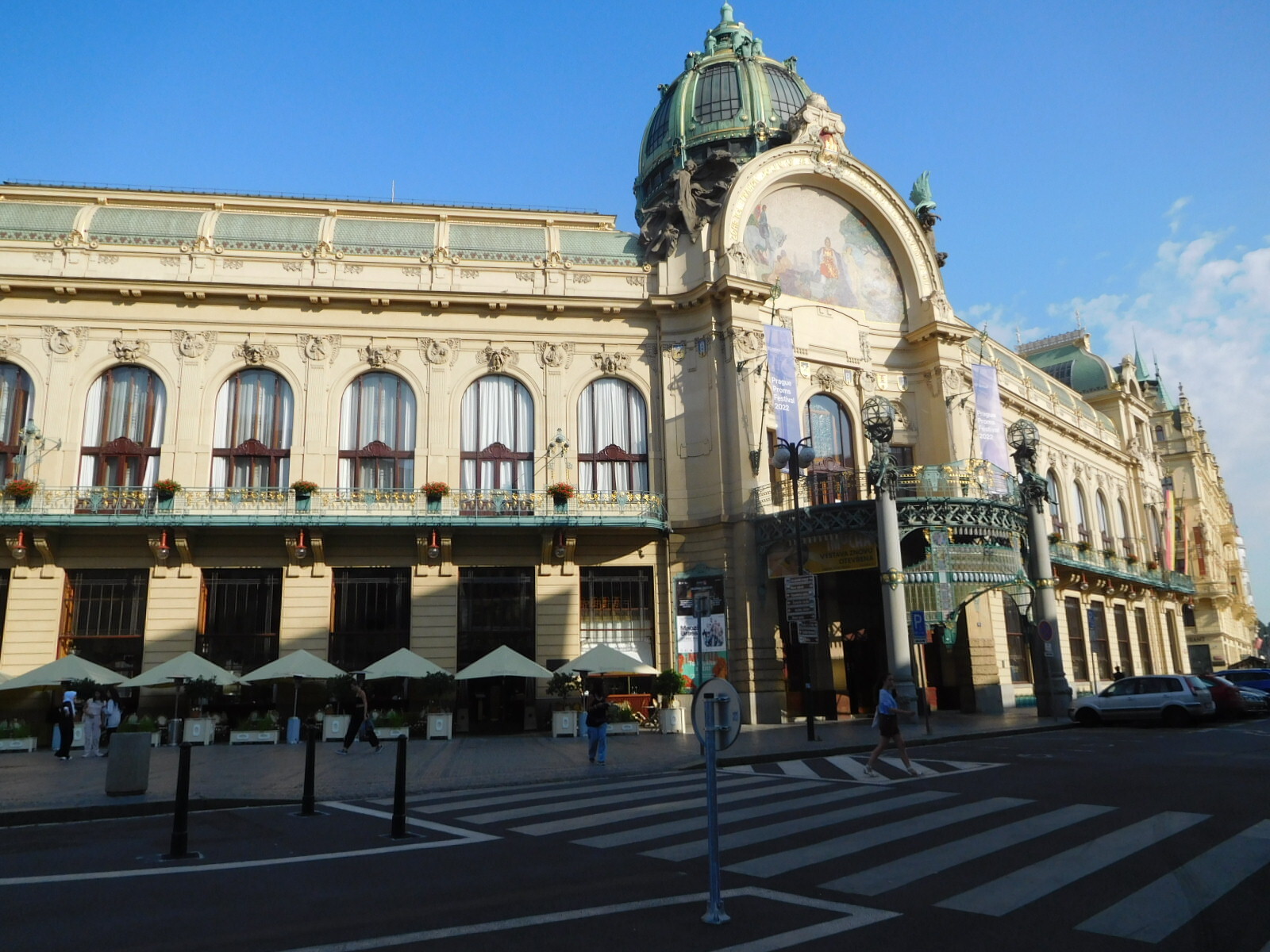 To make ur escape from Prague, we stayed away from, or walked, every street that the authorities had so helpfully designated for bikes, by painting the outline of a bike in the traffic lane. A side benefit of this strategy was that we stumbled on a building we had been looking for unsuccessfully yesterday. It's a theatre, with a beautiful exterior, and the "Powder Tower" standing beside it.