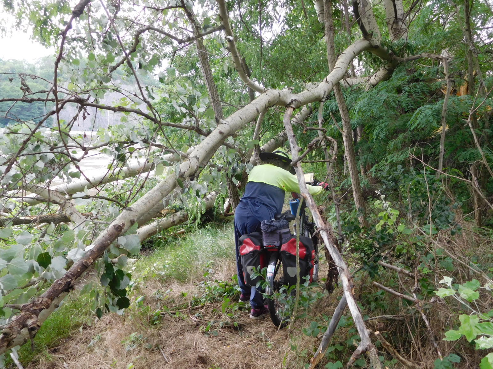 At first it looked like one could just pass under the tree, but no, it was too low. So we took all the packs off, and dragged the bikes kicking and screaming underneath. (The bikes also were not happy about it!)