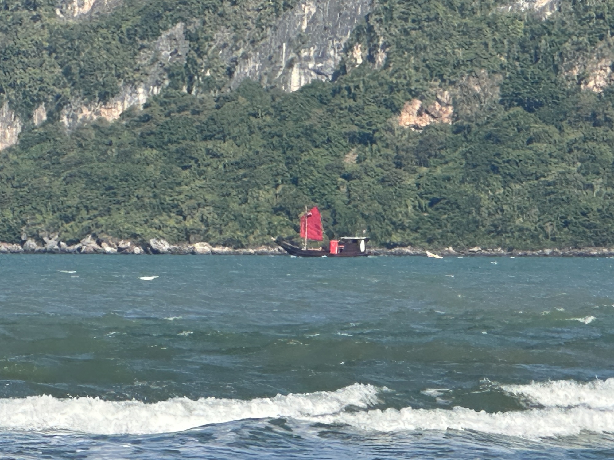 The next surprise around the corner was a tiny national park, protecting a headland of tall limestone cliffs, laced with water and wind-carved caves and arches. Beneath the cliffs was a beach with fine sand like powdered sugar, shallow calm water, and many happy families splashing about. It was very tempting to dig out the bathing suits then and there, but we soldiered on.