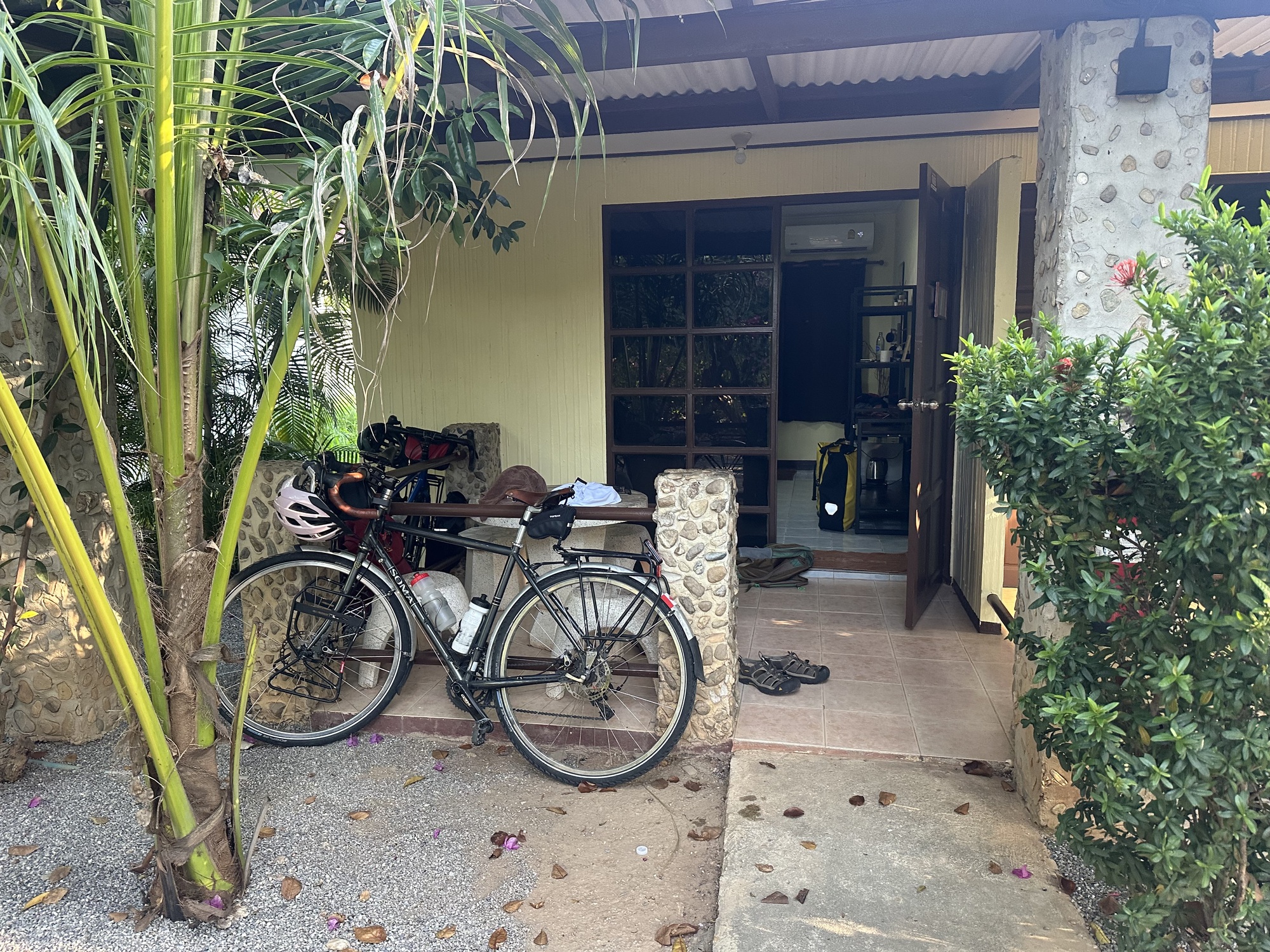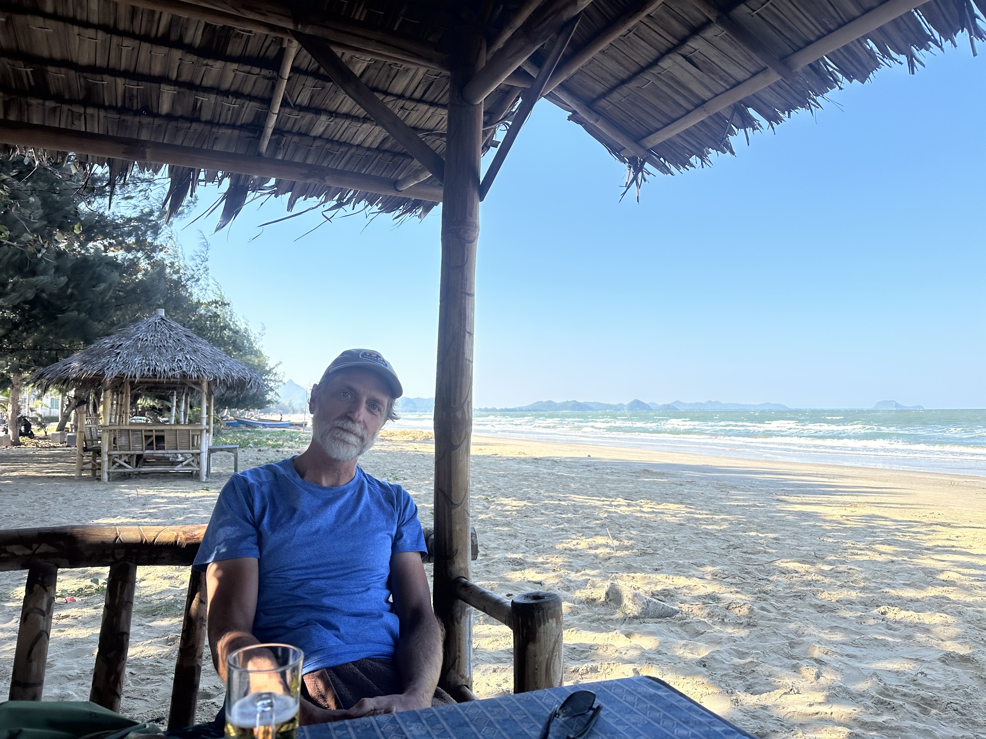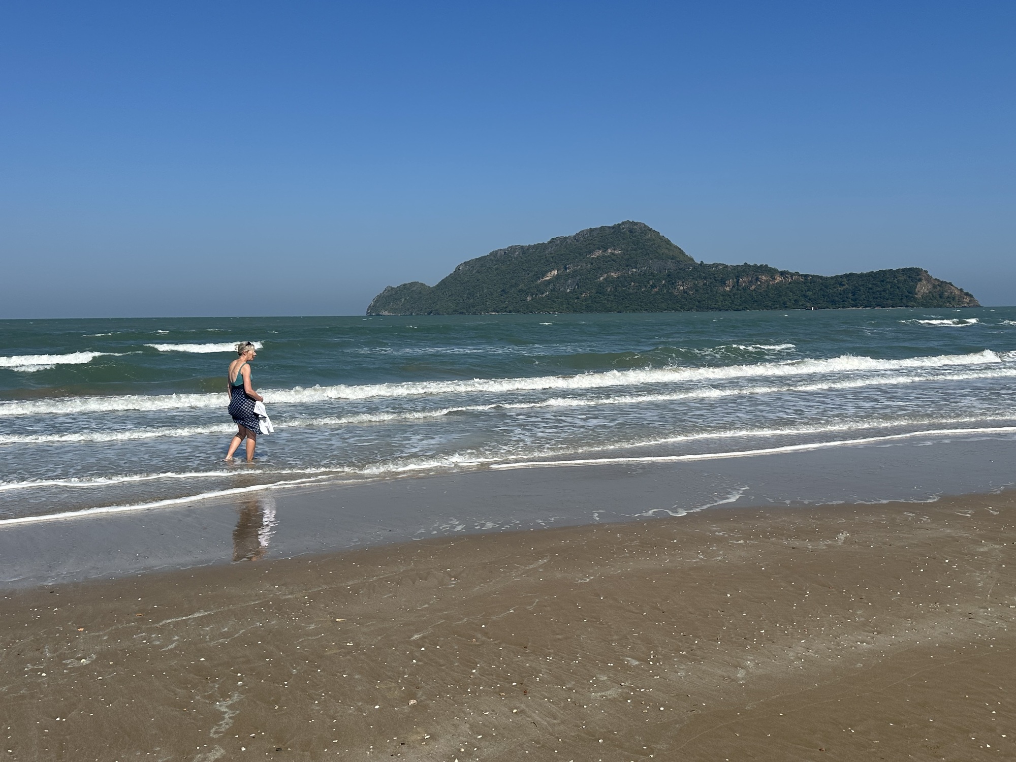 We pulled into our guesthouse at 2 o’clock, after what, to our heat-addled brains, felt like an endless hunt up and down the beach road at Sam Roi Yot but was actually probably less than 10 minutes. The Blue Beach Resort was off the beach, up a little laneway and very discreetly signed — but we found it, our bungalow had air conditioning, there was a small pool that we immediately plunged into, and a porch for our bikes. In other words, perfect! There was also a long magnificent beach across the road….