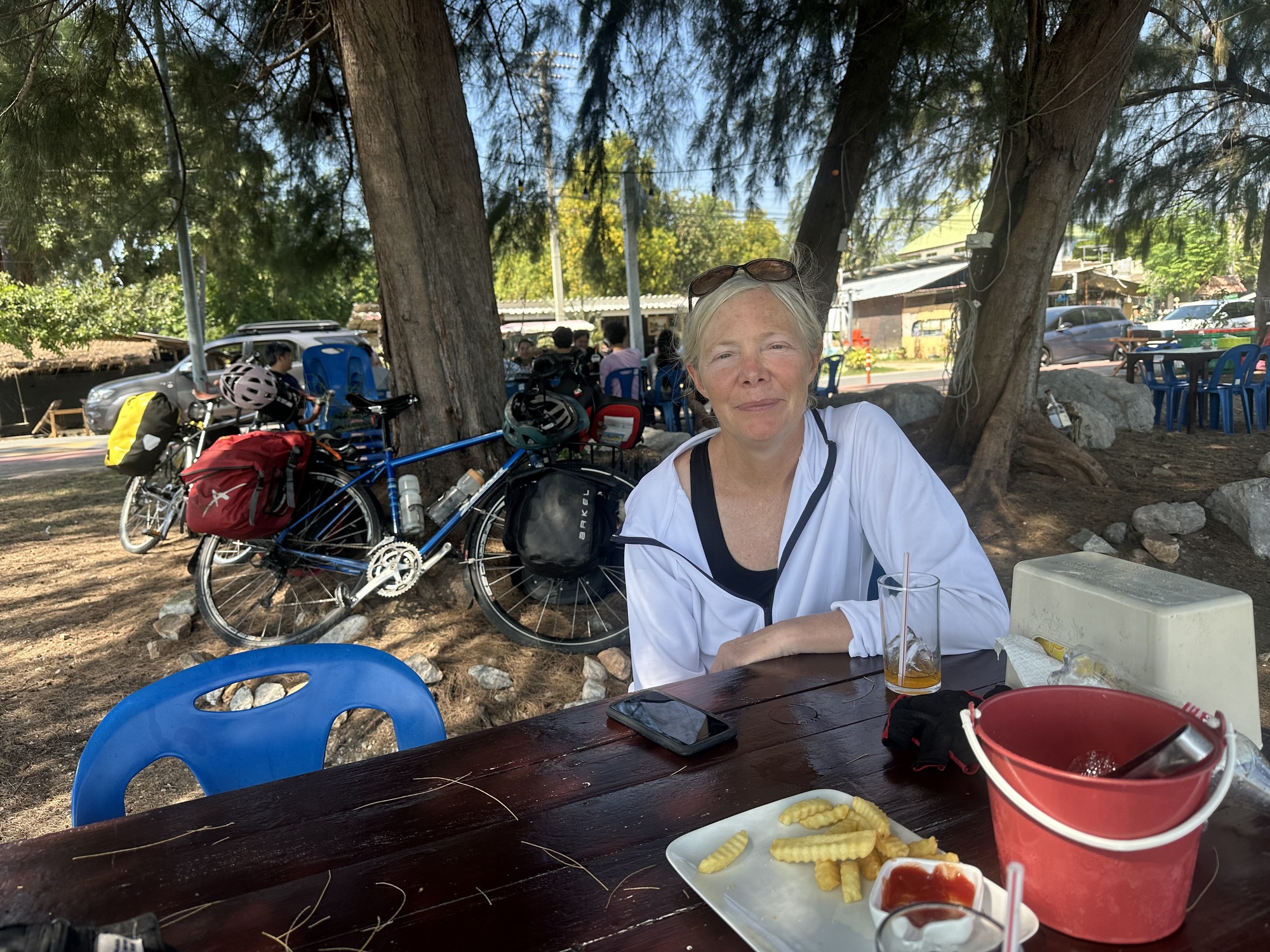 But even easy cycling is still work, and I was definitely feeling the heat. Here is where Heat Management Strategy #2 came in: more frequent breaks. We are too inclined to just keep going, to push on, even when we’re sweaty and tired and thirsty. In this climate that’s a dangerous tendency and we’d agreed to try to mend our ways. So when our route took us to a beachside road lined with little restaurants, it was time for a drink in the shade.