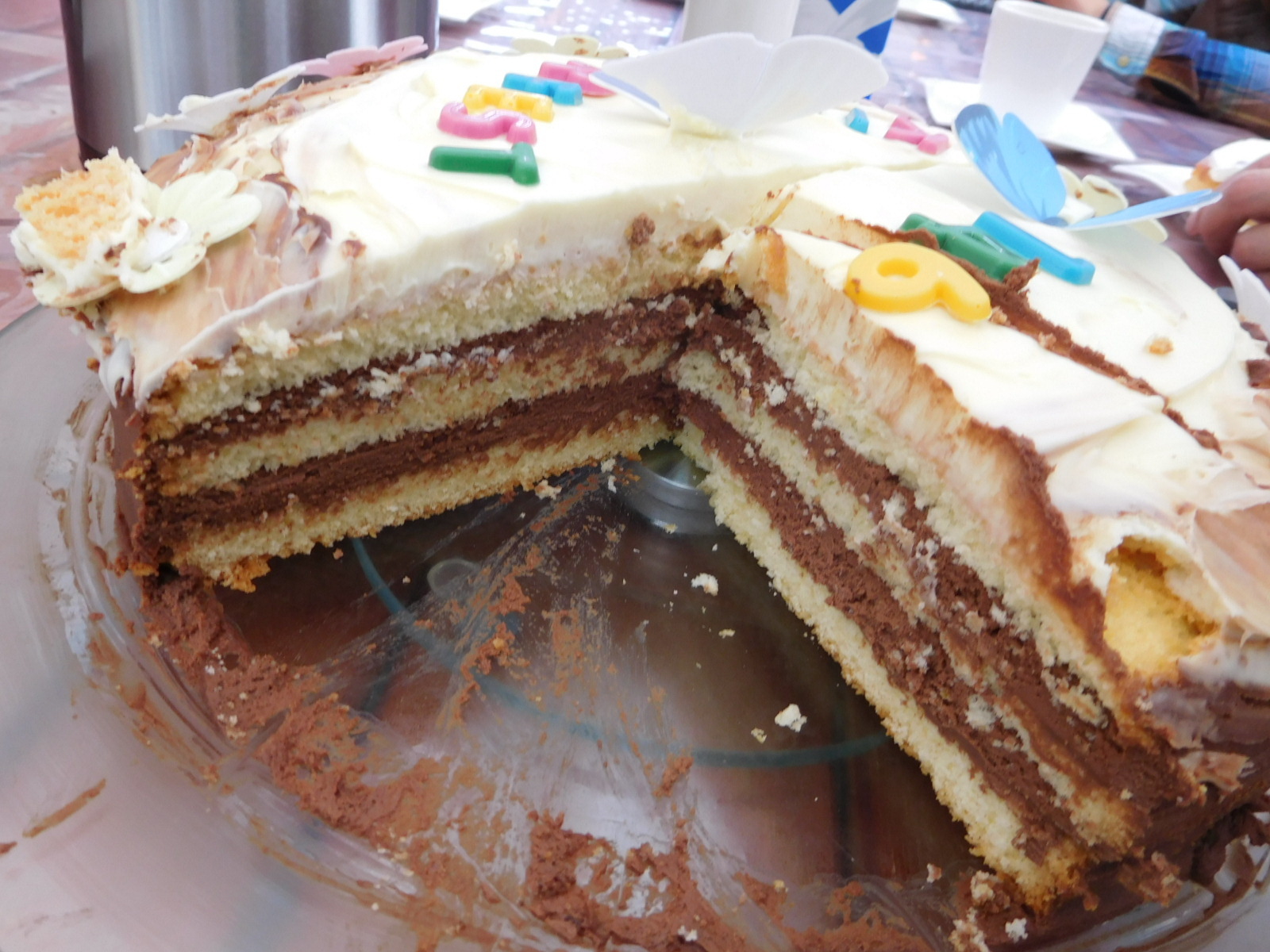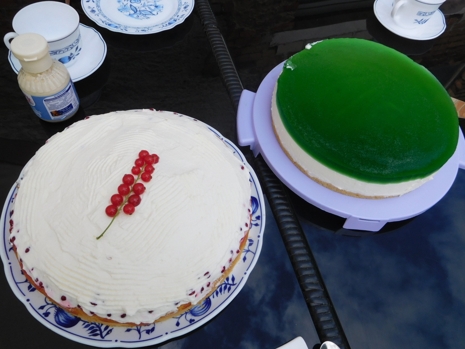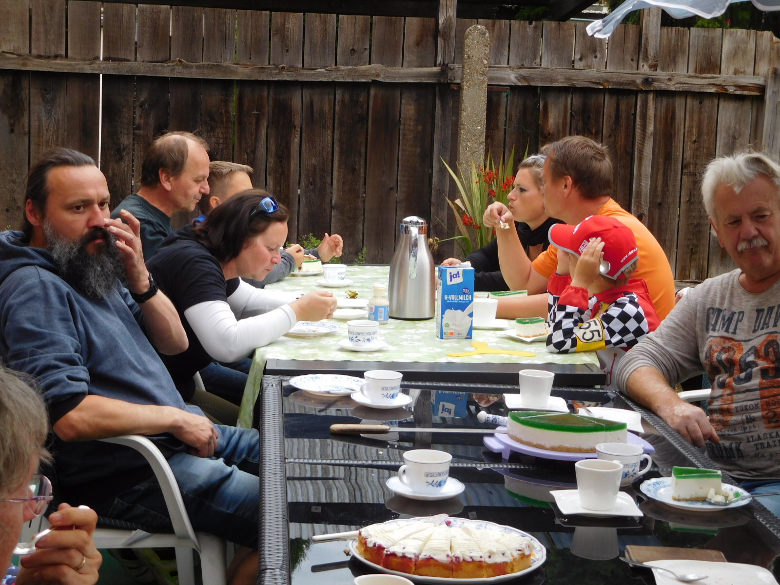 Our last thing for the day was to assemble at Birgit's family compound for coffee time. Birgit's family is an admirable conglomerate of four family generations, all living on a walled property in the centre of town. They have various buildings, centred around the original family bakery business, and have created a mini paradise of gardens, farm animals, pools, and outdoor shelters. This family of bakers always comes up with a variety of creations at these times. Here is what we saw of that today: