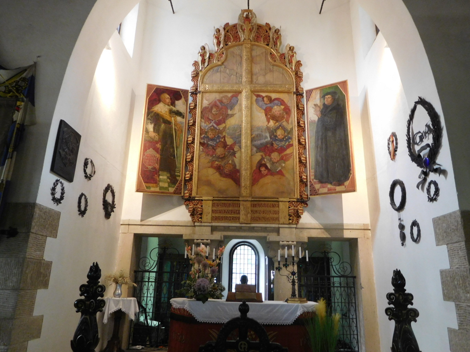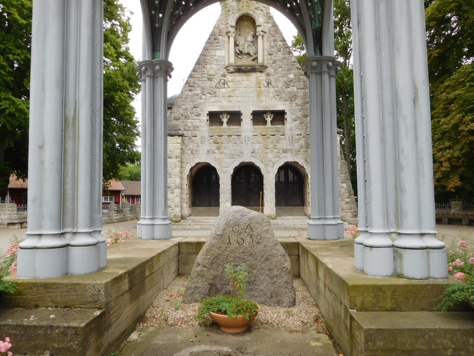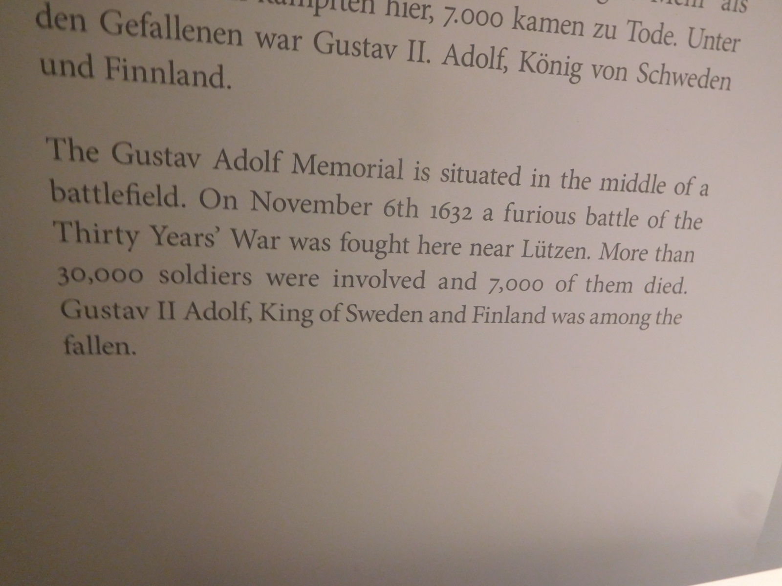 Well ok, one might write that off as a single event in an eventful war, and century of war. But no. First off, about 10,000 were killed, and ended up in mass graves near the battle field. Second, having a Swedish king killed down here was a big deal for the Swedes and for Protestants in general. The body was brought back to Stockholm, but a memorial rock remained at the site. The rock was later replaced by a memorial iron structure, which was maintained by a Swedish soldier stationed for the purpose. From there the story gets more and more convoluted. A restaurant was built beside he iron memorial, to accomodate the many Swedish/Protestant visitors. A Swedish wood cottage was built to act as a museum, by Swedish carpenters. This was later twinned. Then in the early 1900's concern that the iron memorial was taking a lot of maintenance, led a private philanthropist to have a church built in memory of Gustav, on the site. Later, the restaurant (which of course included a beer garden) was deemed to crass to be nearby, and it was moved 1/2 block away. Archeologists and museum artists got in on the act, and artifacts of the battle were unearthed and displayed. Dignitaries from Sweden and elsewhere attended opening ceremonies for things like the church on the site. A Society was formed, that even today has secured funding and is 1/2 way through building yet another museum building. Meanwhile 2 km away in Lutzen proper, the town castle is devoted to even more museum craft about the whole thing.