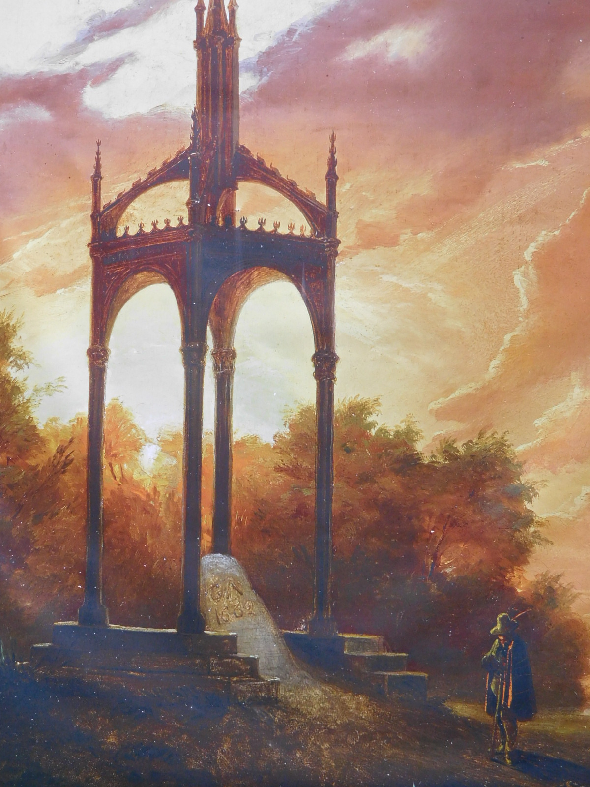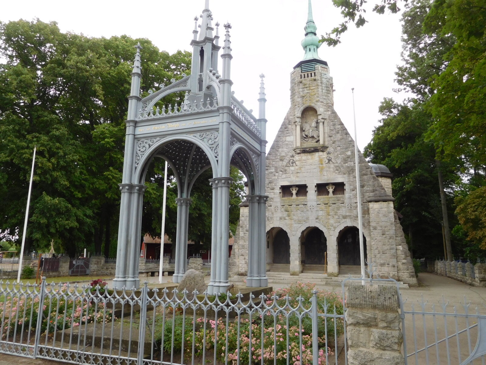 This shot has a lot: the memorial rock, the iron memorial, and the church