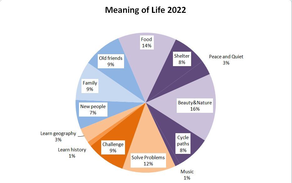 We started with the idea that the Meaning of Life or the Reason for Living would be the thing or things that have you getting up each morning. If we are depressed or despondent, we might have forgotten what these things are, or we might know what they are but somehow can not reach them given where we are or what we are currently doing. The hope is that in Cycle Touring we can not only remember or learn why life is great, but also reach with the bike the things that make it so.