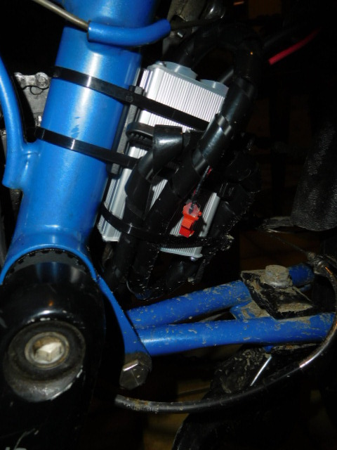The motor controller is a little box that holds a central position among the motor, the batteries, and the console. Basically it takes its orders from the console, sucks power from the batteries, and sends the package to the motor for action. Ours is strapped on the seat tube way down by the cranks, with lots of wires going in and out. On those slick ready made centre drive ebikes, the controller is built into the motor housing so you never see or have to think about it.