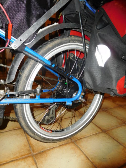 The motor - in general a motor can be placed in the rear wheel, the front wheel, or midships at the crank. Most high end/European bikes have a mid motor. But because of the way a Bike Friday folds, we did not want to monkey with the area under the cranks. We then chose to put the motor in the rear, because this would make it easy to route the various electric cables. Together with rear panniers, this does make the bike back end heavy. At least for my bike, then, we are keeping panniers on the front as well.