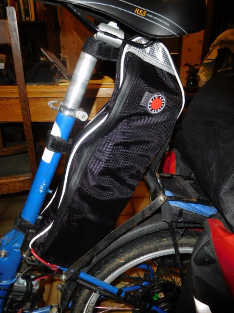 The prime place to put lots of batteries on a Bike Friday is behind the seat post. We have two decks of three batteries on each bike, with the decks stacked end to end. As it happens a bikepacking frame bag from Banjo Brothers is just the right size to hold them. Compared to standard ebikes, it's a bug though, because the Banjo bag hangs on with 6 velcro straps that take time to undo. It's really designed to hang under a diamond frame.