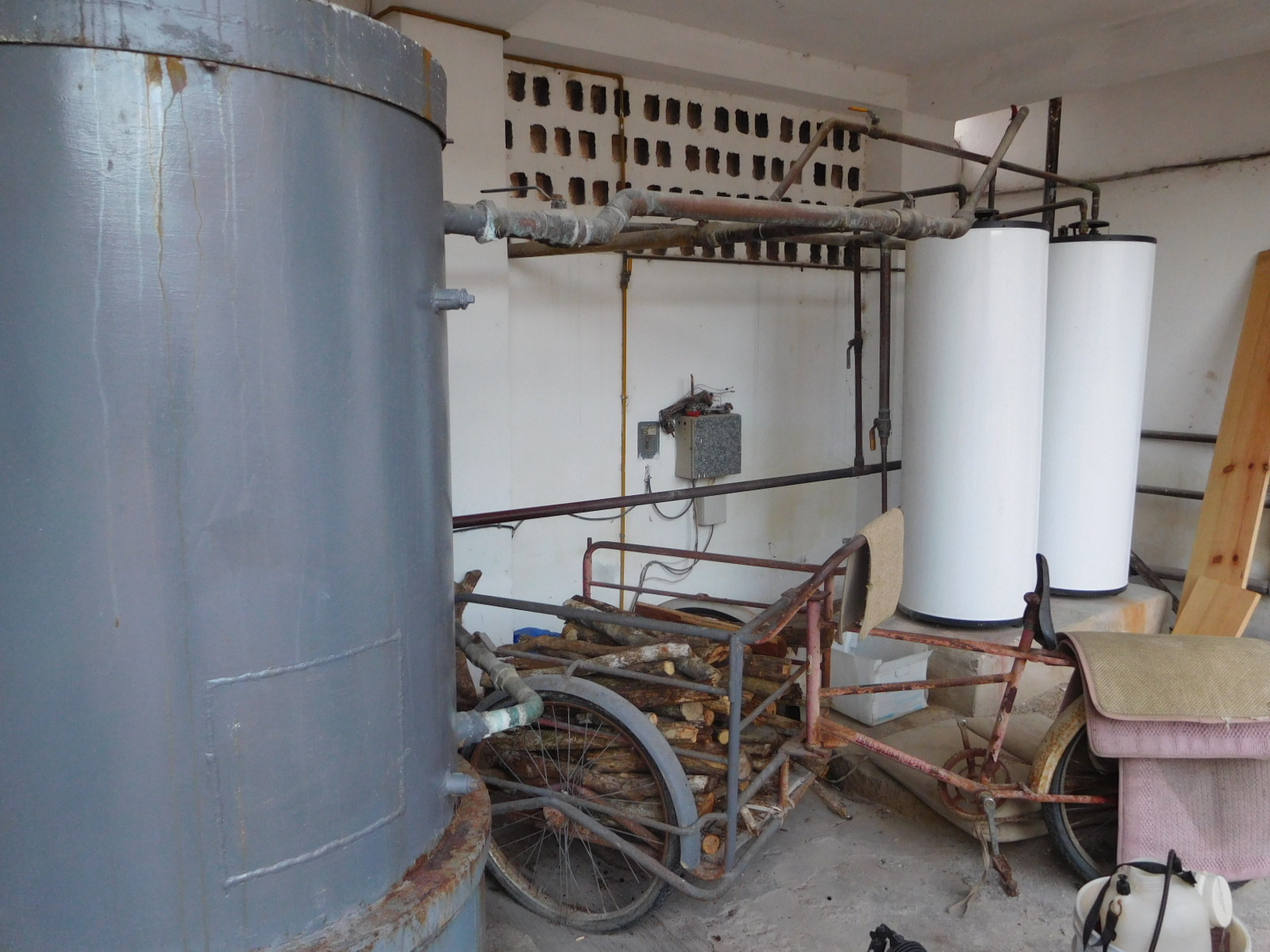 Temperatures were moderate today, and with a night's rest and good breakfast, the world looked wonderful today. This even applied to a pesky problem, which is that for some reason we were put in clearly the worst room in the hotel. It's at the back, right by the parking lot door. And on the other side of our wall is a utility area that includes hot water heating and with a pump that runs continually, vibrating the wall. The silver lining of this is that we could observe that the hot water is actually heated with wood, possibly macheted at the roadside and brought in by cargo bike. We watched the wood man stoking the burner for a while. Naturally he was very sweet.