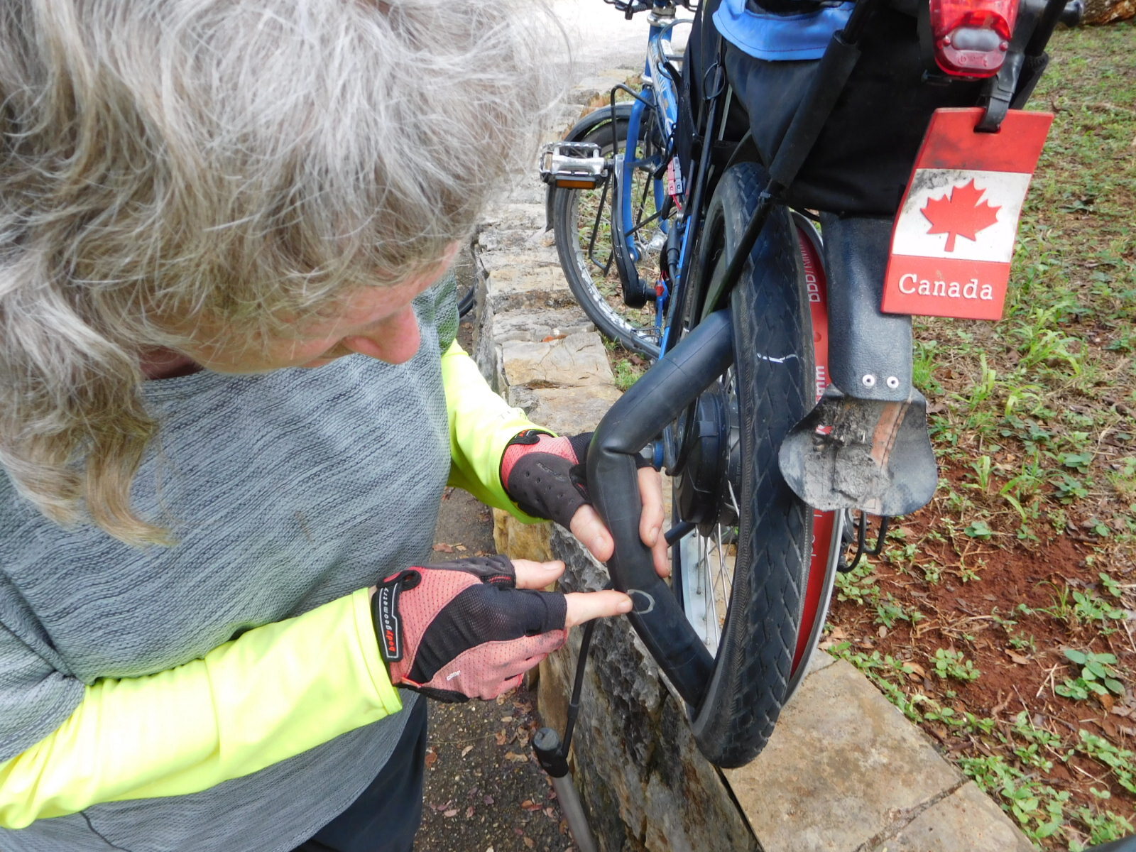 Although I claimed it was only a 1 in 100 chance, Dodie wanted to try spotting the leak without fully removing the tube (and with leaving the wheel in place). First step, of course, is to break the bead and pull the tube partially out. So I grabbed my three plastic tires levers, and ... crap! In putting our Bike Fridays back in service I had not really looked at what tires were on there. It turns out mine were the Schwalbe 20x1.5's. These are notorious for going on tight. The plastic levers threatened to break, and the tire was not moving. Fortunately I also had one, one!, quality metal lever. I was struggling with this when a fellow came along and asked in Spanish what our problem was. "La ponchadura" we chirped, drawing on the custom bike related phrase book prepared for us by our Spanish expert Joni. The man - a tour guide - was prepared to help, but fortunately I did get the darn thing off.