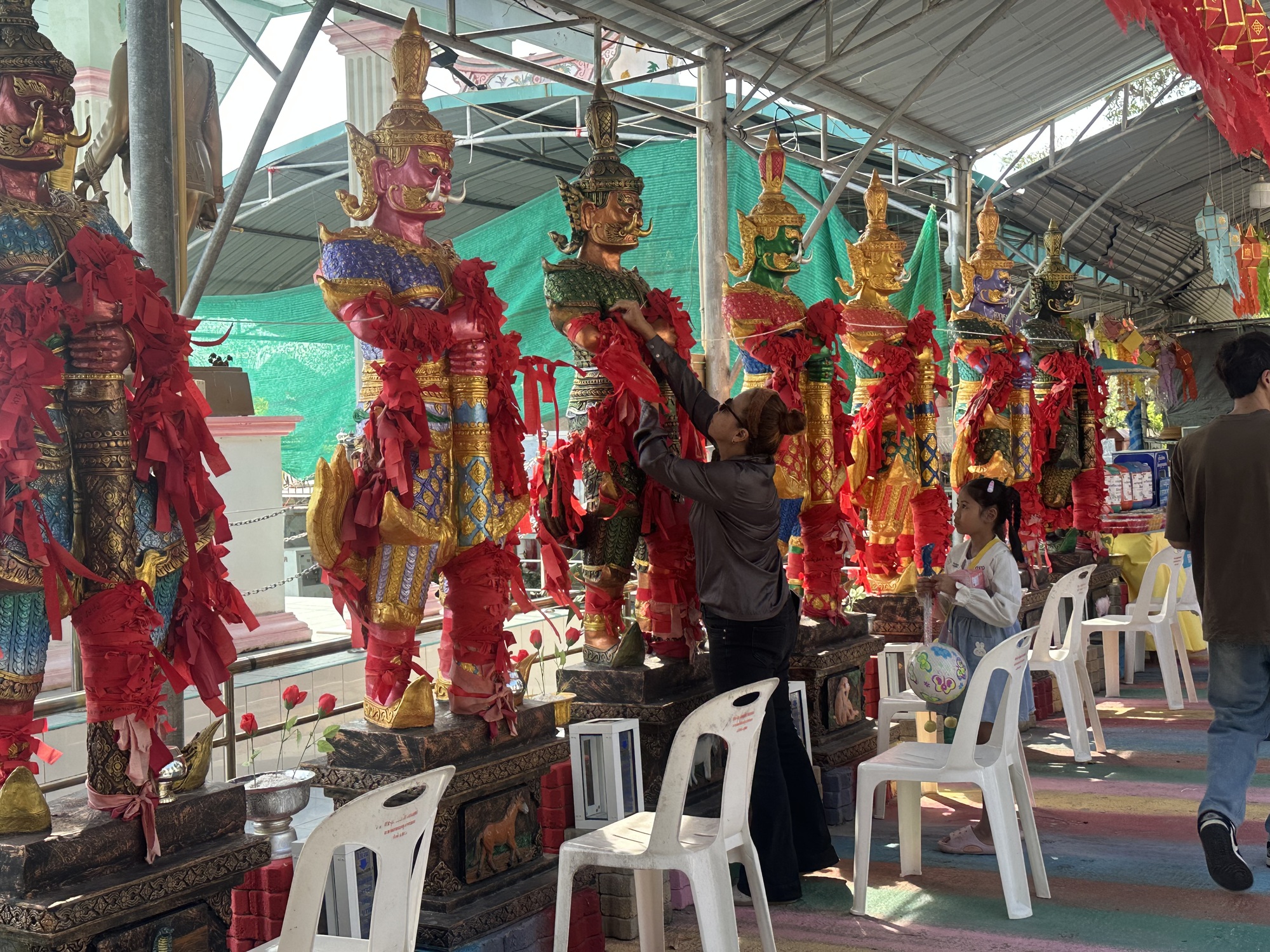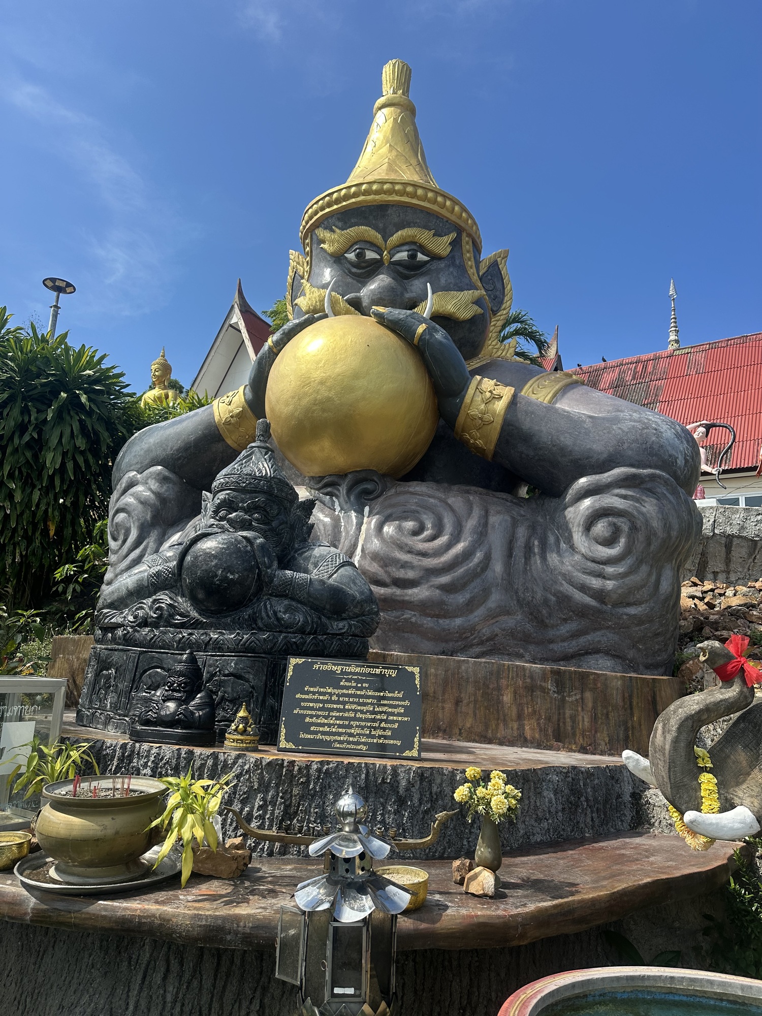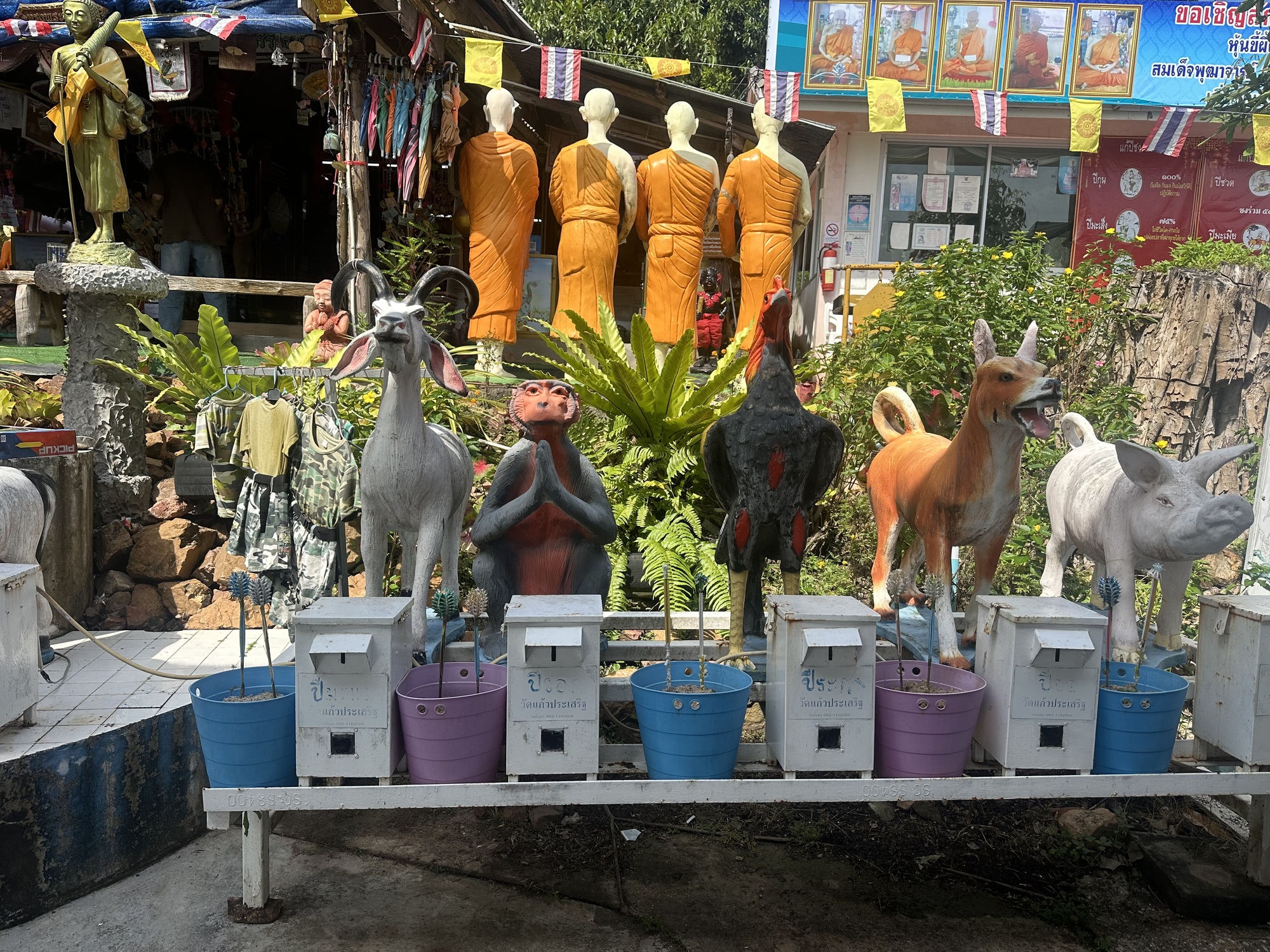 Once done with the view (we didn’t linger, the viewpoint was south facing and covered in enamel tile, you could have grilled a steak out there), we started to explore the rest of the wat, which was instantly overwhelming.  Just a jammed together hodgepodge of the sacred and the cheesy — shrines and altars with crazy gaily painted concrete statues, from demons to garden gnomes.  As it was Sunday, worshipers/funseekers (?) were heading in, praying and plunking Baht into donation boxes.  Below are a bunch of photos. After a while I kind of gave up with the photos, as the heat and the noise and the bizarreness gradually disconnected my brain stem.