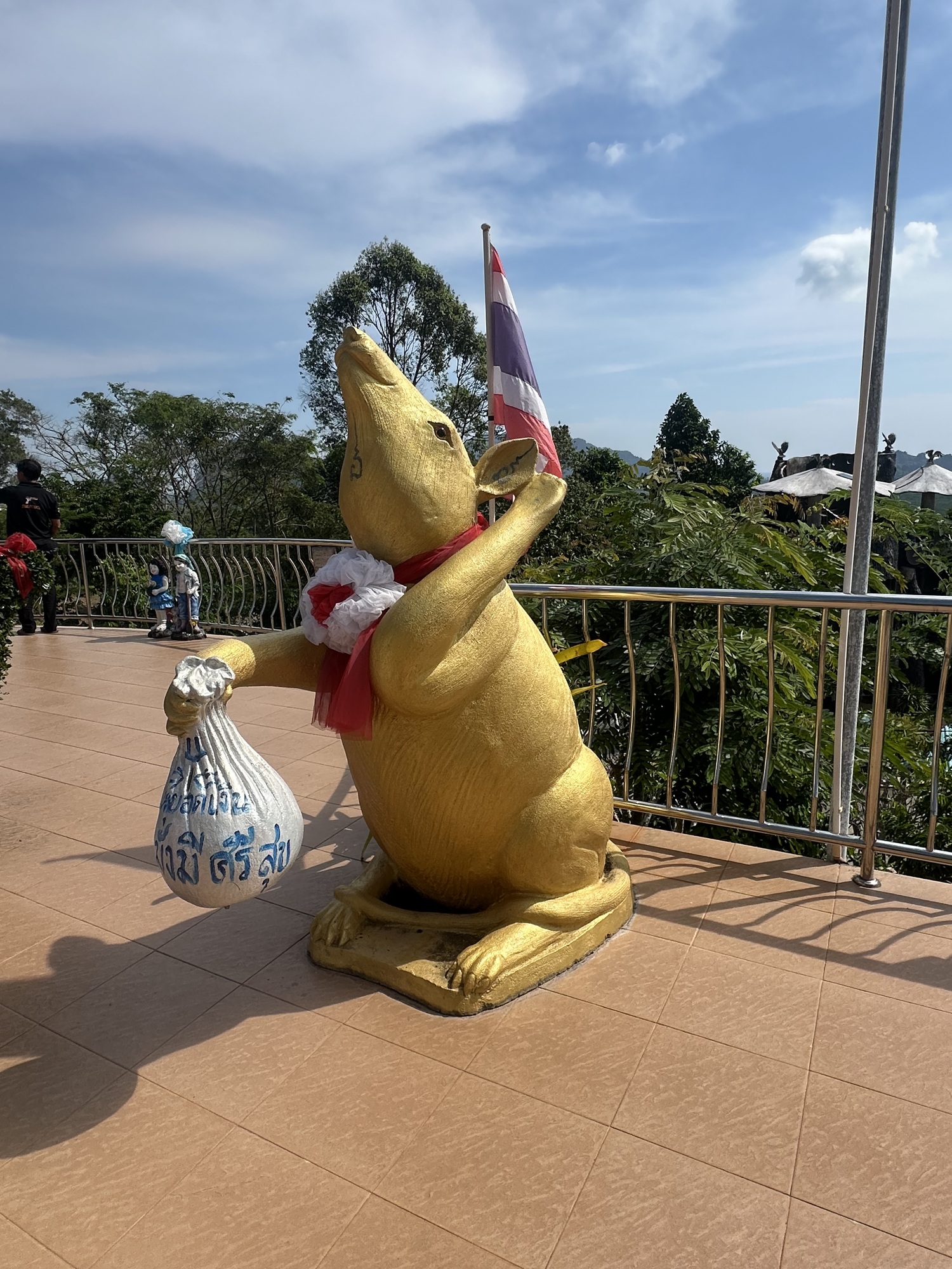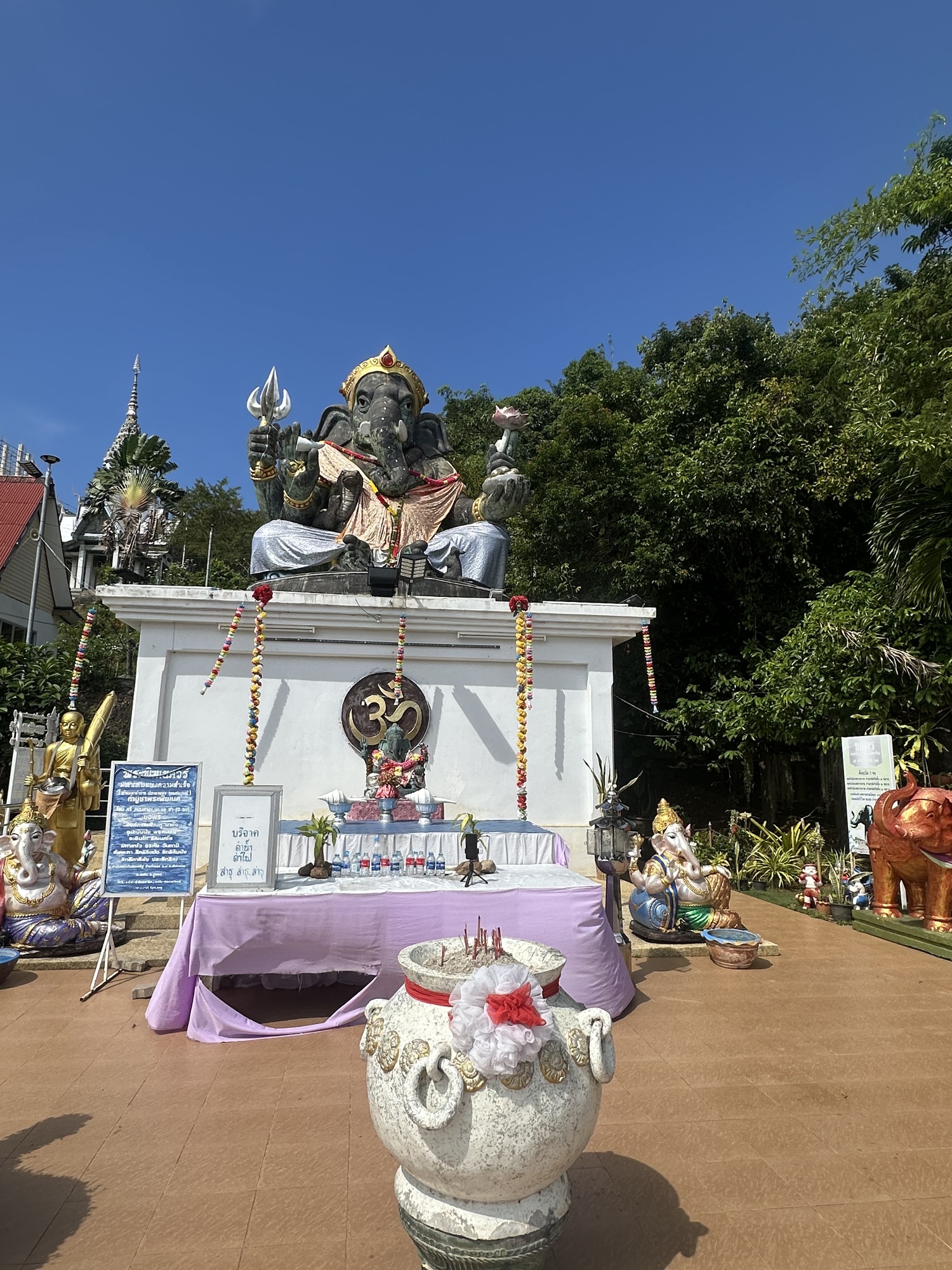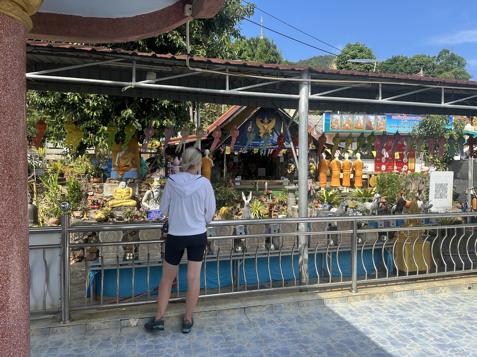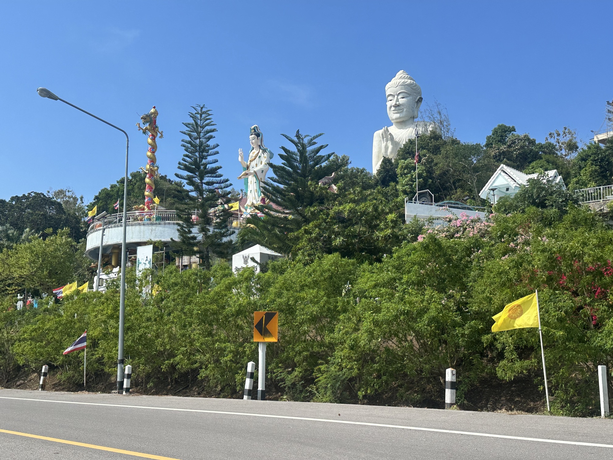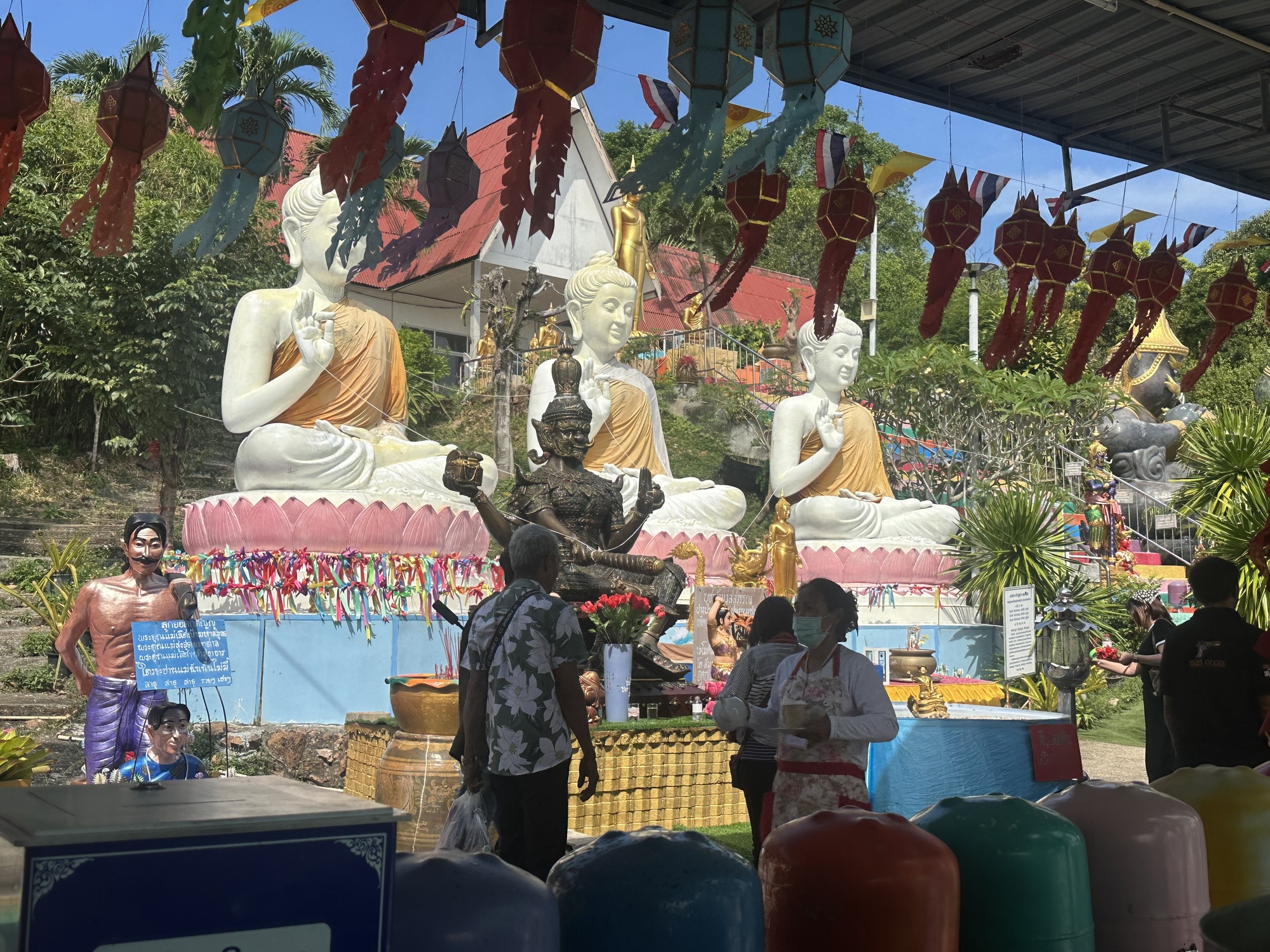 It is identified on the map as Wat Kaew Prasert.  As we approached it, we could see a tall white Buddha head poking up out of the trees, which was pretty cool looking. As we go closer, we could see the place had a variety of statues and structures, plus it was LOUD blaring poppy semi-devotional quasi funfair music (no idea how else to describe it), with an emcee manning a mike narrating what seemed like requests for donations. Clearly worth checking out.