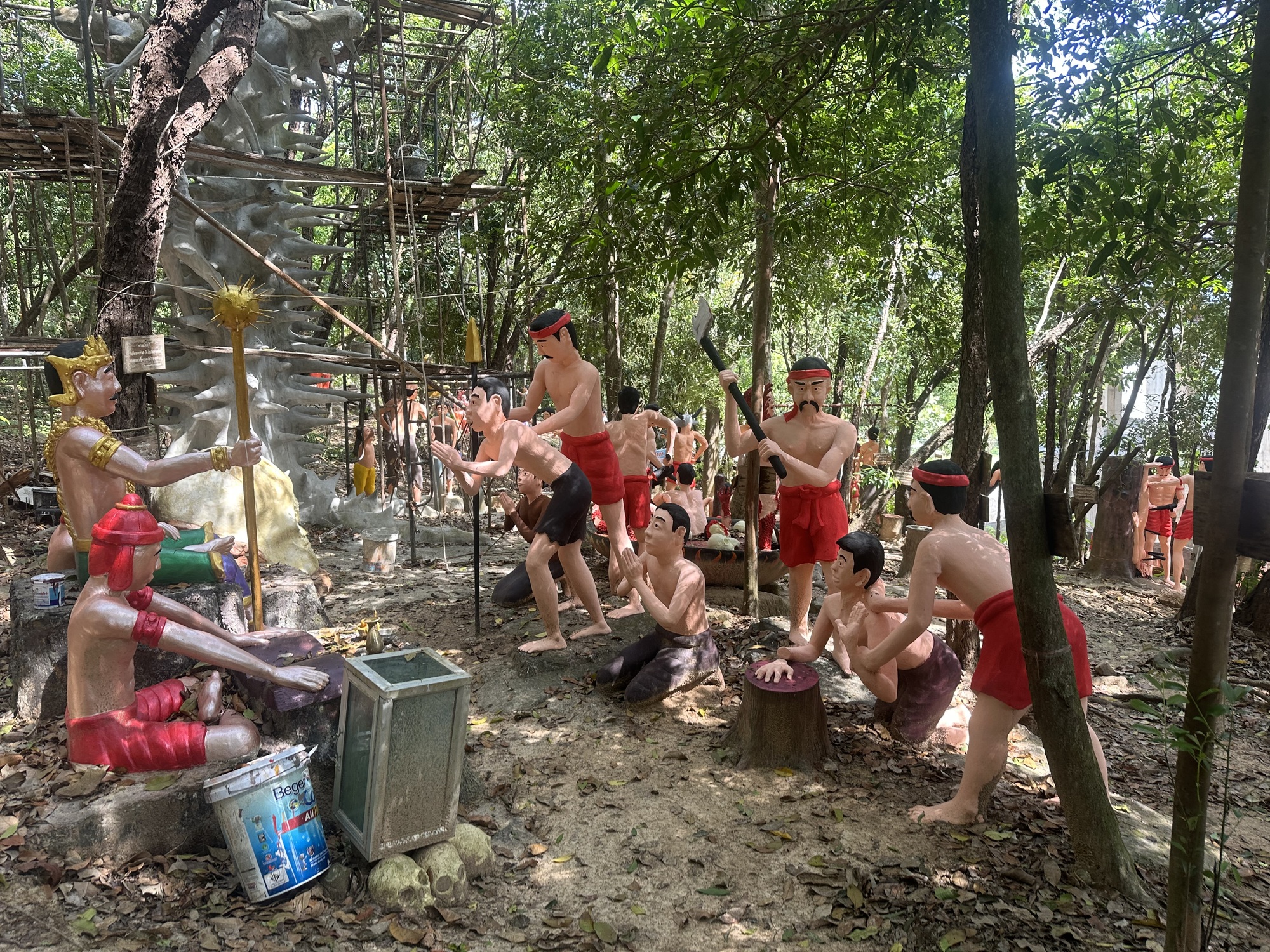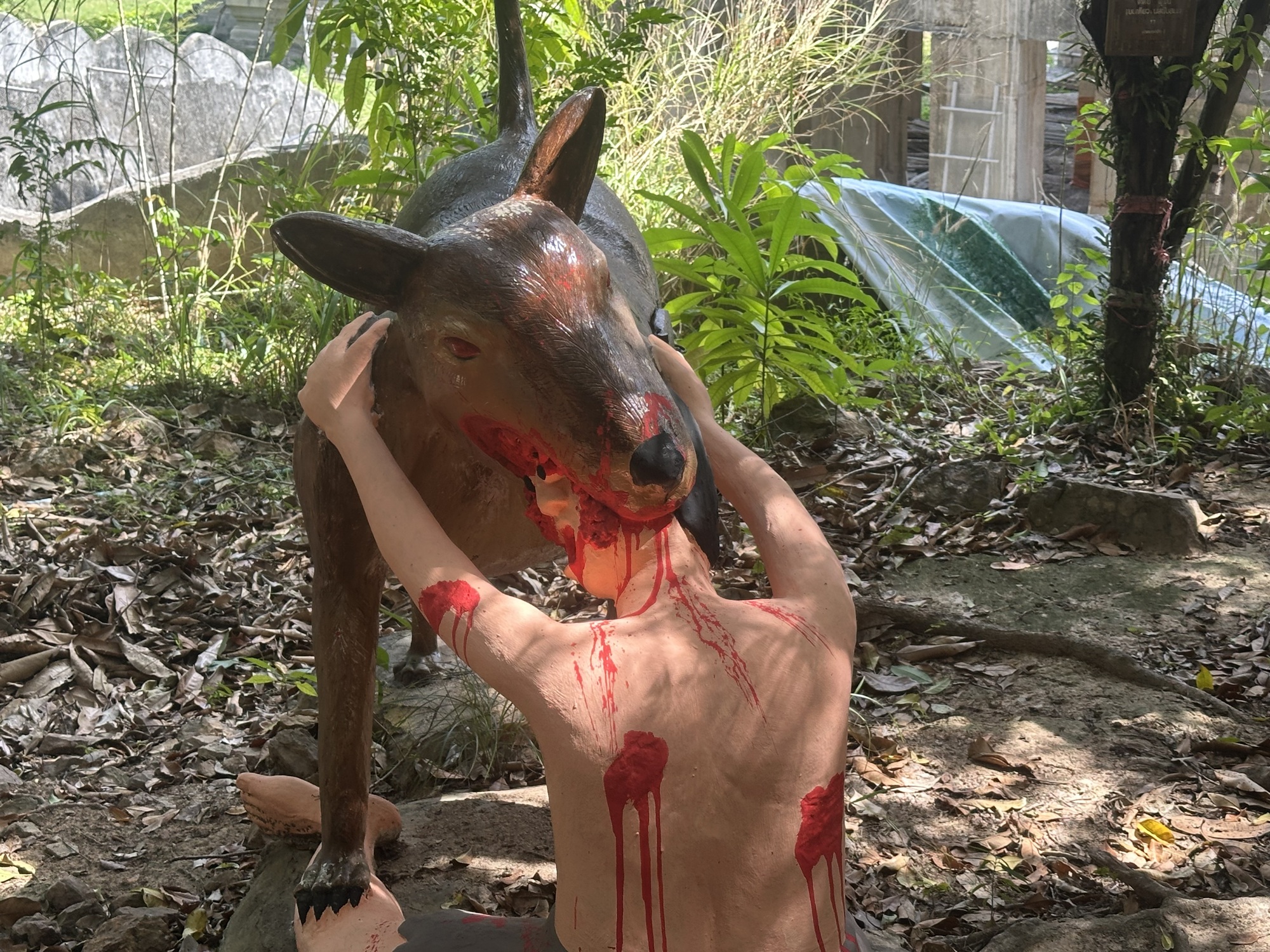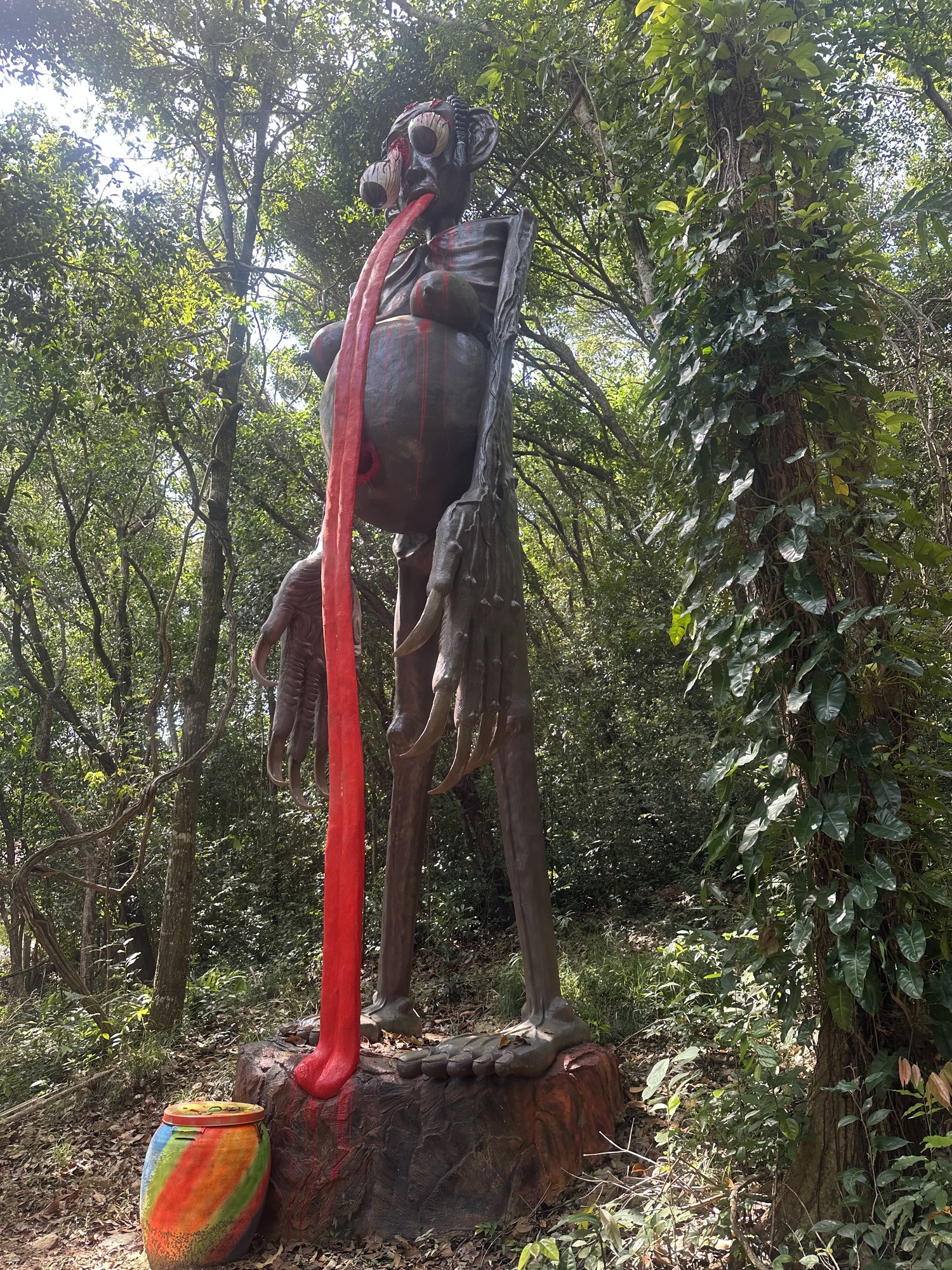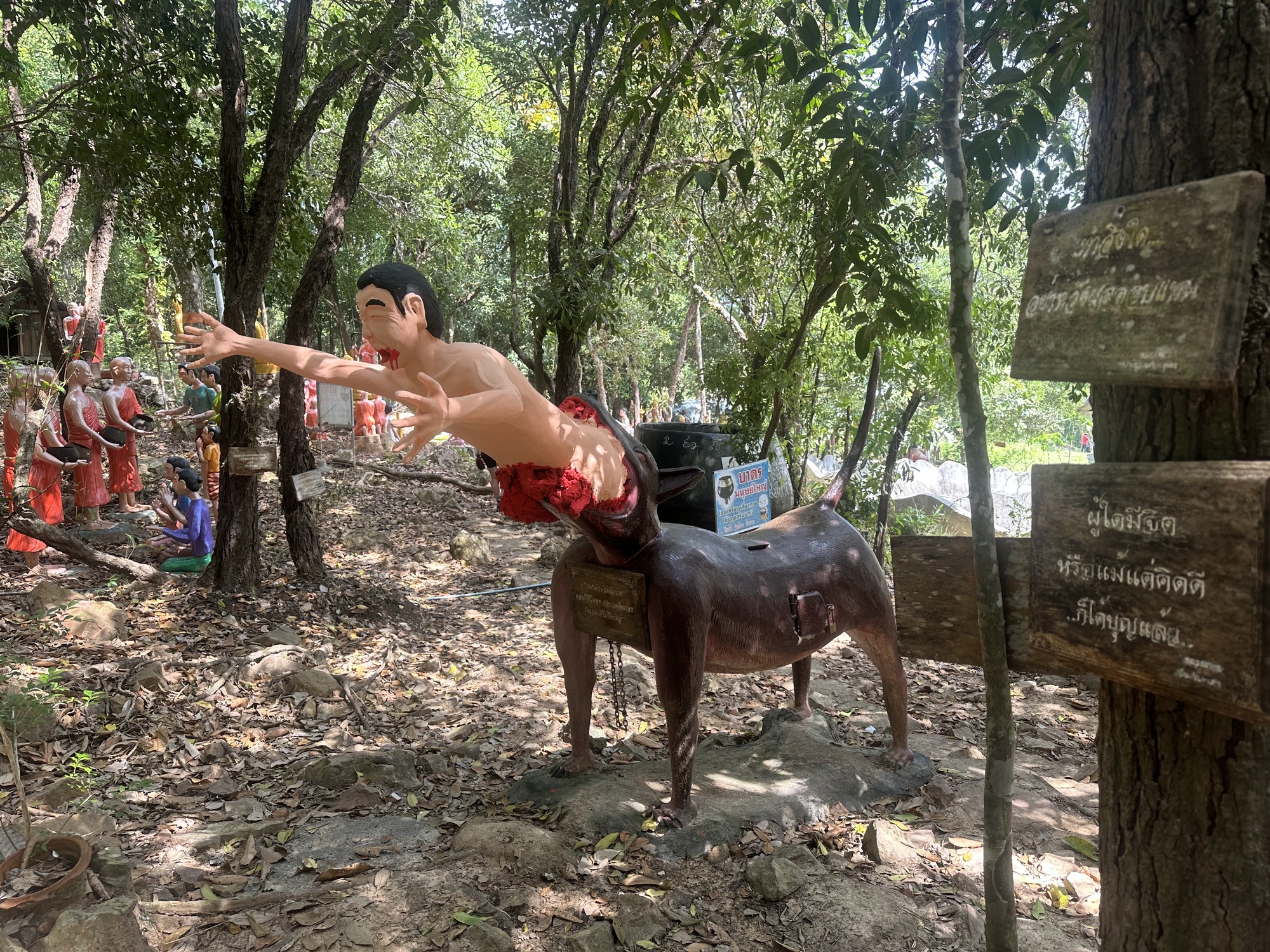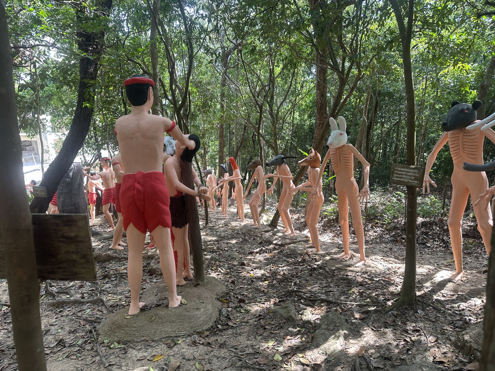 After along sit in the treehouse cafe with lemon sodas, we oriented ourselves a bit more to the site, and discovered there was a “Hell Garden” on site that another traveller recommended, which was in the forest behind the big Buddha.  Well, ok, we heaved ourselves up the hill, past the Buddha, to one of possibly most bizarre things I have seen.  Down a small path in the forest was a very graphic and surreal display of the torments of hell.  It consisted of life size statues of people undergoing amputations, being eaten by dogs, getting eviscerated.