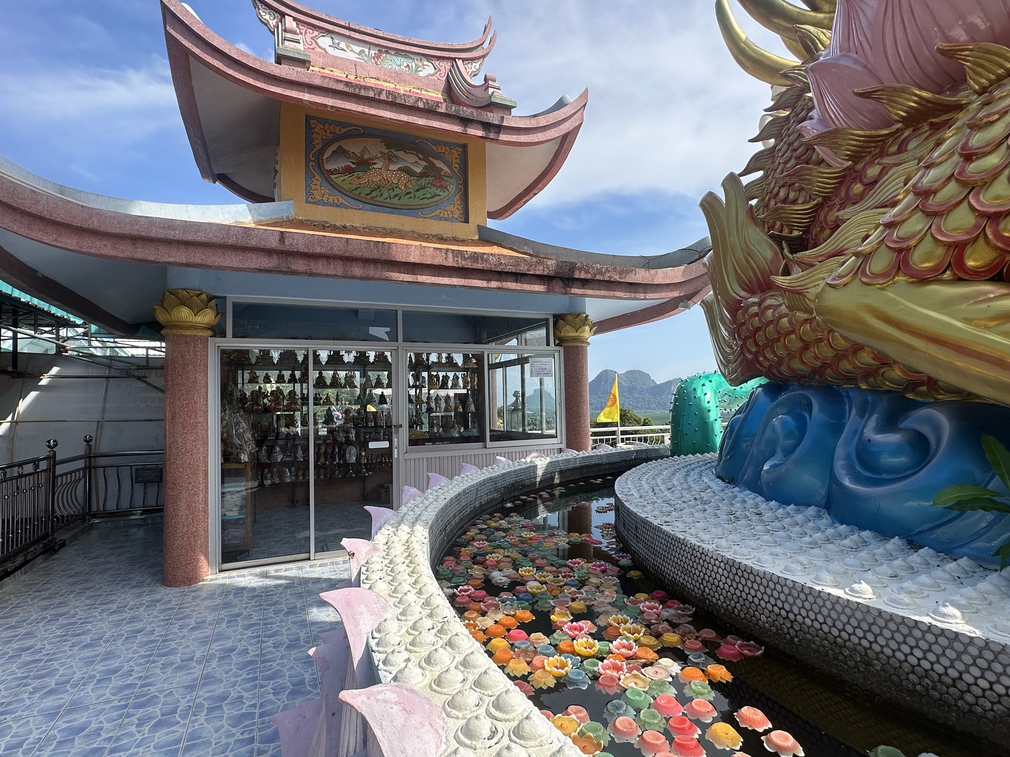 We parked the bikes across from some sort of treehouse style cafe, which had dinosaur statues in front of it. We found our way up the hill to an odd mashup of concrete statuary and shrines.  Our first stop was a lookout over the bay, which was pretty breathtaking.