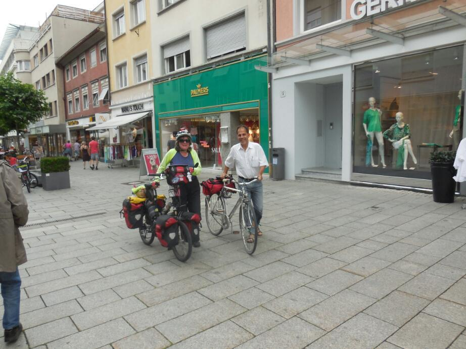 A year later, we were back in Bregenz. Bernie had invited us to come back, but our attempts to call him had failed. Finally we succeeded, by guessing that I had written down one "1" too many at the end of the number. Bernie is a mechanical engineering teacher, and luckily today turned out to be the last day of school. So he cycled from school to meet us at a restaurant by the Bregenz boat harbour.