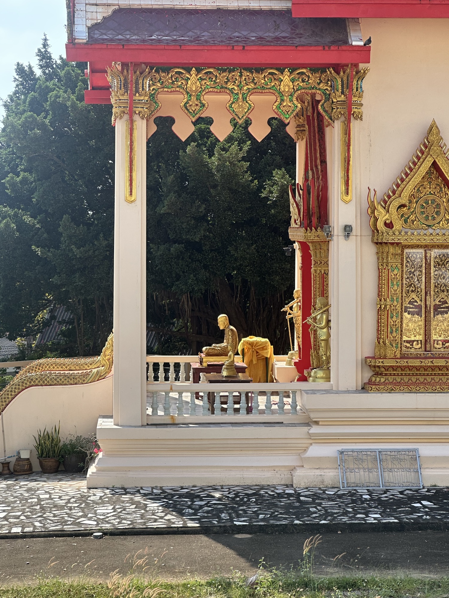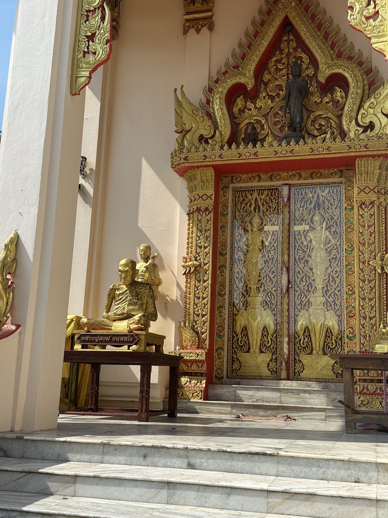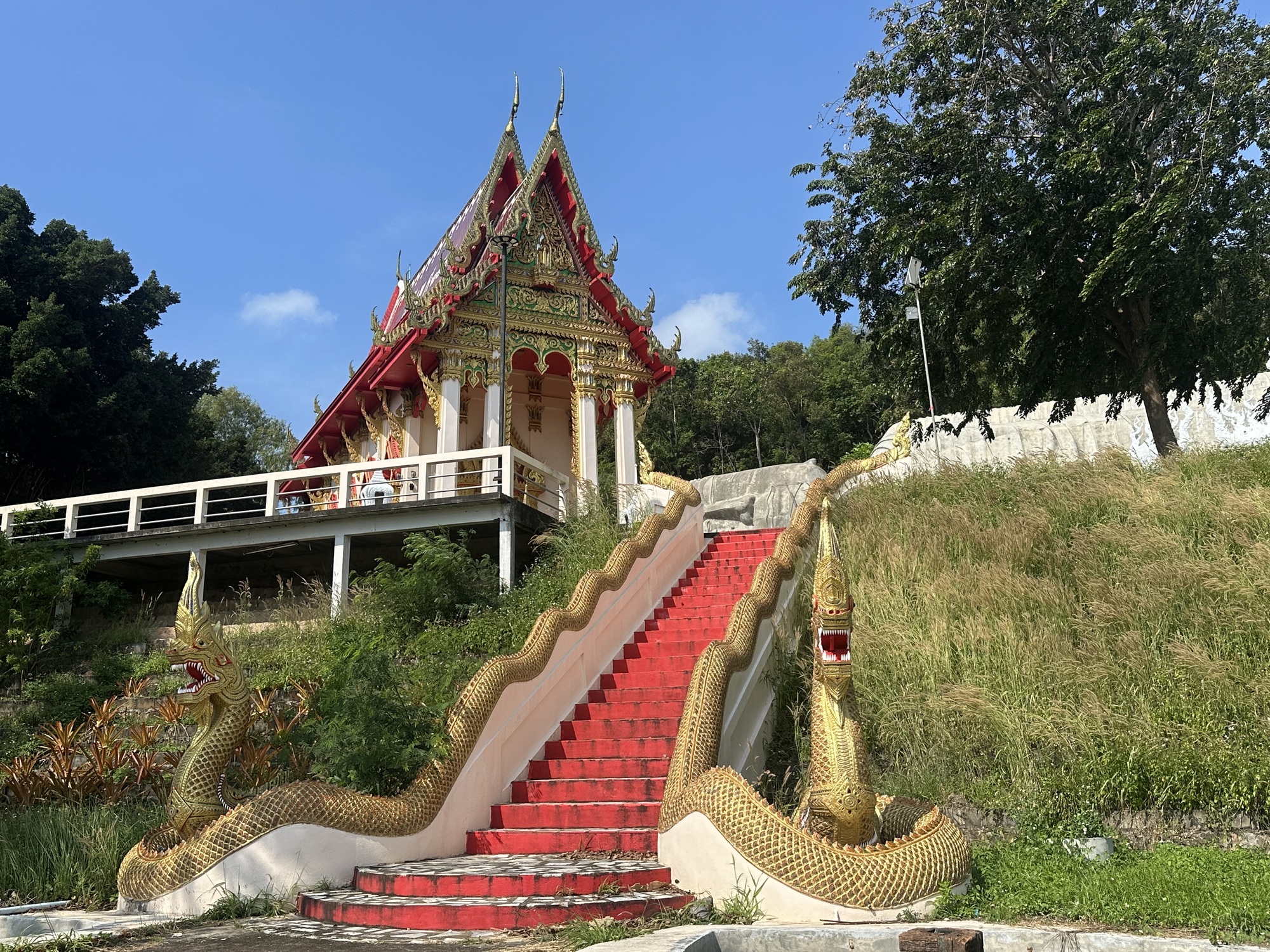 Shortly after leaving the Italian couple we passed a large wat complex, and thinking of the rather spectacular one we’d visited the other day, we stopped in to see what this one had to offer. And maybe someday it will reach the elaborate heights of Wat Kaew Prasert, but for now it seemed still under construction, with a huge reclining Buddha waiting for his golden gilding.