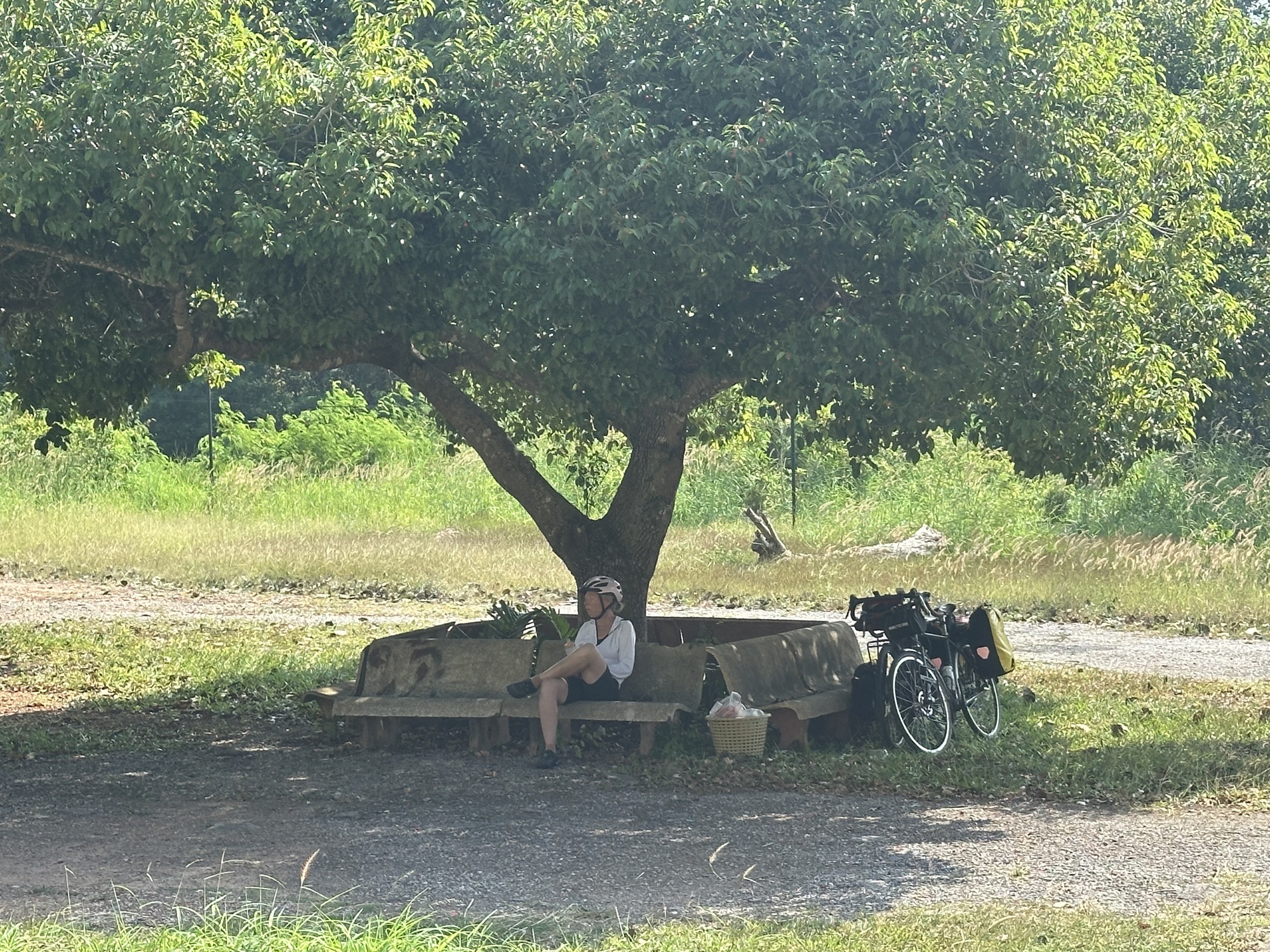 This was a day for meeting other cyclists, as it turned out. Later that morning we spotted two cyclists coming towards us on the other side of the highway. They stopped, we stopped, and we bellowed across the traffic at each other for a few minutes until there was a break in the flow and we ran across the road to have a proper chat. They were a young Italian couple on a round the world trip, currently making their way north from Singapore. They were interested in our trip and asked (politely) if we minded telling how old we were — and then seemed mildly blown away by our extreme age, “the same as our parents!”.