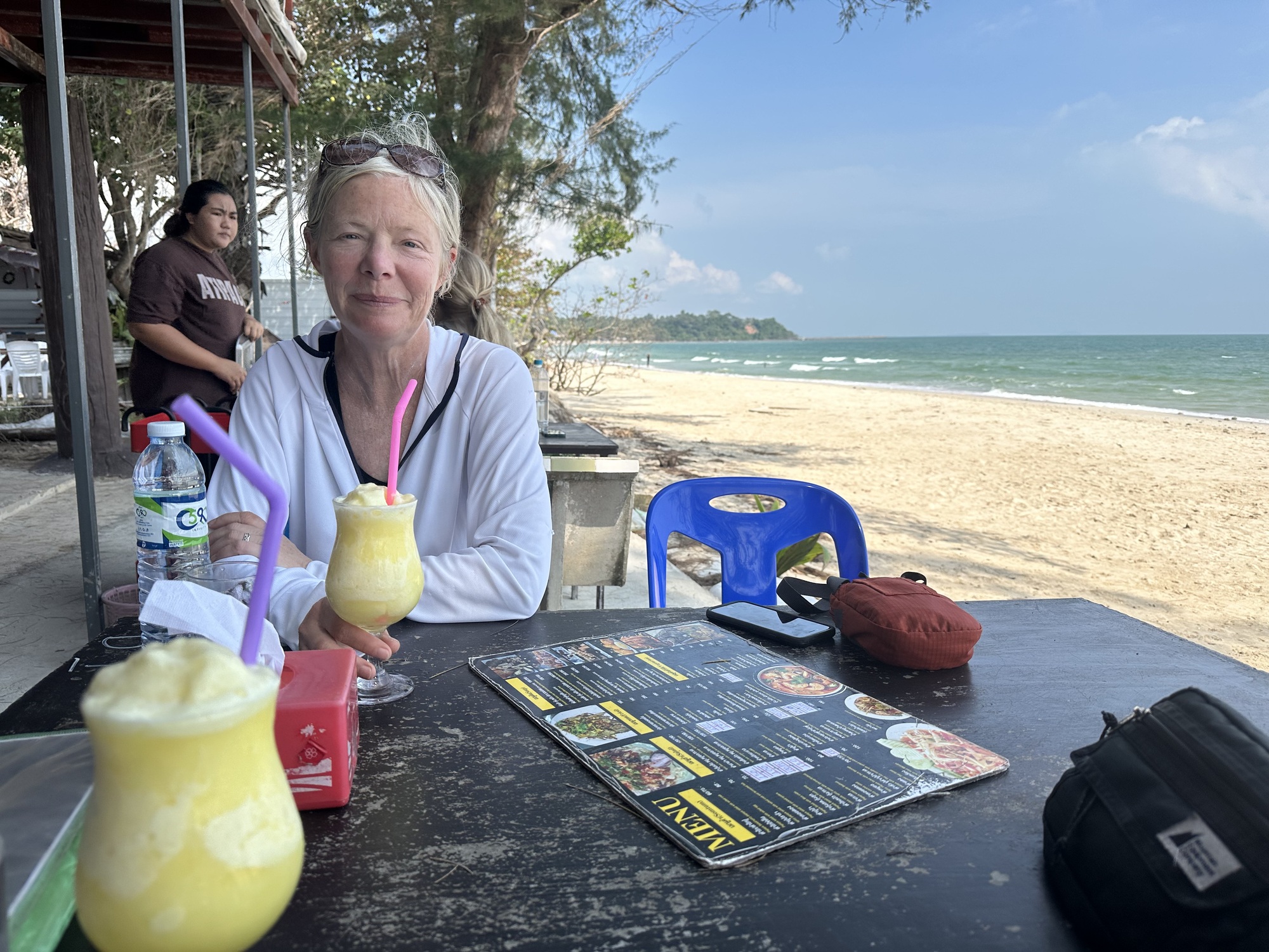 We rode into the beach resort town of Thung Wua Laen around noon, which seemed like a great reason to stop for a long break at a beachside restaurant— first for icy cold pineapple smoothies, and then for a proper lunch. We watched kiteboarders skimming over the waves and I debated about going for a swim — but the wind was kicking up the surf and we’d passed a warning sign about rip currents on the way into town, so eventually I gave up on the idea.