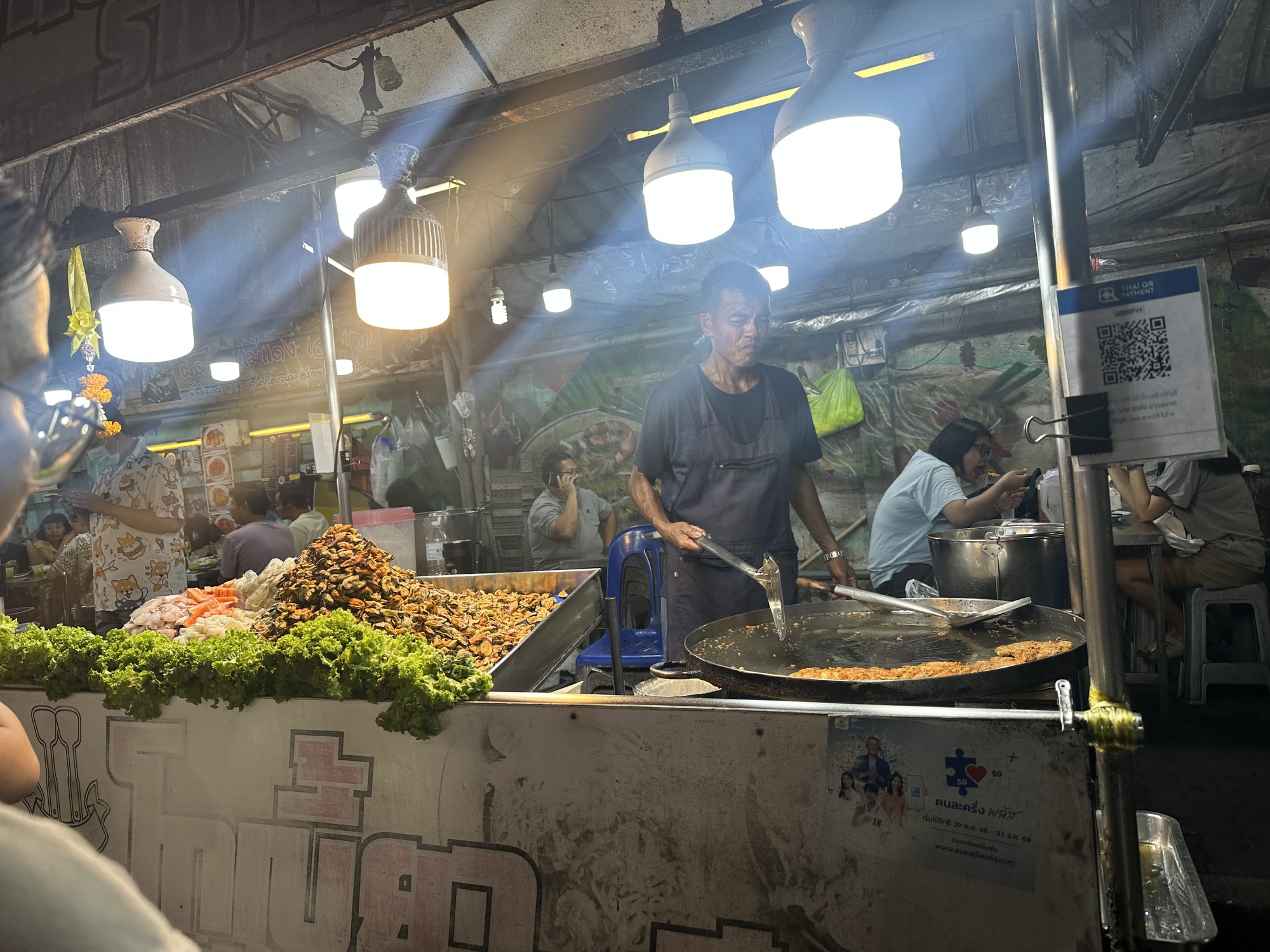 That evening we walked into town to check out the night market — several blocks of food stalls buzzing with pedestrians and scooters cruising up and down the many dinner and snack options. We watched a woman making “Thai pancakes” - tiny crispy crepes with a sweet marshmallowy filling and toasted coconut. She was spreading thimblefuls of batter on a griddle with maniacal intensity and machine-like speed and precision, while a lineup of customers gathered. Then we moved along to observe another artist at work, this one a man in charge of a giant wok where we was deep frying a kind of big pancake full of mussels and finished with bean sprouts. Again, we admired the skill, but didn’t buy — the lineup was long and competitive.