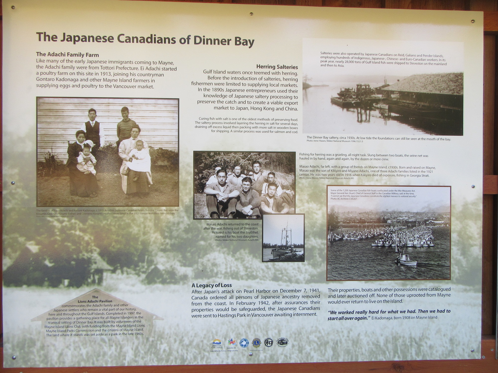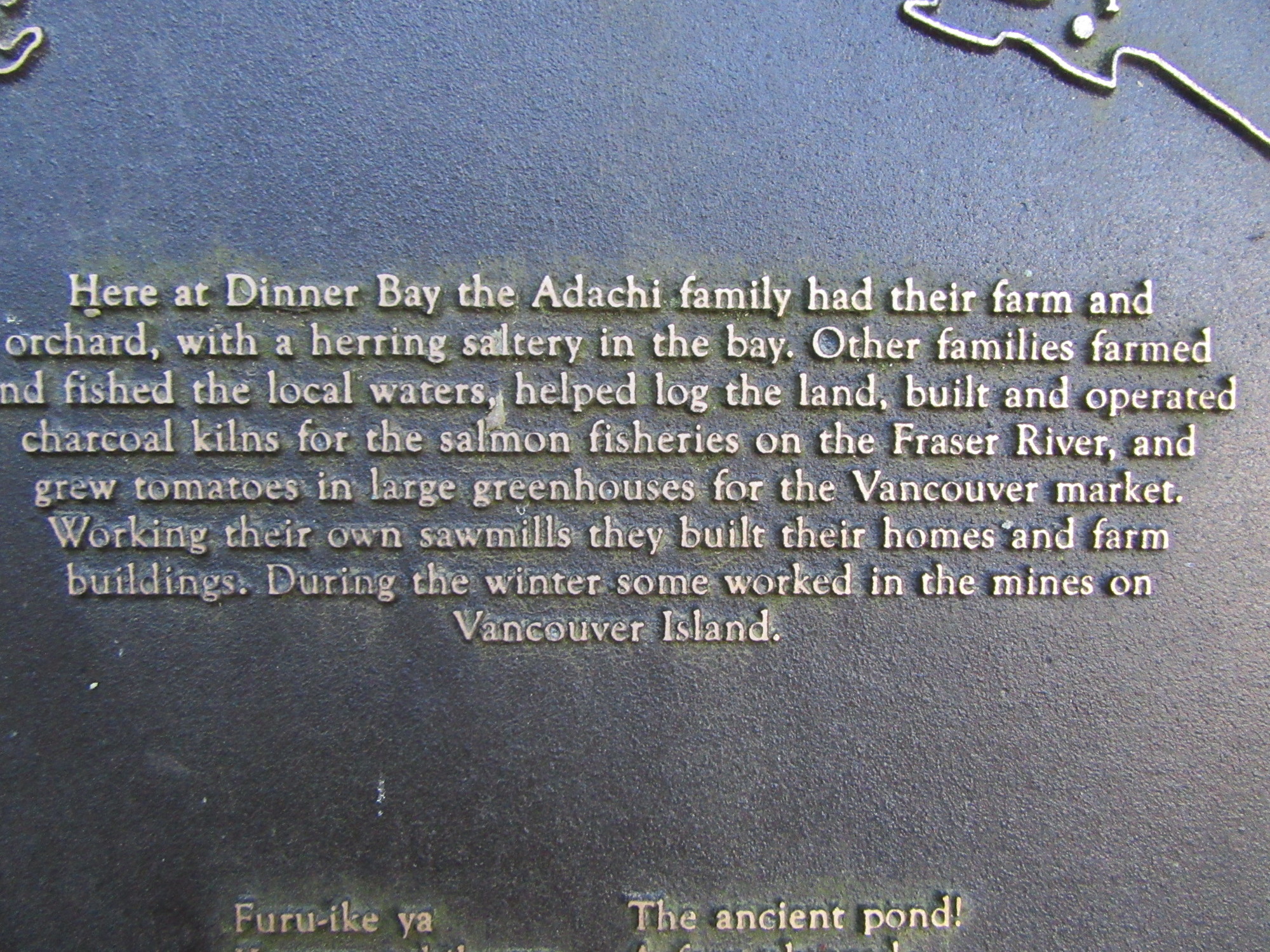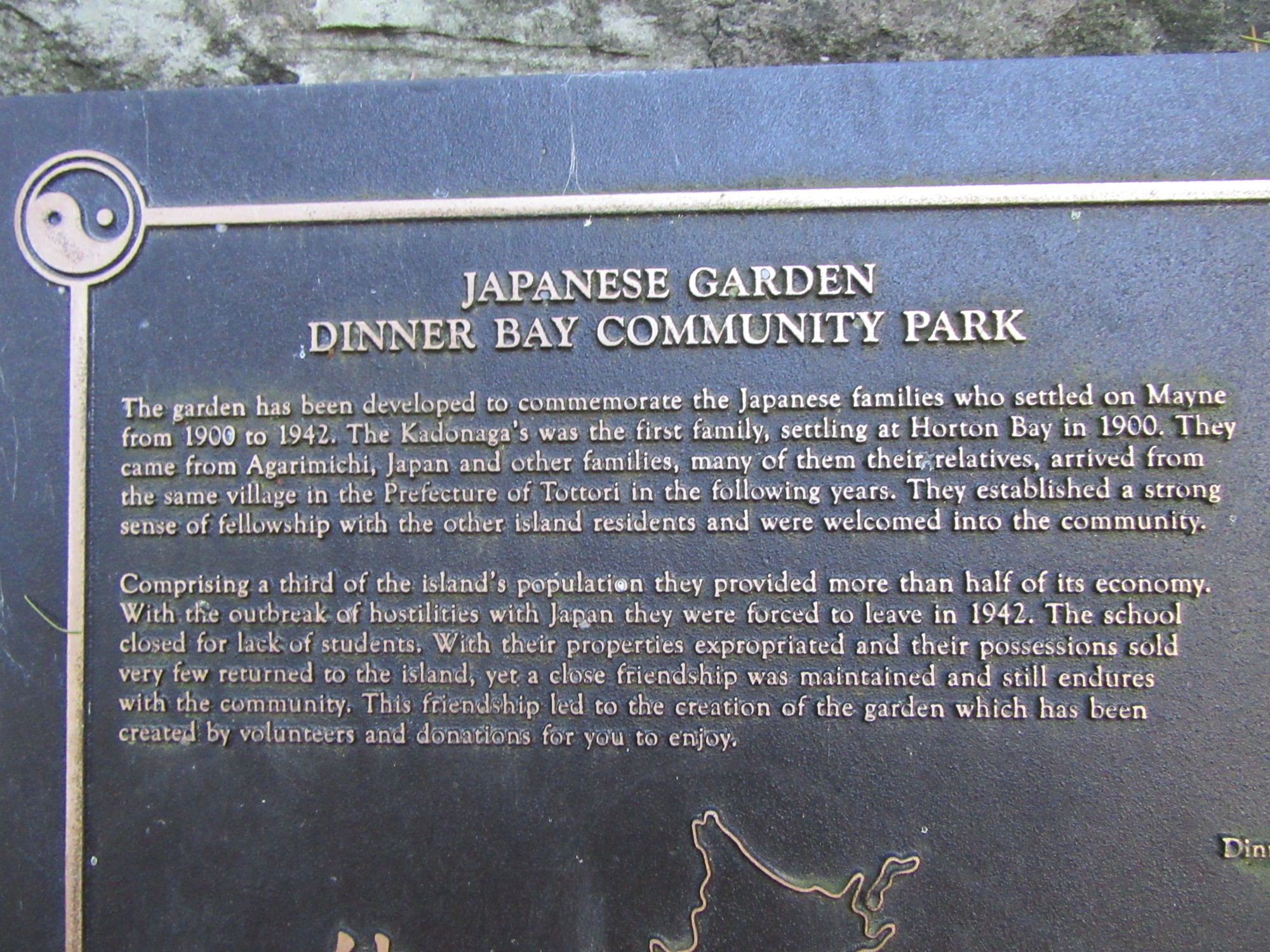 On Mayne Island, from an idea that began in 1987, to completion in 2002, a commemoration of the former Japanese community was created, in the form of a Japanese Garden. We went to see it, at Dinner Bay. Here are some of the explanatory posters or plaques: