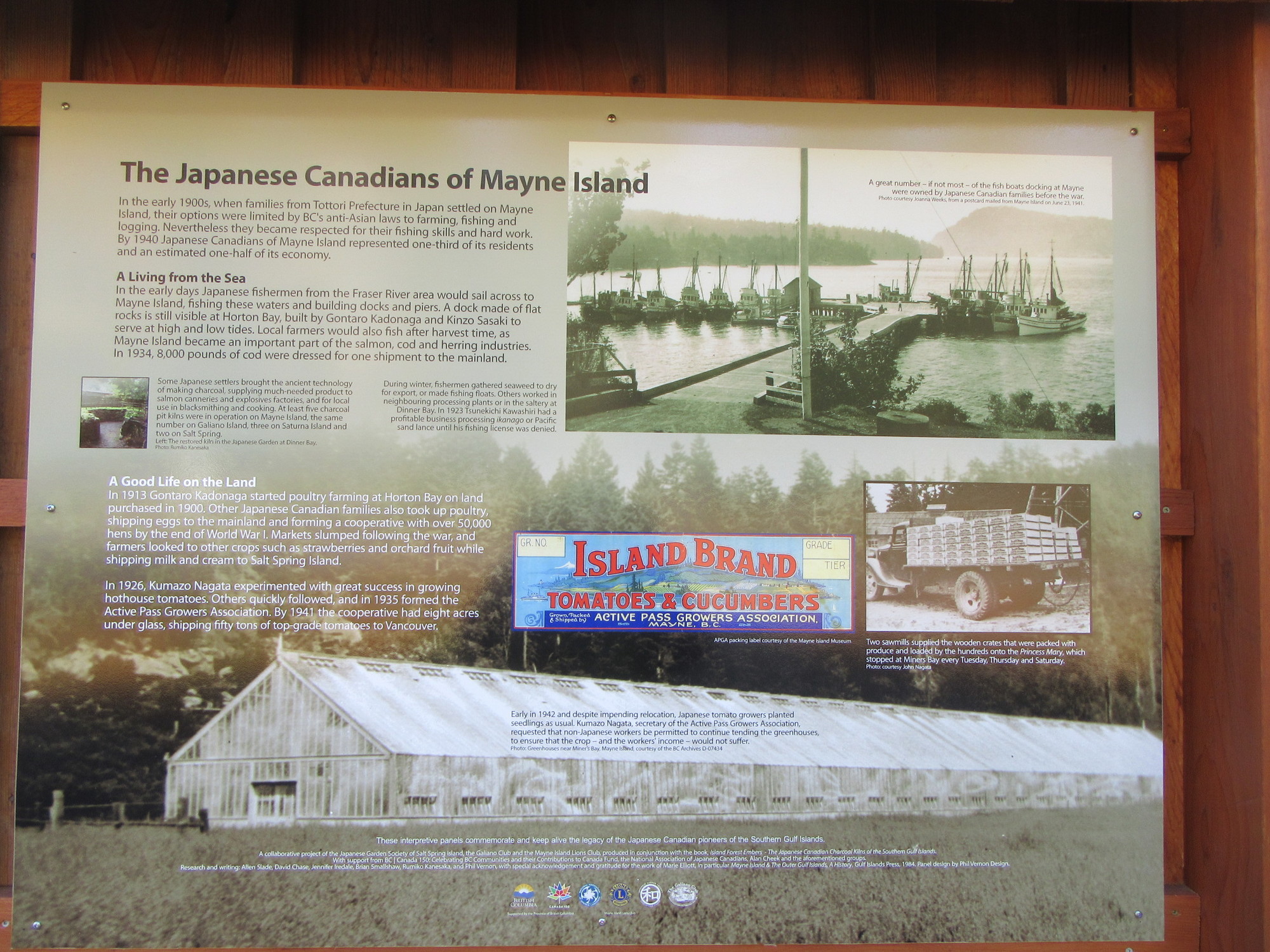 Around 1900, some families began to come to Mayne Island from Japan. Like other immigrants, they established themselves with hard work, focusing on fishing and canning and agriculture, including greenhouses. But in 1942 when war commenced with Japan, they were famously rounded up and shipped away, their lands and possessions ultimately auctioned off.