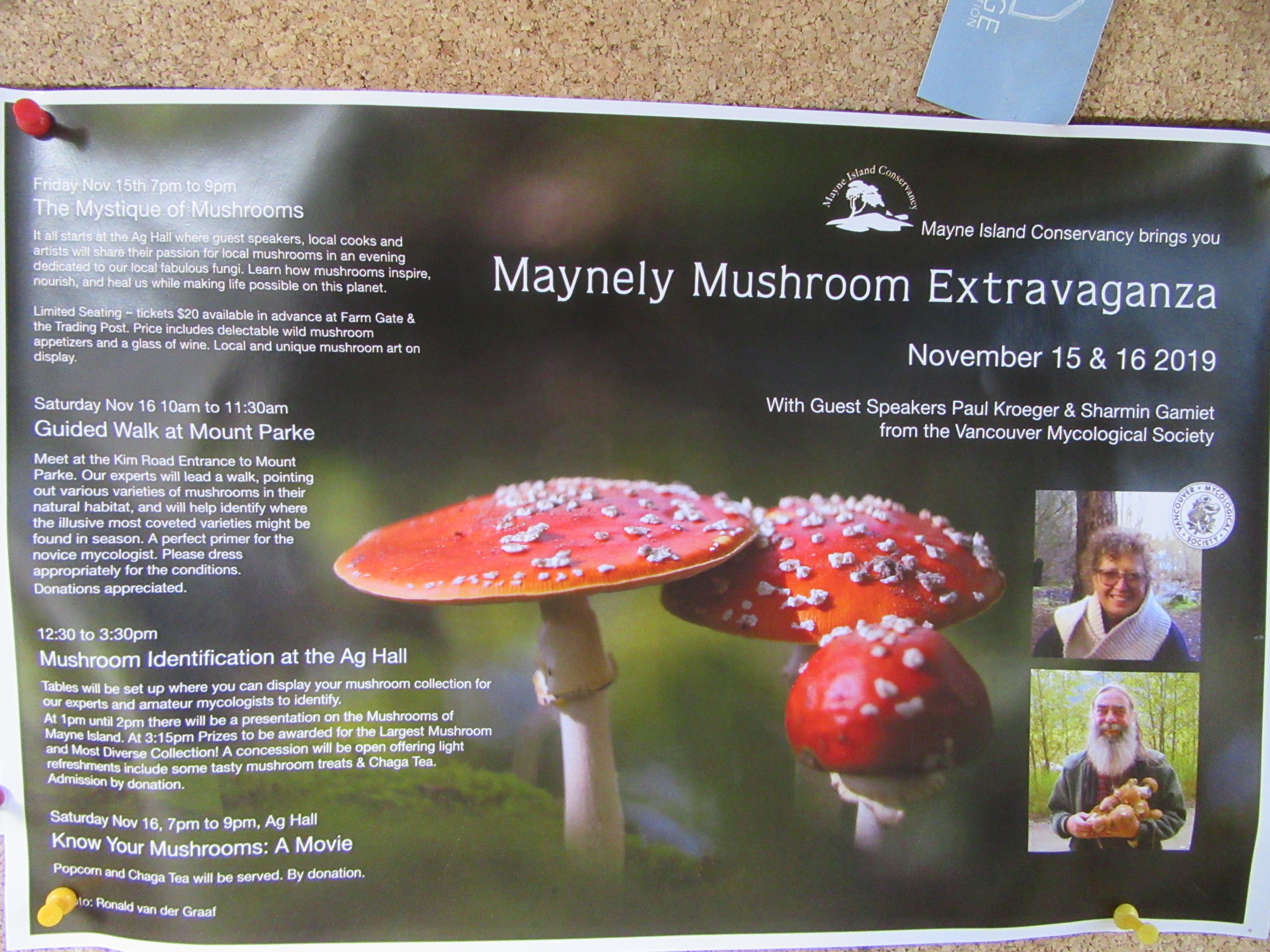 Less nutritious but as interesting are those mushrooms that we spotted the other day. Of course they are well known locally, and so made it to a poster advertising some mushroom seminars coming up soon: