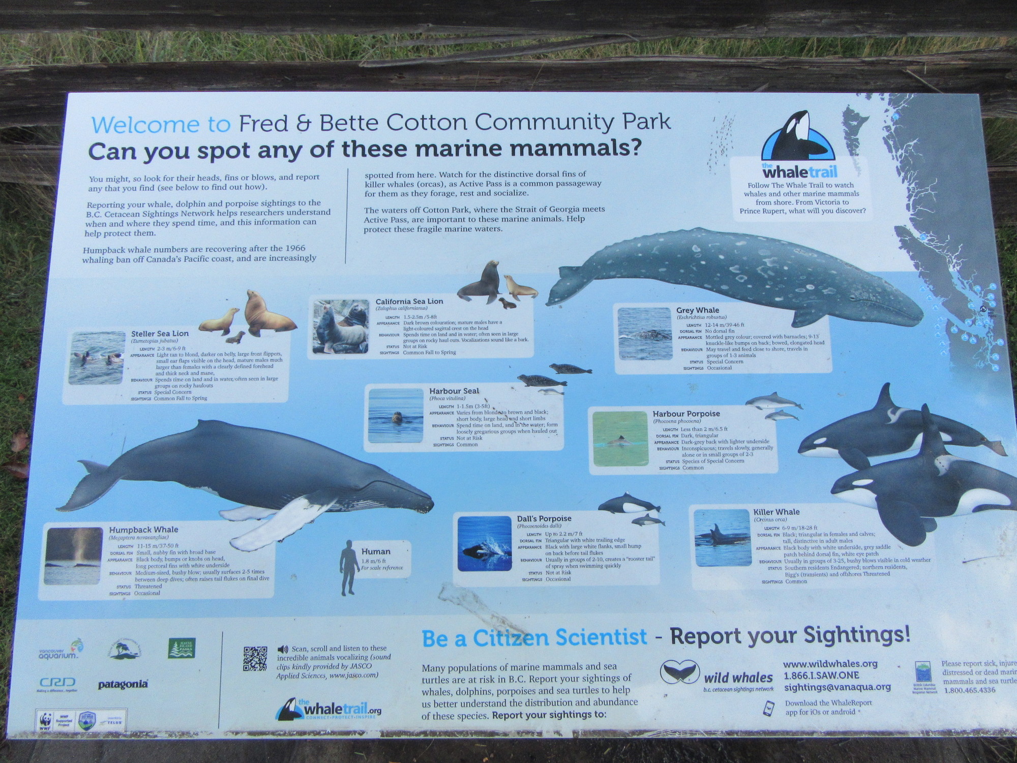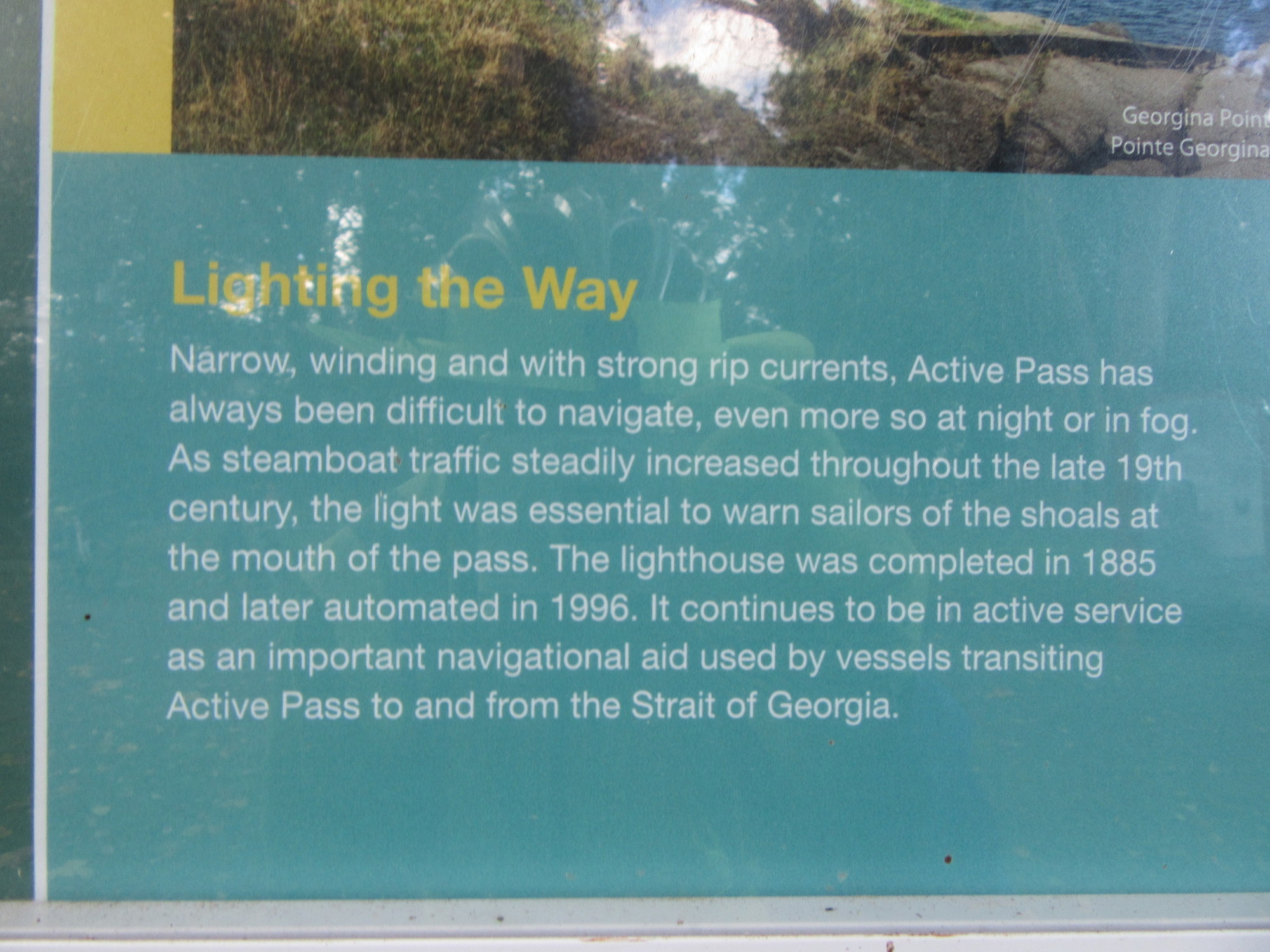 Our education about Active Pass was furthered as we came to Cotton Park and the Georgina Point Lighthouse, at the entrance to the pass. No doubt because of its "active" rip tide nature, the pass is home to all manner of marine mammals, and many species of birds. Parks Canada, of course, is adept at explaining: