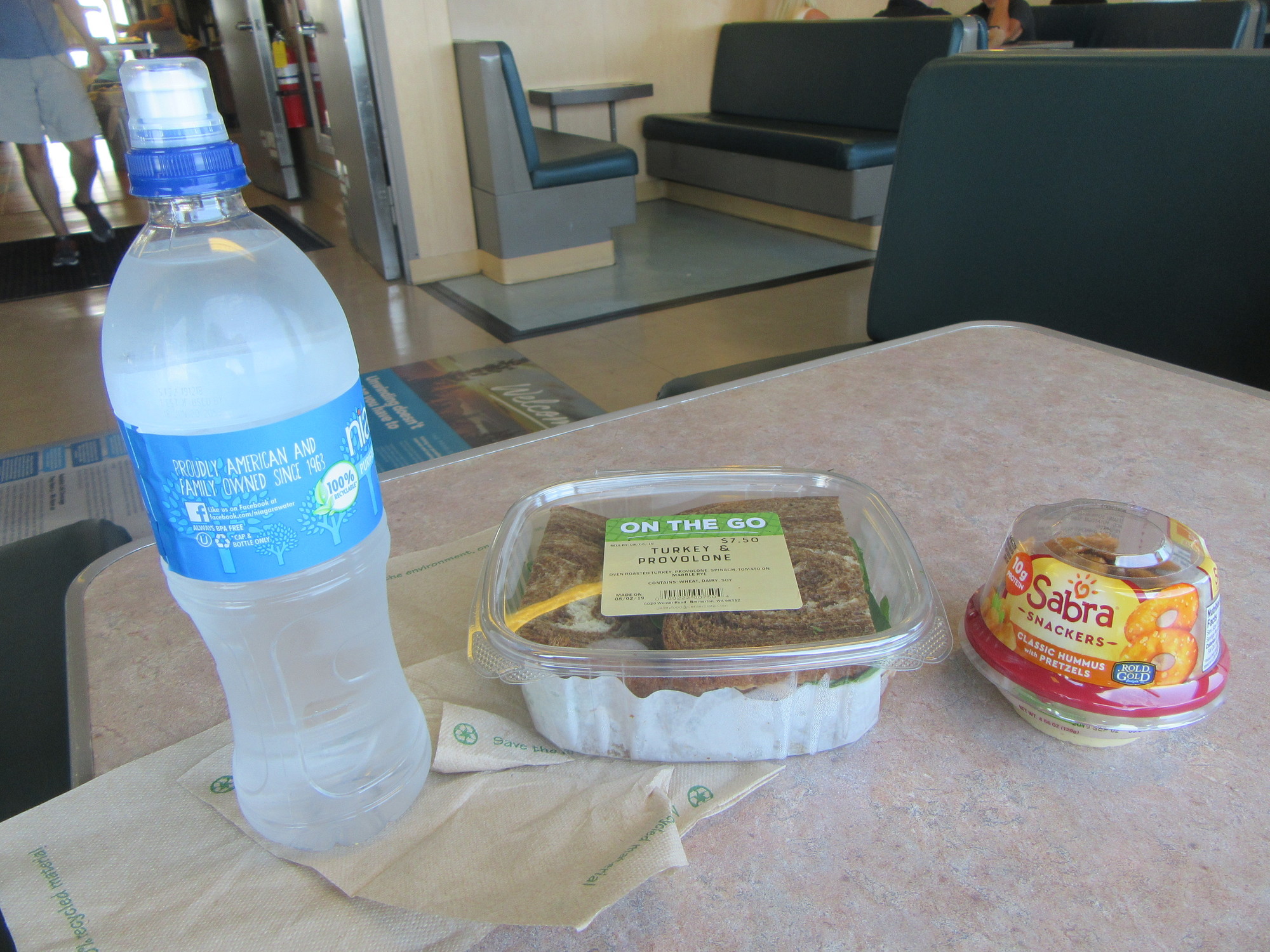 Over three hours on board pretty well guarantees that you will patronise the onboard food services. This is where BC Ferries, often criticized, begins to shine. On many sailings they have the "Pacific Buffet", which for $Can 23 or so offers all you can eat of quite creditable salads, main dishes, and desserts. Here on WSF I sent Dodie off to find a burger, but she came back having felt unable to actually buy the dubious foil wrapped offering. Instead she had a sandwich, some hummus, and water. $17. (That's $US, eh!). We know this will be a problem for us in the US going forward on this trip. There is good food somewhere in the country, we have heard. But most people subsist on dreck.