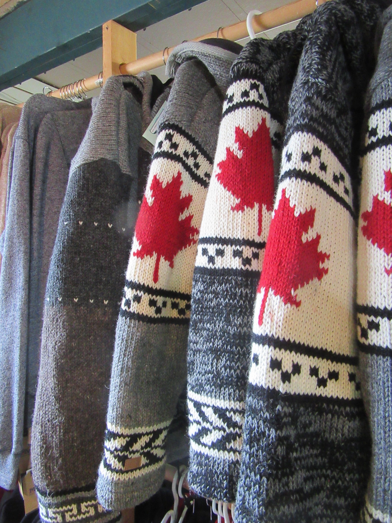 Also truly Canada was the large display of bulky knit wool sweaters. We normally call these Cowichan Sweaters, and indeed they are knit by local (to us) members of the Cowichan tribe. In fact in our sheep farming days we were well aware of quite low prices offered for fleeces, and of the fact that the government built the tribe a carding mill, but that we were excluded from using it. All that may now be in the past. These sweaters, anyway, were knit in Nepal from New Zealand wool. (Sorry Trish and Ken - we know people need to make a living down there too!)