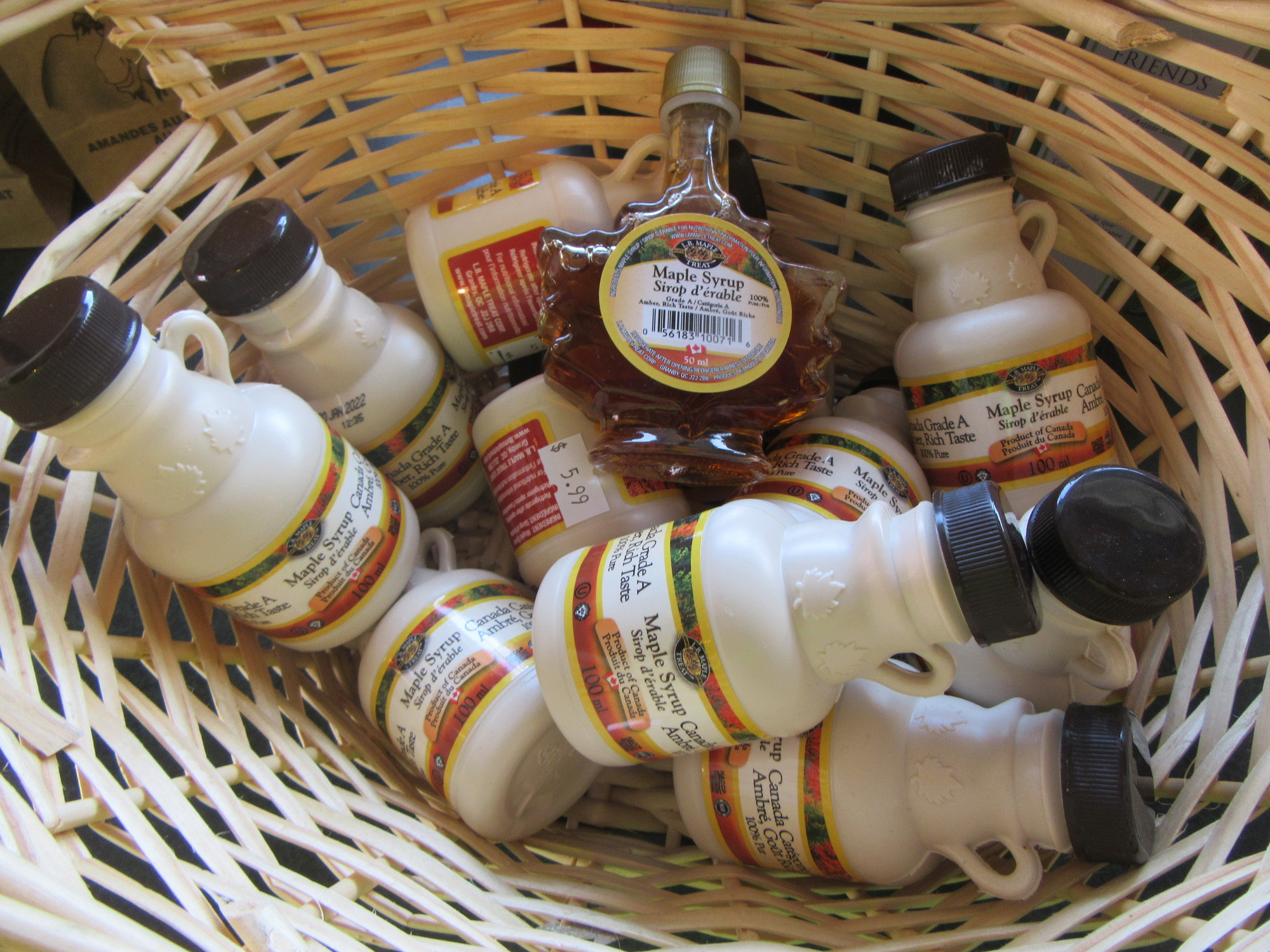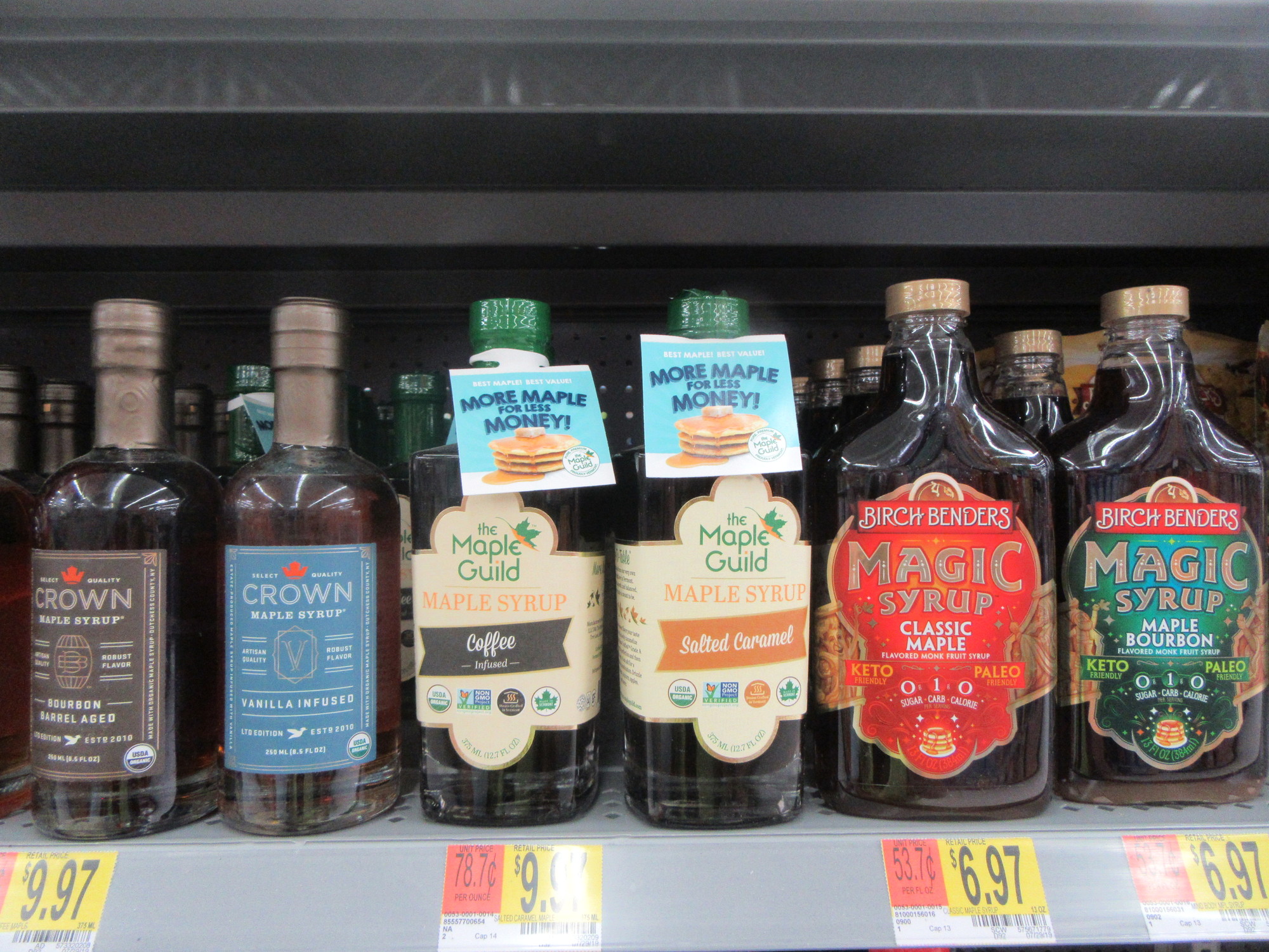 To perfect our experience, we stopped at Walmart. The store, off I-5, was two or three times bigger than a Walmart back home. And naturally, the number of distinct products was also two or three times greater. We would be hard pressed to really say what all these varieties were about, but we failed to spot anything that seemed as it would make our lives all that much richer. Ok, here's one example, where we can make a direct comparison to back home. Remember the maple syrup at Sidney? Here's what you can get at Walmart near Seattle: