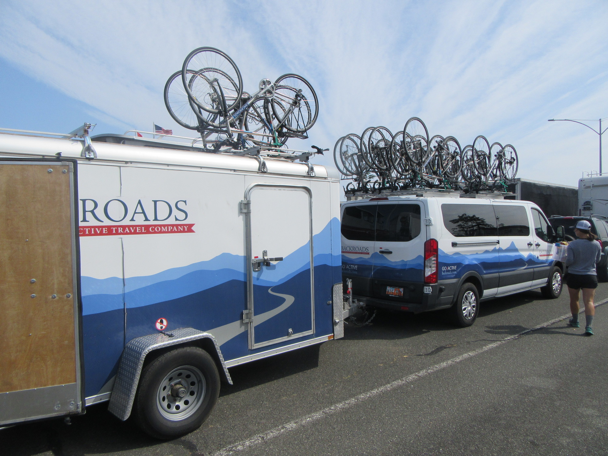 The 90 minutes included a little time to be parked waiting to board, in a lot with a souvenir shop/snack bar alongside. The parking lot revealed a lot of those vehicle types that we hope do not pop up on the road when we are cycling: The classic motor home dragging jeep, and the vexatious boat on trailer were there, plus an increasingly common one - the Backroads support van and trailer. Backroads is sort of OK. At least, we have enjoyed browsing their slick catalogs, which contain ideas for places to go on our own self-supported efforts. But when Dodie tried to engage two "clients" about their trip, she was pretty mcuh brushed off with a "Go talk to the organizers". Of course, you will never get this from a self-supported cyclist. These folks might as well have been in a bus tour.