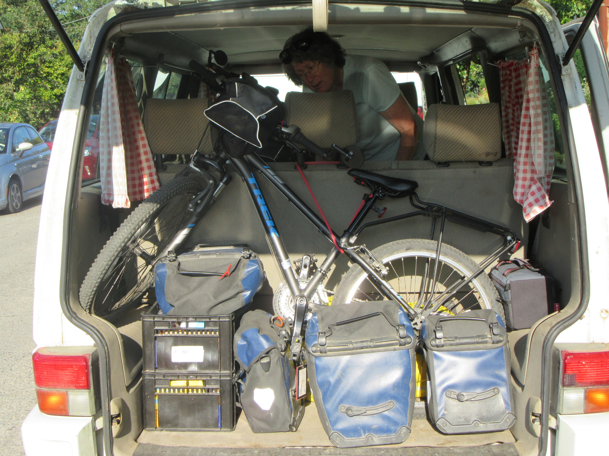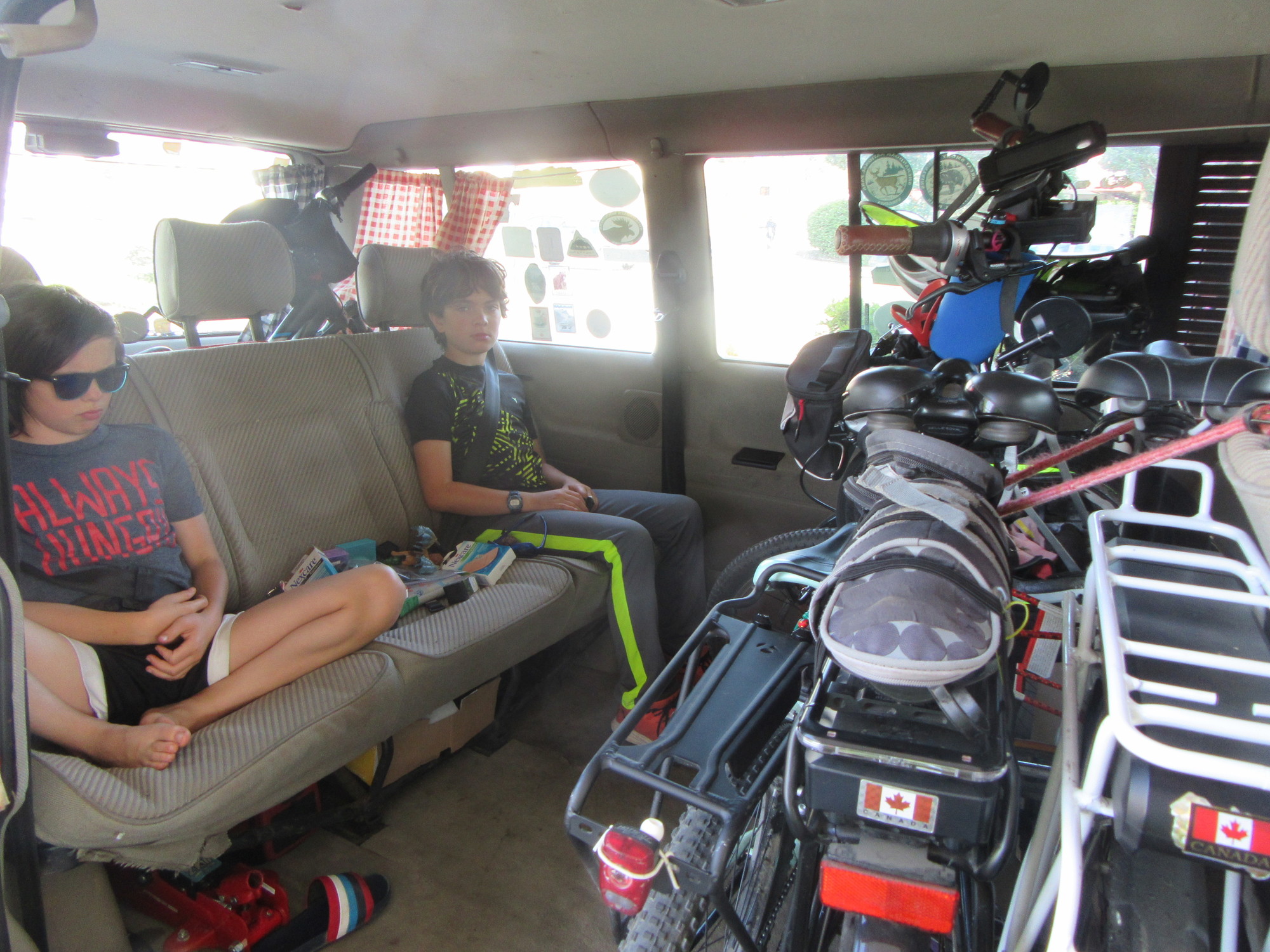 Instead of using the bike rack, we decided to jam all riders and bikes inside the van. It would be more secure that way during any stops, and I hate watching bikes swaying on the rack in the rear view mirror, even if I am quite sure the rack will not fail.