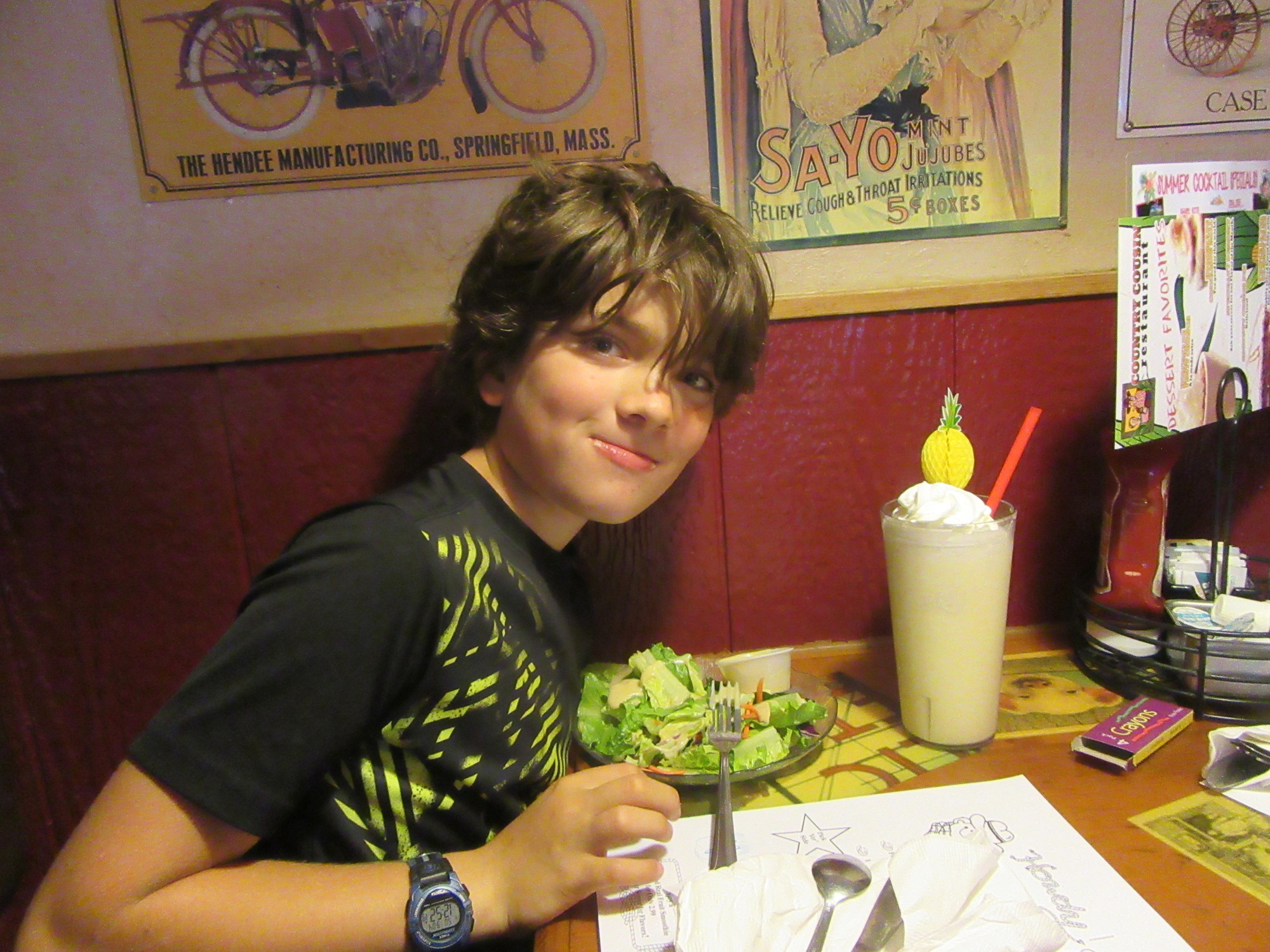 We stopped in Centralia to look for food, and fell across a restaurant called Country Cousin. Centralia is half way - 90 miles to Seattle, 90 miles to Portland. Country Cousin is decorated with lots of "country" or farm knick knacks, has wood finished walls, and a general effective farm house feel.