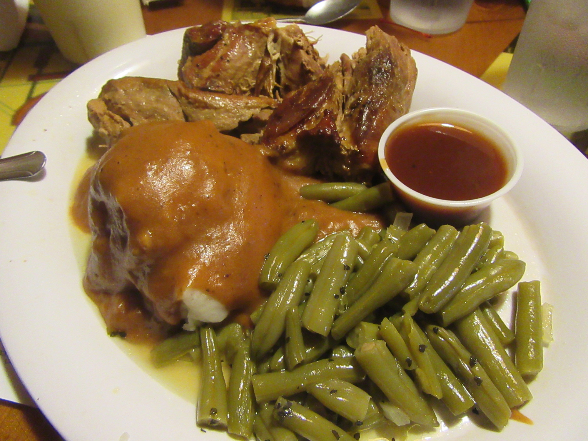 The food turned out to be authentic American "country", as advertised. Avi's plate of ribs with "all the fixins" is a good example. We have seen the instant mashed potatoes drowned in sauce from North Dakota to West Virginia. The same for the canned green beans. Sides like this can include macaroni and cheese, grilled zuchinni, honey bacon brussels sprouts, sweet potato tots, and many others. Quality in these can vary wildly, but overcooked, reheated, or gluey is normal.