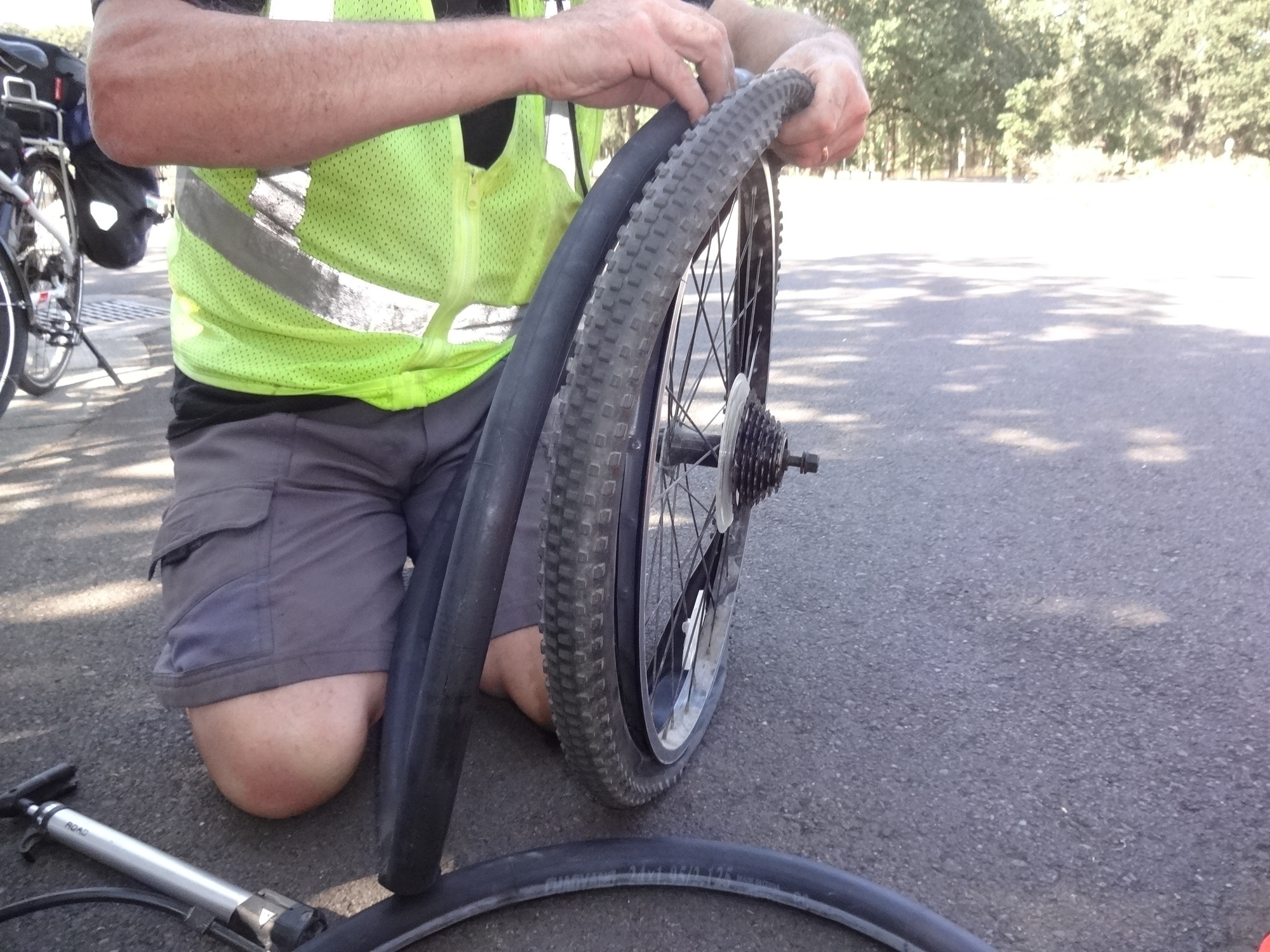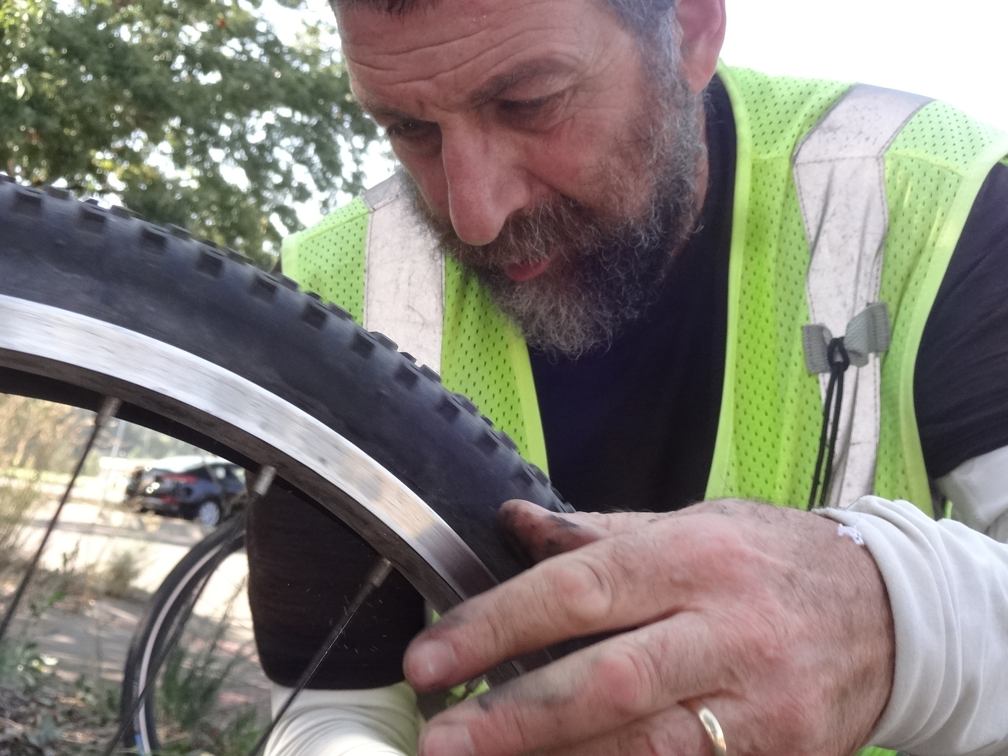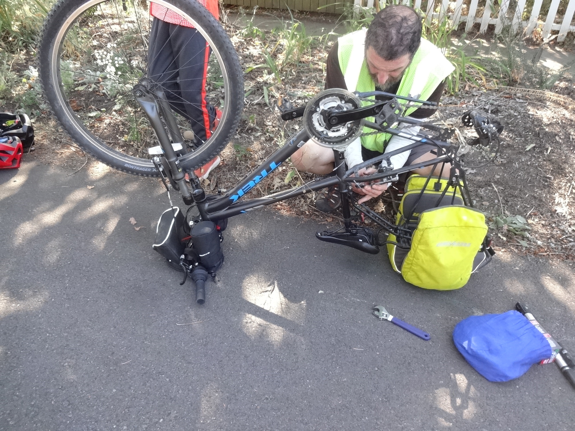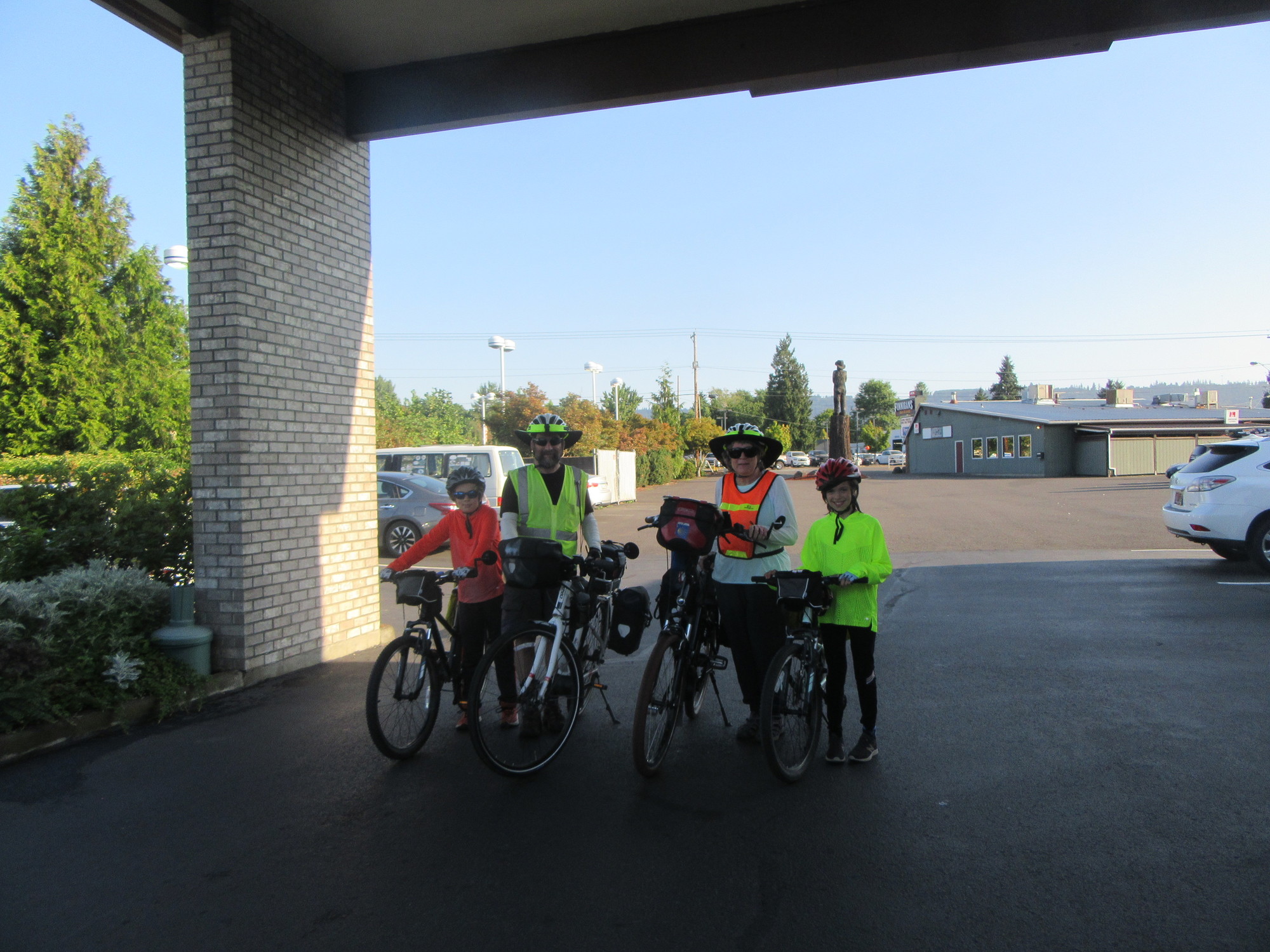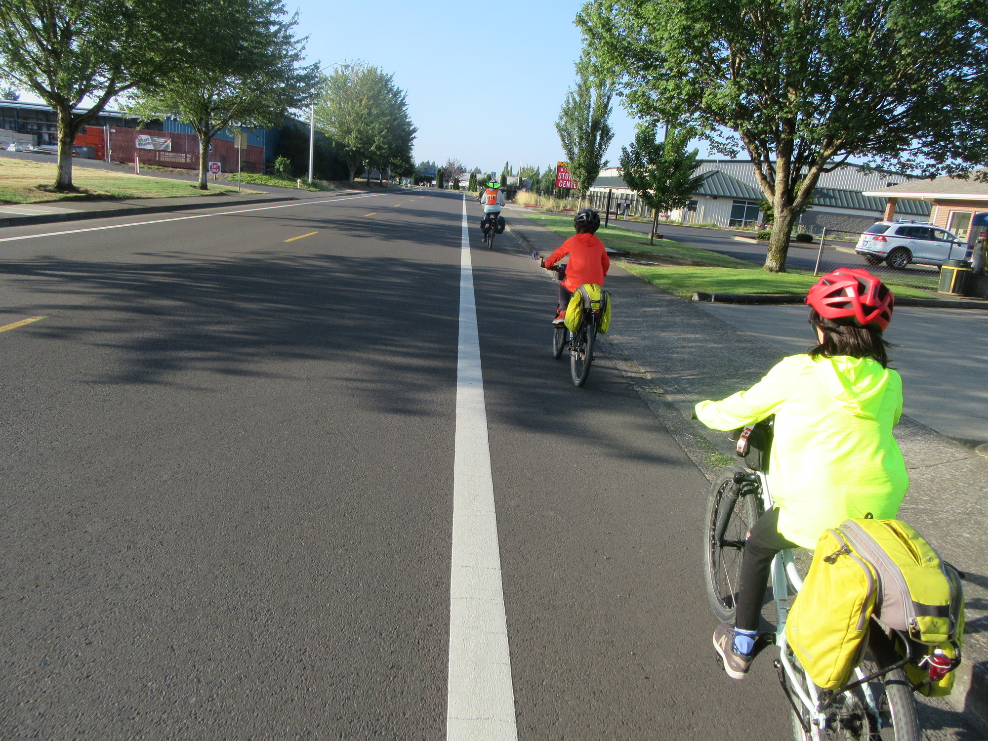 Once we were at Salem, we had to leave our Willamette track and make our way to the motel, which we had marked in the GPS, but without a route. Dodie just eyeballed the map and tried to choose good roads to get to the goal. About 2 km away what should happen but a flat in Avi's rear tire!