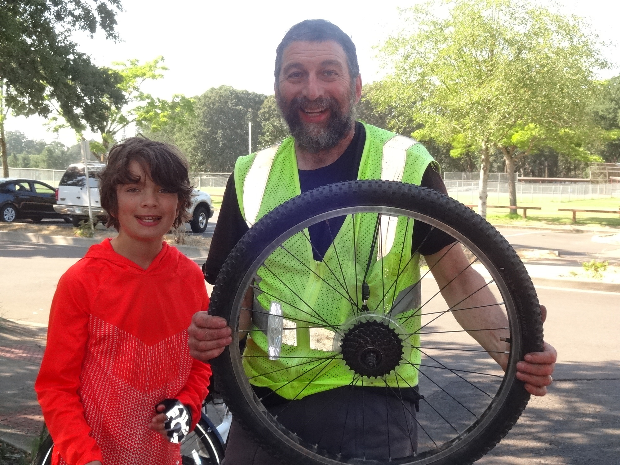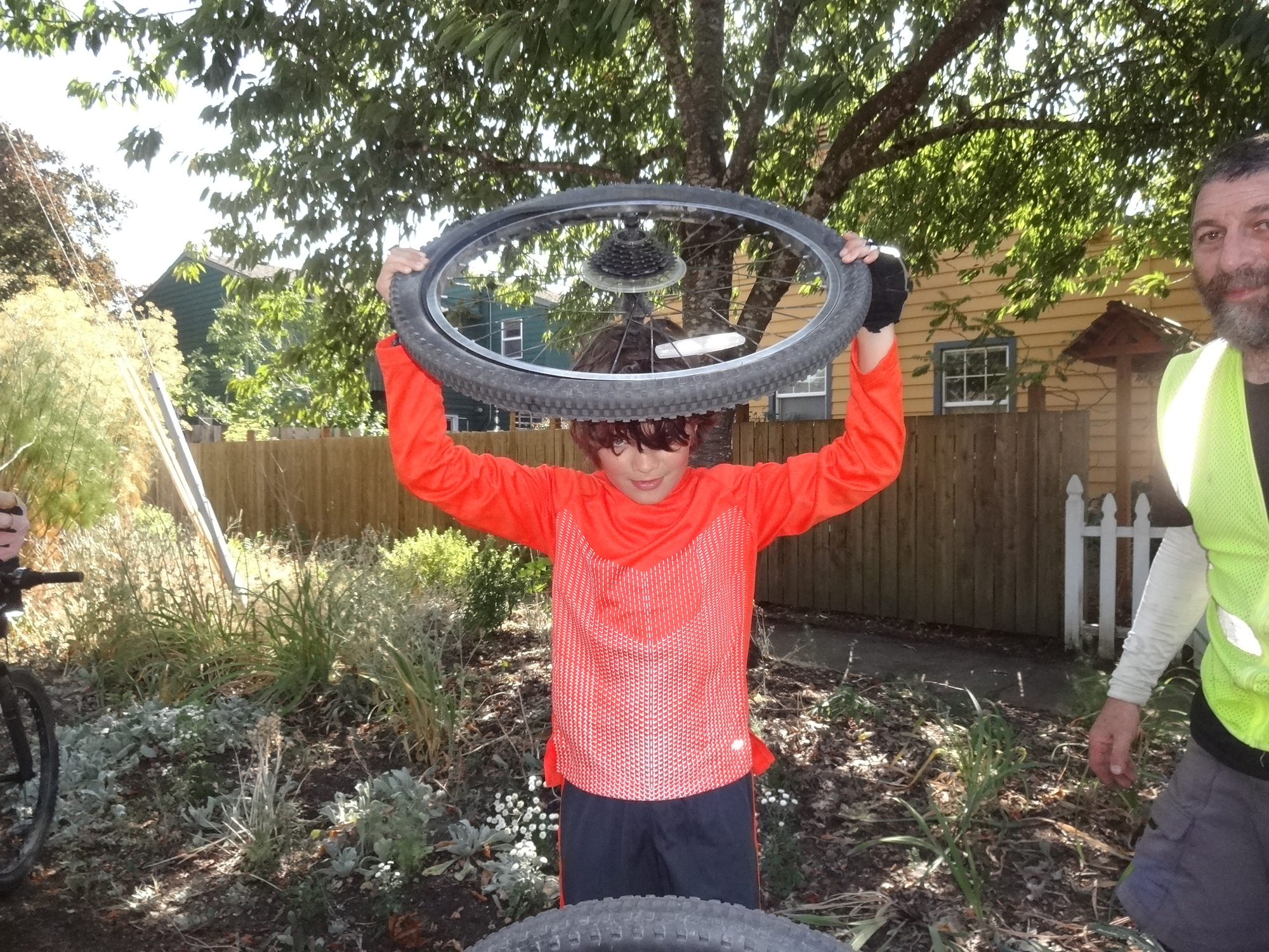 In the heat, and after a long day, a flat could be exasperating. But to the kids this was an adventure. They wanted to see what it was, how it was, and they wanted to follow or help with every step of the repair. Fortunately, at the last minute before leaving Seattle, we had woken up to the fact that would be travelling with 24" bikes, with nuts and not quick releases, and in an environment where flats were likely. We had quickly bolstered our repair capability with an adjustable wrench, patches, and a spare tube. So ha ha, this flat was just part of the fun, rather than any sort of real frustration. Violet was the main illustrator of the flat scene: