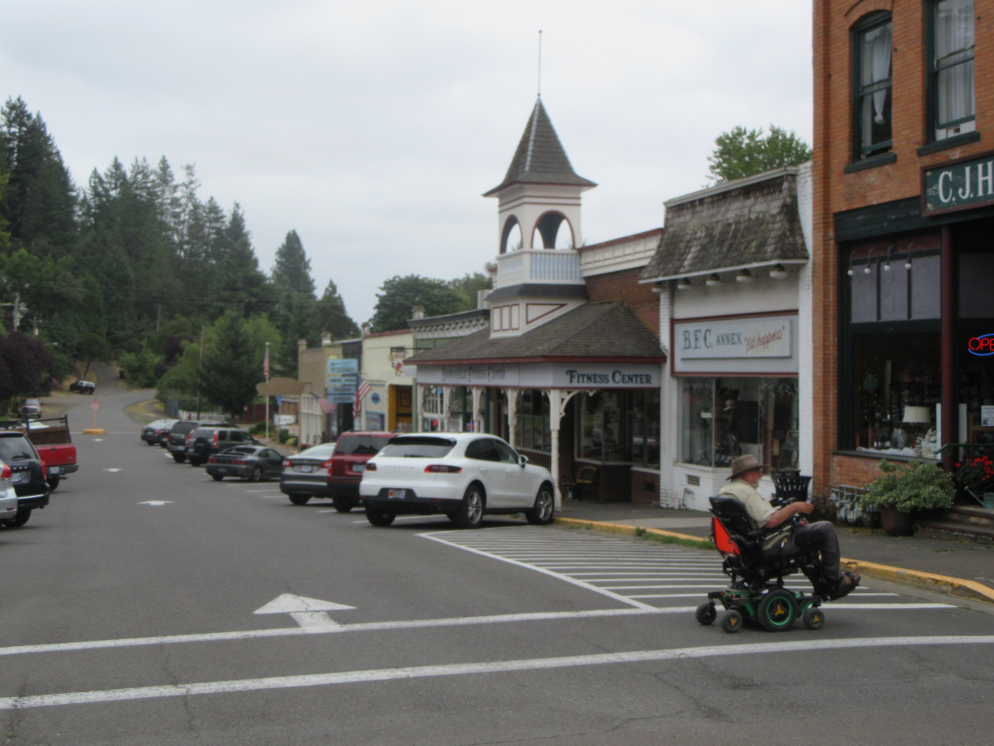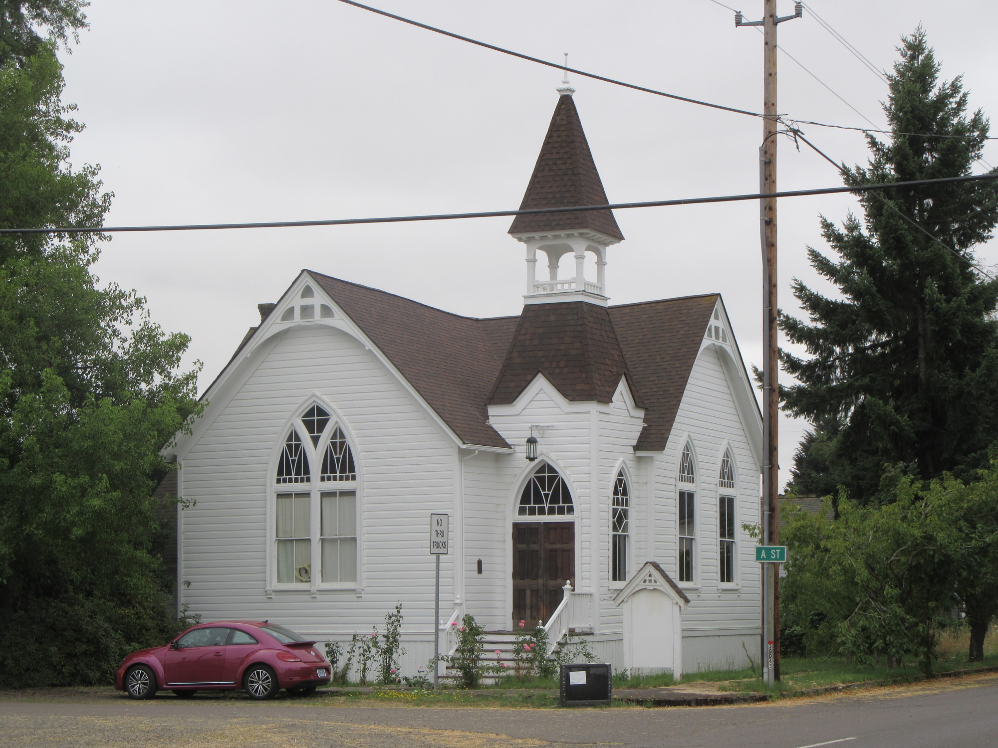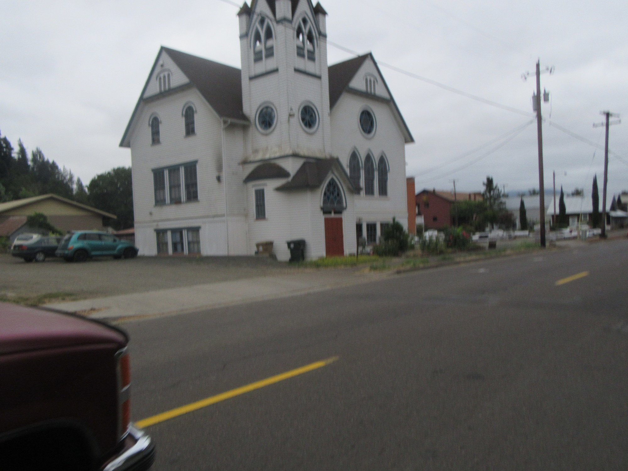 We had been eyeing Highway 99E, as the most direct route to where our motel would be. We hit it near the "town"? of Lafayette. At least there was a church there that made for a photo. We headed down 99E, and were feeling pretty smart, until the trucks seemed to multiply and the shoulder turned to gravel. We did an about face and retreated!