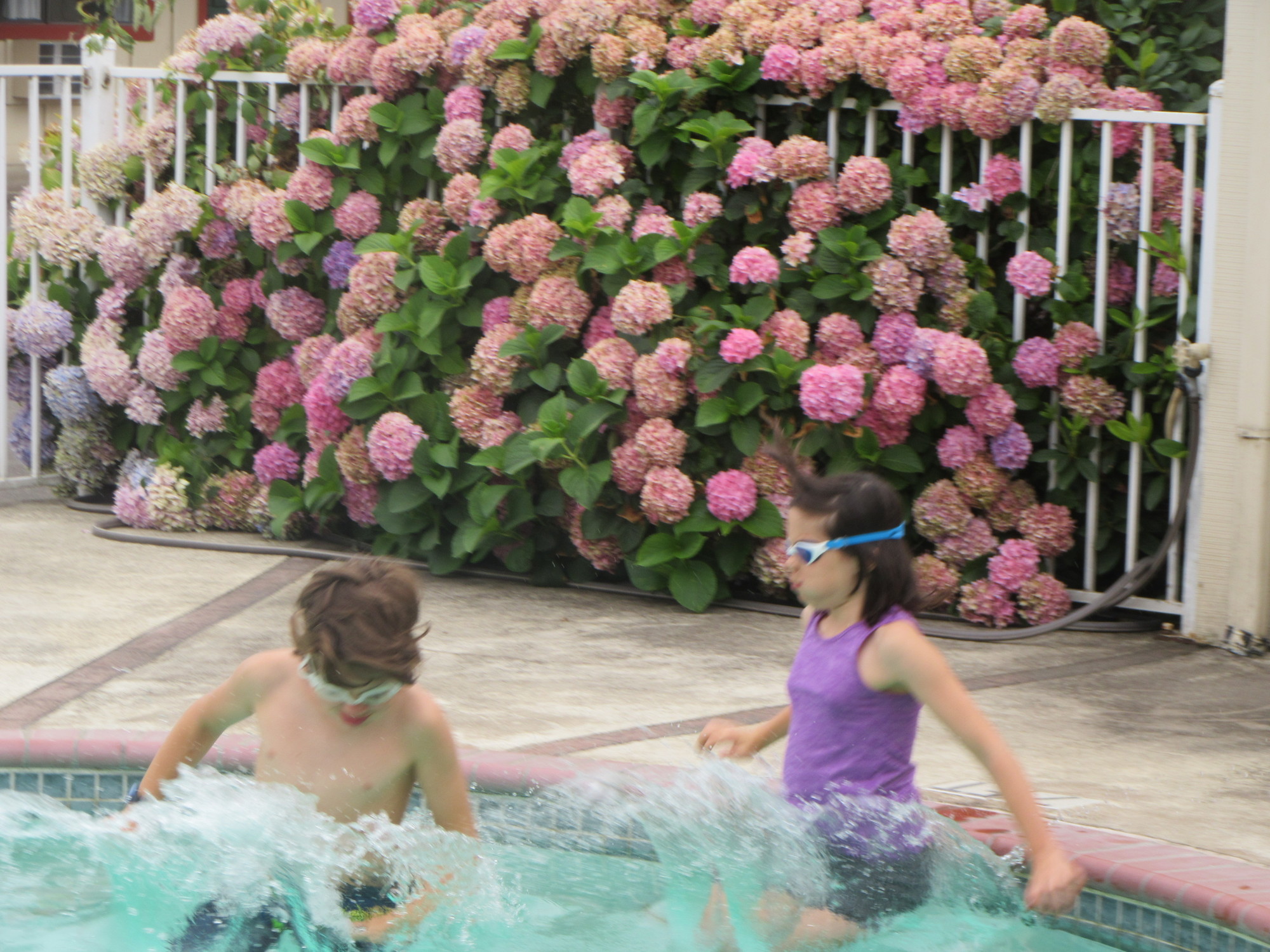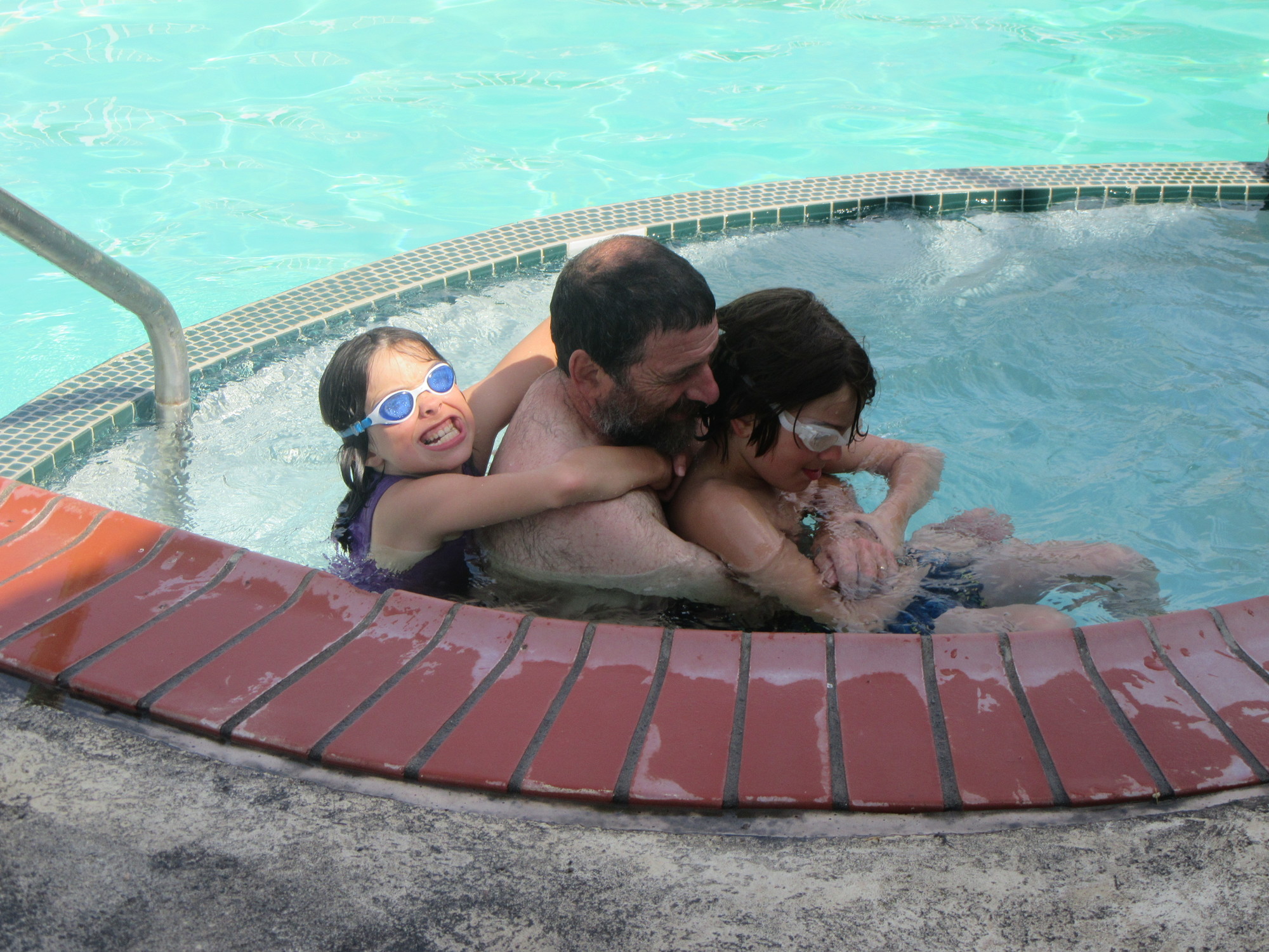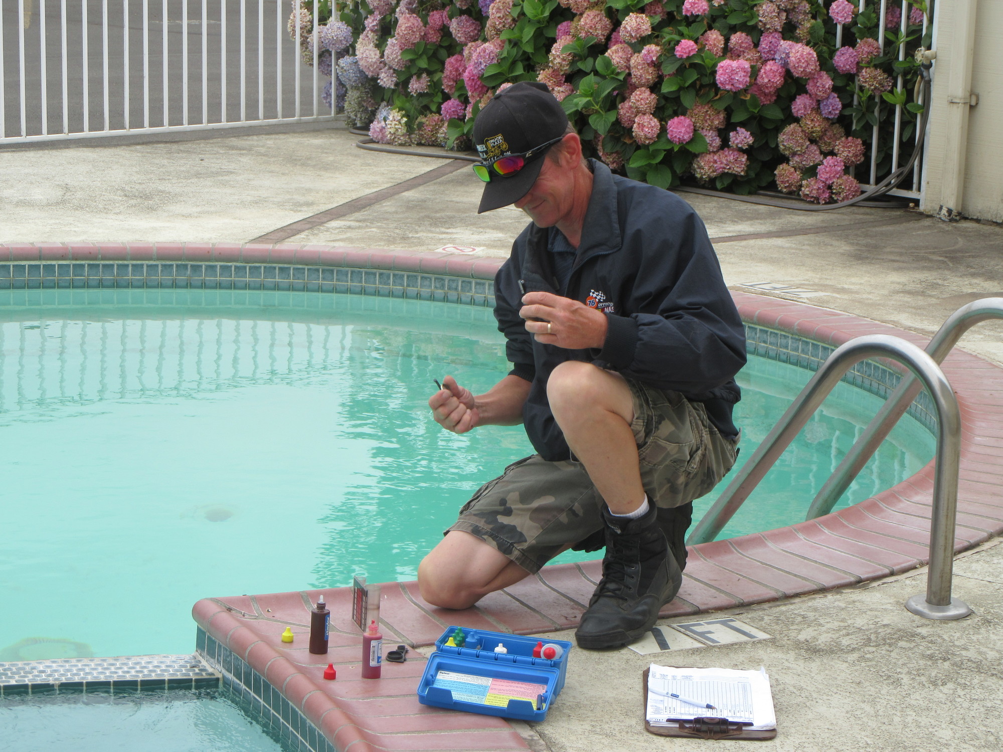 The front desk sent out "John" to see to the pool. His first step was to test the water in the main pool and the hot tub, and to adjust the ph balance in the hot tub. The kids, as always, were fascinated to watch the process, and encouraged John as he got on with his work.