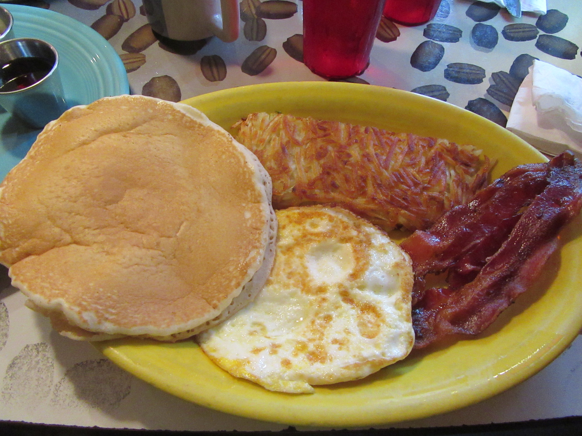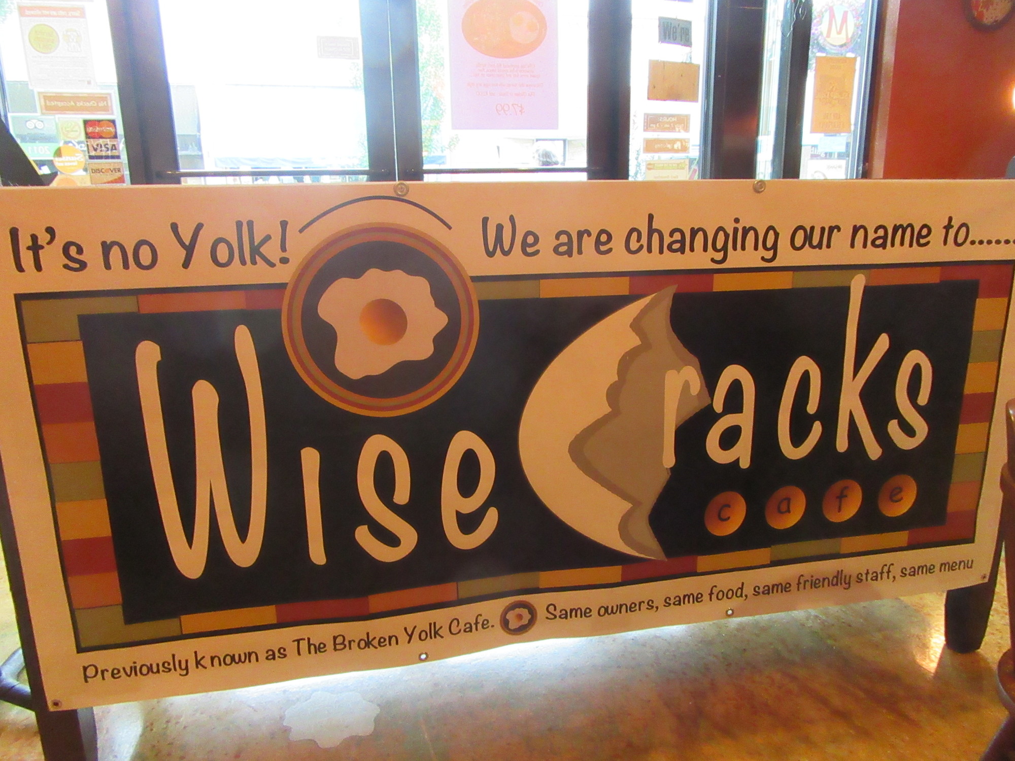 Working on recommendations from Andrea Brown and Scott Anderson, we bypassed not only the danish-in-cellophane breakfast offering at our Rodeway Inn, and McDonald's, and headed for the Broken Yolk. The Broken Yolk is in the process of renaming itself Wise Cracks, but it claims this is the only change. The number of clients in the restaurant was only moderate, but the kitchen had little staff. Consequently it took 40 minutes for our stuff to come. The quantity of what came was good and the cost very moderate. Quality was only normal. I did cry later about a lack of fruit, but Dodie sagely pointed out that that was an option I had bypassed, in favour of the oily hash browns I did get. Overall, Broken Yolk was a good move, giving us lots of power for a long day.