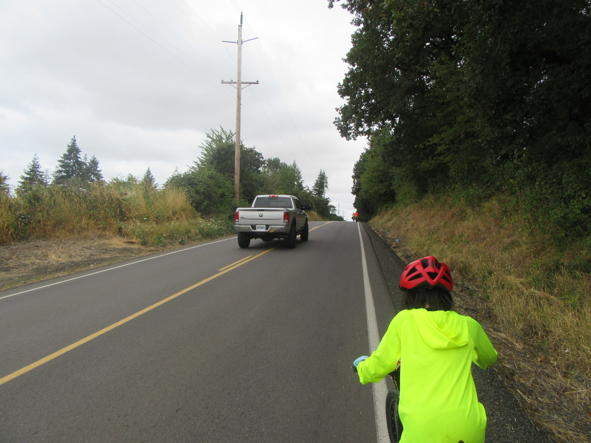 Before too long we were back to the regime of riding paved shoulder (or no shoulder) and being passed by cars often travelling at highway speed. However in every single case they gave enough clearance, and many slowed down and waited until it was safe to pass. It must be said, though, that those giving us the clearance were often taking it from oncoming traffic, and many gambled on blind corners or hills.