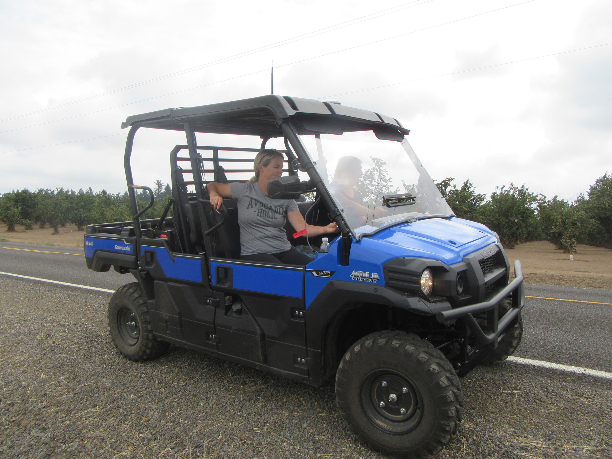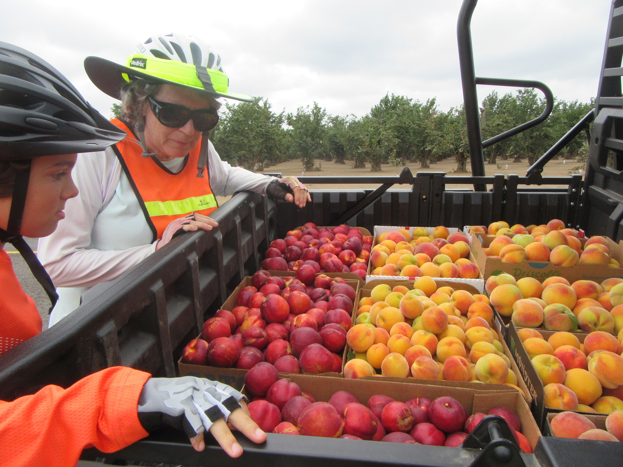 It was not the husband that arrived to say hi this time, but the actual wife and donkey enthusiast, with her sister-in-law, in a Kawasaki "Mule" ATV. The back of the ATV was loaded with peaches and nectarines that the two ladies had just picked on their farm. They offered us to take as many as we wanted, but it was really just one or two we could eat, since transporting ripe peaches is not a bicycle strong point.