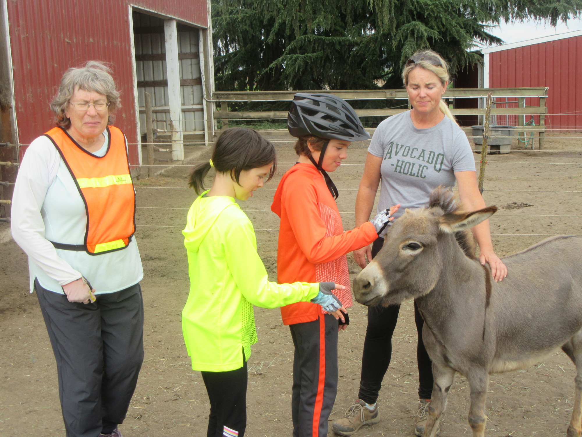 After the donkeys, we got the real sense that we had this ride nailed, with only about 30 km left to go. There turned out to be one more hurdle, though. The road from Champoeg to Newberg (Northeast St Paul Highway), the one with the final bridge over the Willamette, was just jammed with traffic. The road was generally four lane (two each direction) with a paved shoulder. But when the shoulder narrowed for an overpass or small bridge, and for the big bridge, we had to take one of the lanes. As before, the drivers were generally ok with this, but one shouted at us, and one tried to shove Dodie out of the lane. It added some excitement. We did not really need it though, having just met the exciting donkeys!