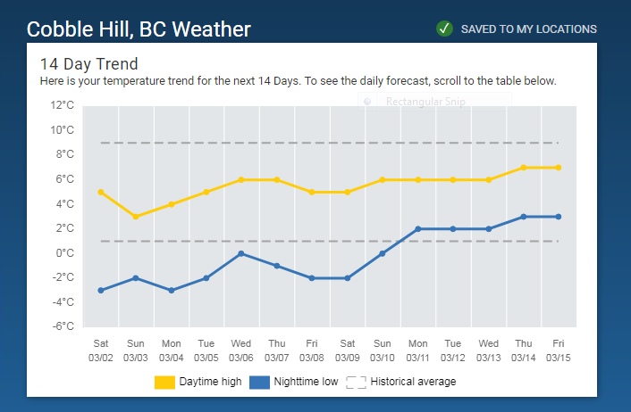 See the nighttime lows finally rising above zero and above the historical average? But when do they do this? Yes, March 11, the day we leave for frozen Montreal!