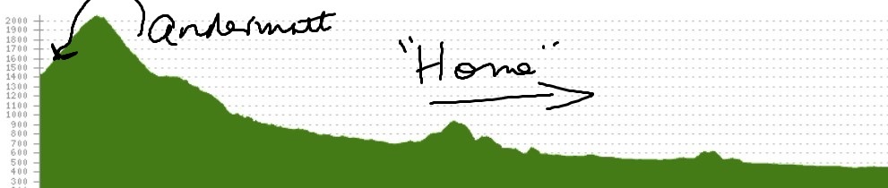 The Heidi-Maienfled adventure had another magical hook. Somewhere in my head, not far from the Heidi region (science has yet to actually localize these spots) lies Andermatt. This Swiss village has the distinction of being in the title of not one but two Bikeline books. That's because it's position in the mountains sets it as the source of two of the world's great rivers - the Rhein and the Rhone - each of course with its devoted bikeway. We have never quite been in Andermatt, though we have reached Goshenen, six kms south. So now maybe we would cycle over the Oberalp Pass once or twice, as a sort of side show on visiting Heidi? I think Dodie sensibly thought this was going a "bit too far" this time around, and with the available time. I could agree - the elevation profile looks like this: