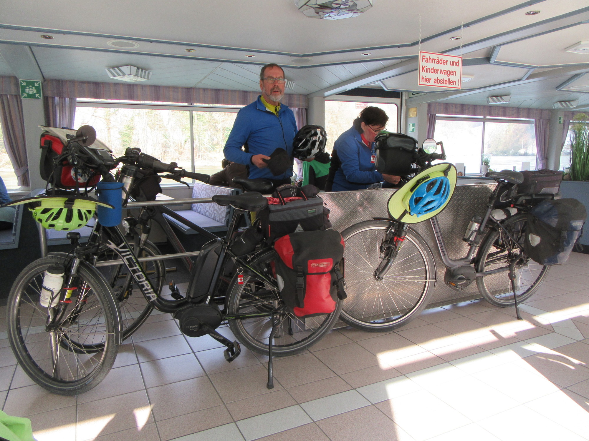 Soon we had the excitement of our boat coming around the corner, and the fun of watching it dock by coasting cleverly with the current. The boat was very elegant, with an onboard restaurant and eis cafe, to help the tourists survive the 30 minute ride. Of course, there was a special rail inside for our bikes.