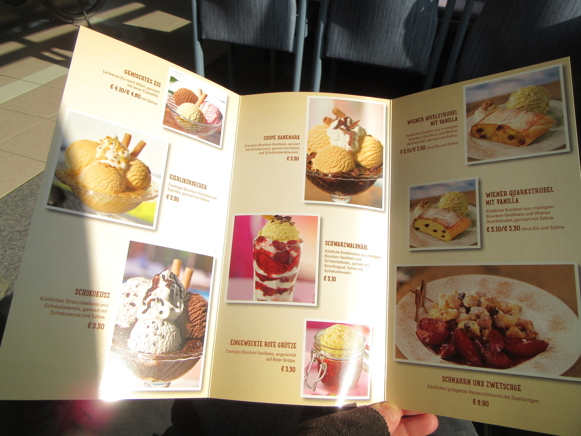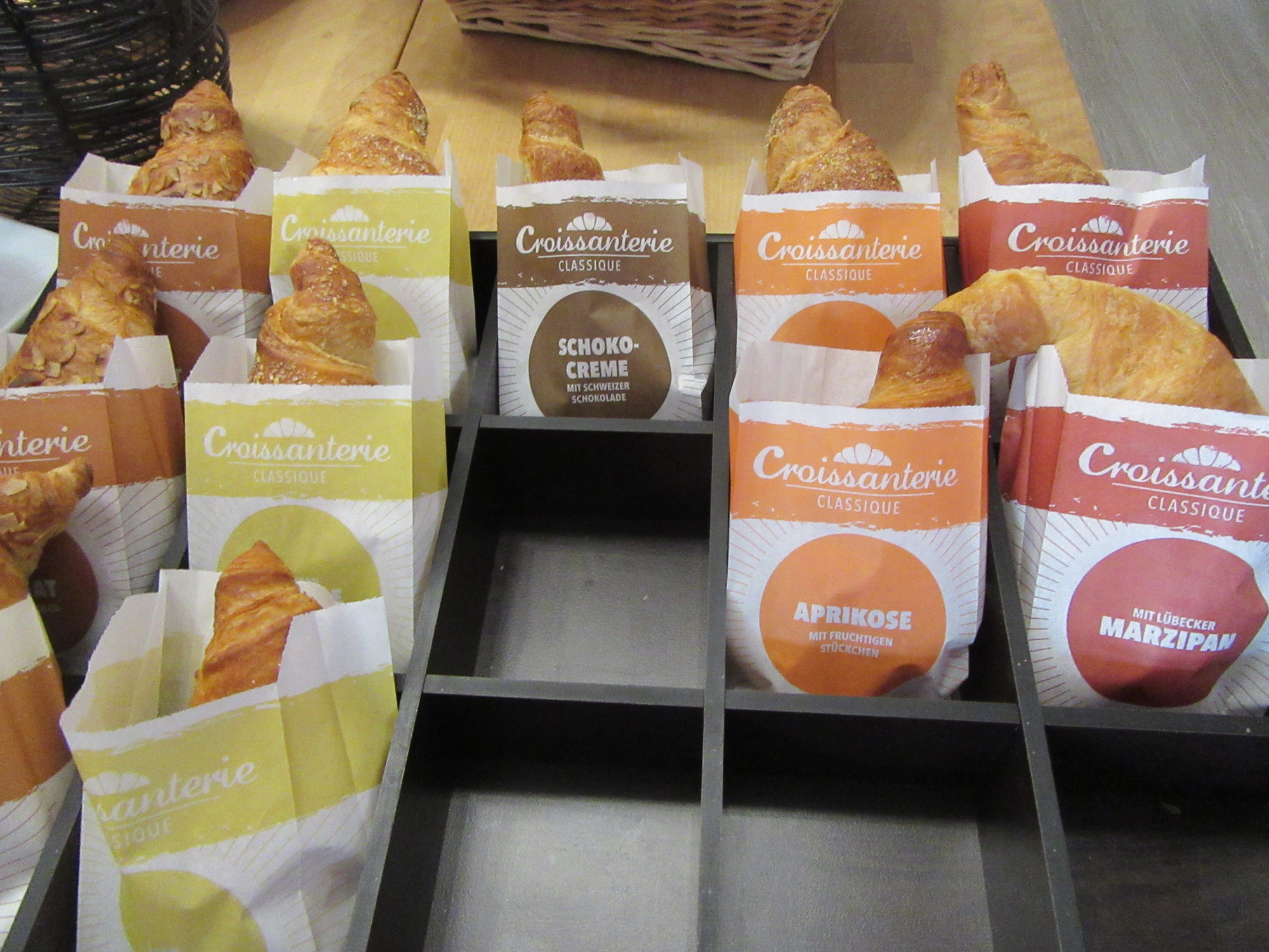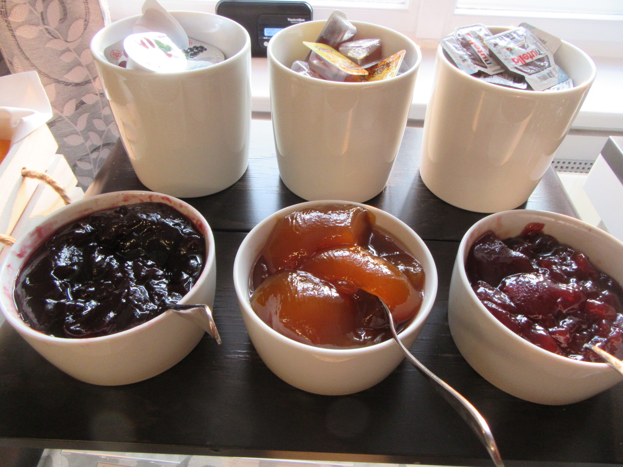 The luxury theme continued at breakfast. When you are stuck in some useless place (breakfast wise) like North America or France, the Ten Jammer standard seems very relevant and always unattainable. But lately we have seen places where Ten Jammer is just a baseline. What did the Rappensberger do to blow past the Ten Jam barrier? First, they put out the whole spread apparently just for us. Then they added to the Ten Jam basics some items not usually seen. That would be smoked white fish, and lax. Then there were five varieties of soft cheese, and many vegetable choices. The bread area featured croissants, sure, but these were in five flavours - marzipan, apricot, chocolate, and two others. Finally, there was a guests' newsletter, freshly printed with today's weather and the specials in the restaurant. And oh, about the jam, it was not only the flavours or quality, but the jars were very large. Dodie told me off for responding by ladling out too huge a gob!
