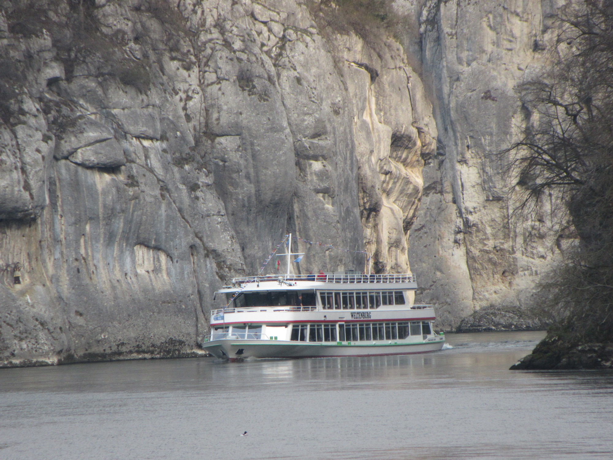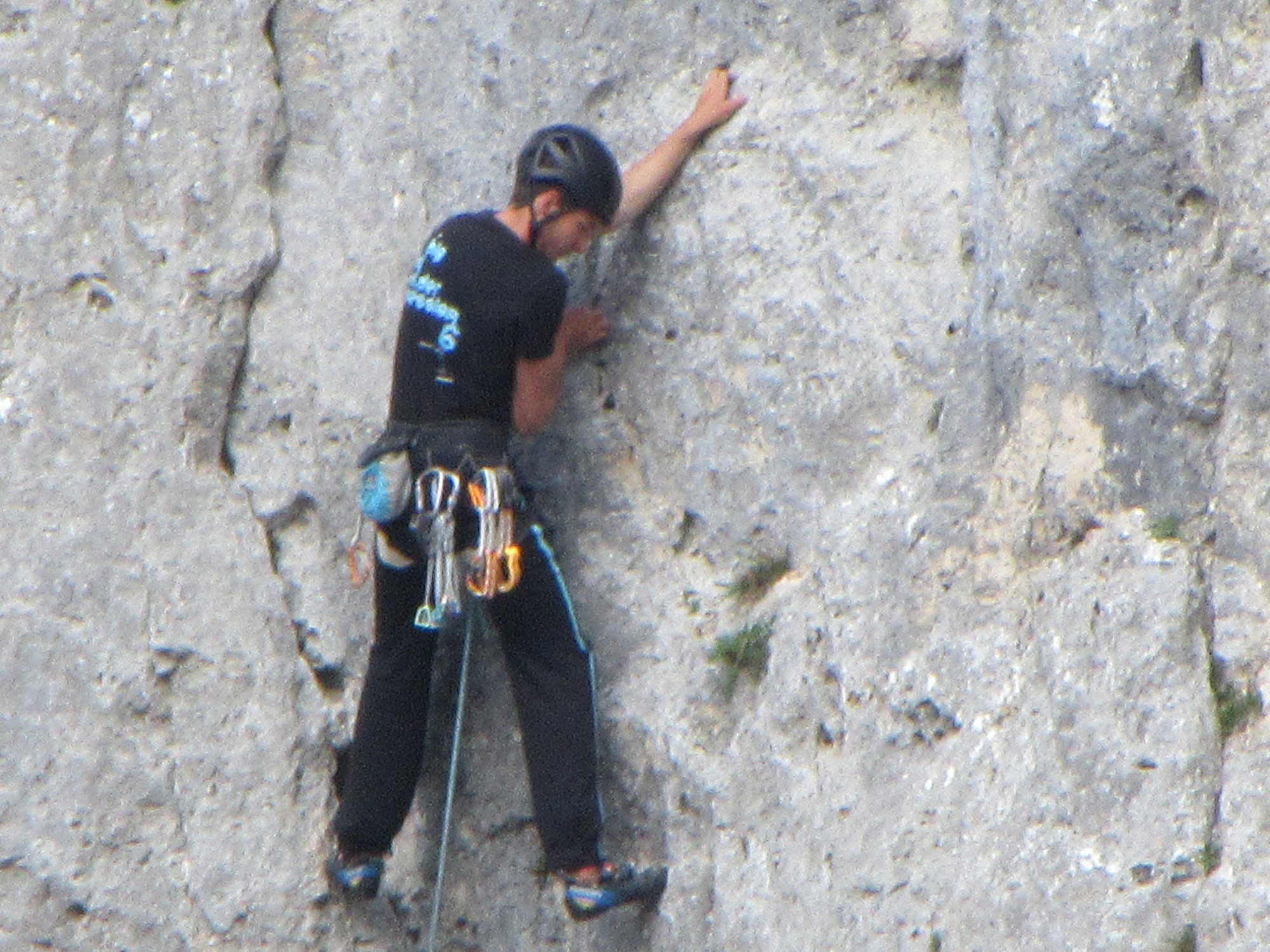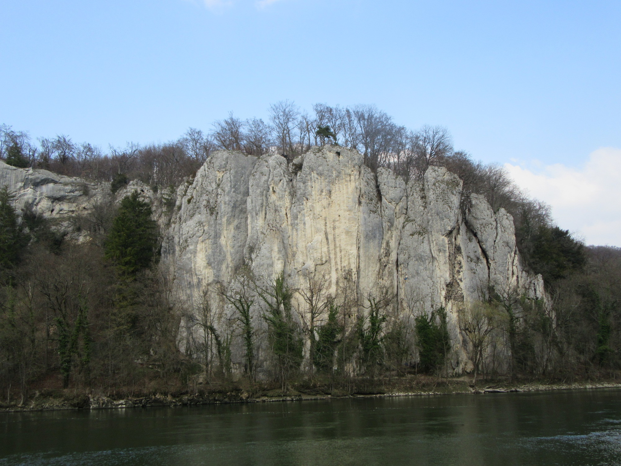 The Donau Gorge has interesting rock walls, and of course draws our attention because it bars our way. Across the river we noticed some boys who had another take on the rock - using it as something to climb. At a distance it seemed they might be free climbing, never a good idea. But the telephoto reveals lots of protection equipment.